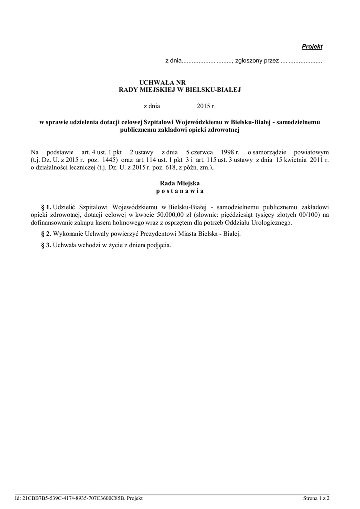 Projekt z dnia.............................., zgłoszony przez ......................... UCHWAŁA NR RADY MIEJSKIEJ W BIELSKU-BIAŁEJ z dnia 2015 r. w sprawie udzielenia dotacji celowej Szpitalowi Wojewódzkiemu w Bielsku-Białej - samodzielnemu publicznemu zakładowi opieki zdrowotnej Na podstawie art. 4 ust. 1 pkt 2 ustawy z dnia 5 czerwca 1998 r. o samorządzie powiatowym (t.j. Dz. U. z 2015 r. poz. 1445) oraz art. 114 ust. 1 pkt 3 i art. 115 ust. 3 ustawy z dnia 15 kwietnia 2011 r. o działalności leczniczej (t.j. Dz. U. z 2015 r. poz. 618, z późn. zm.), Rada Miejska postanawia § 1. Udzielić Szpitalowi Wojewódzkiemu w Bielsku-Białej - samodzielnemu publicznemu zakładowi opieki zdrowotnej, dotacji celowej w kwocie 50.000,00 zł (słownie: pięćdziesiąt tysięcy złotych 00/100) na dofinansowanie zakupu lasera holmowego wraz z osprzętem dla potrzeb Oddziału Urologicznego. § 2. Wykonanie Uchwały powierzyć Prezydentowi Miasta Bielska - Białej. § 3. Uchwała wchodzi w życie z dniem podjęcia. Id: 21CBB7B5-539C-4174-8935-707C3600C85B. Projekt Strona 1 z 2 Uzasadnienie do projektu uchwały Rady Miejskiej w Bielsku-Białej w sprawie udzielenia dotacji celowej Szpitalowi Wojewódzkiemu w Bielsku-Białej – samodzielnemu publicznemu zakładowi opieki zdrowotnej. Zgodnie z ustawą z dnia 15 kwietnia 2011 r. o działalności leczniczej (t.j. Dz.U. z 2015 r. poz. 618, z późn. zm.), samodzielny publiczny zakład opieki zdrowotnej może otrzymywać dotacje m.in. na inwestycje, w tym na zakup aparatury i sprzętu medycznego. Szpital Wojewódzki w Bielsku-Białej zwrócił się z prośbą o dofinansowanie zakupu lasera holmowego wraz z osprzętem dla potrzeb Oddziału Urologicznego. Orientacyjny koszt zakupu to kwota 290.000 zł. Pomoc finansową w zakupie lasera holmowego zadeklarowali: Starosta Bielski, Burmistrz Żywca, Wójtowie Gmin Powiatu Żywieckiego, Fundacja prof. Hofstettera, a także Zarząd Województwa Śląskiego. Oddział Urologiczny Szpitala Wojewódzkiego w Bielsku-Białej jest jedynym w południowo – wschodniej części województwa śląskiego dobrze wyposażonym i przygotowanym do świadczenia usług na wysokim poziomie przede wszystkim pacjentom z naszego regionu (najbliższe oddziały urologii tak przygotowane znajdują się w Katowicach i Krakowie). Zakup lasera holmowego skróci okres pobytu chorego w szpitalu i spowoduje podwyższenie jakości świadczonych usług. W związku z powyższym proponuje się udzielenie Szpitalowi Wojewódzkiemu w Bielsku-Białej dotacji, celem dokonania przedmiotowego zakupu. Id: 21CBB7B5-539C-4174-8935-707C3600C85B. Projekt Strona 2 z 2