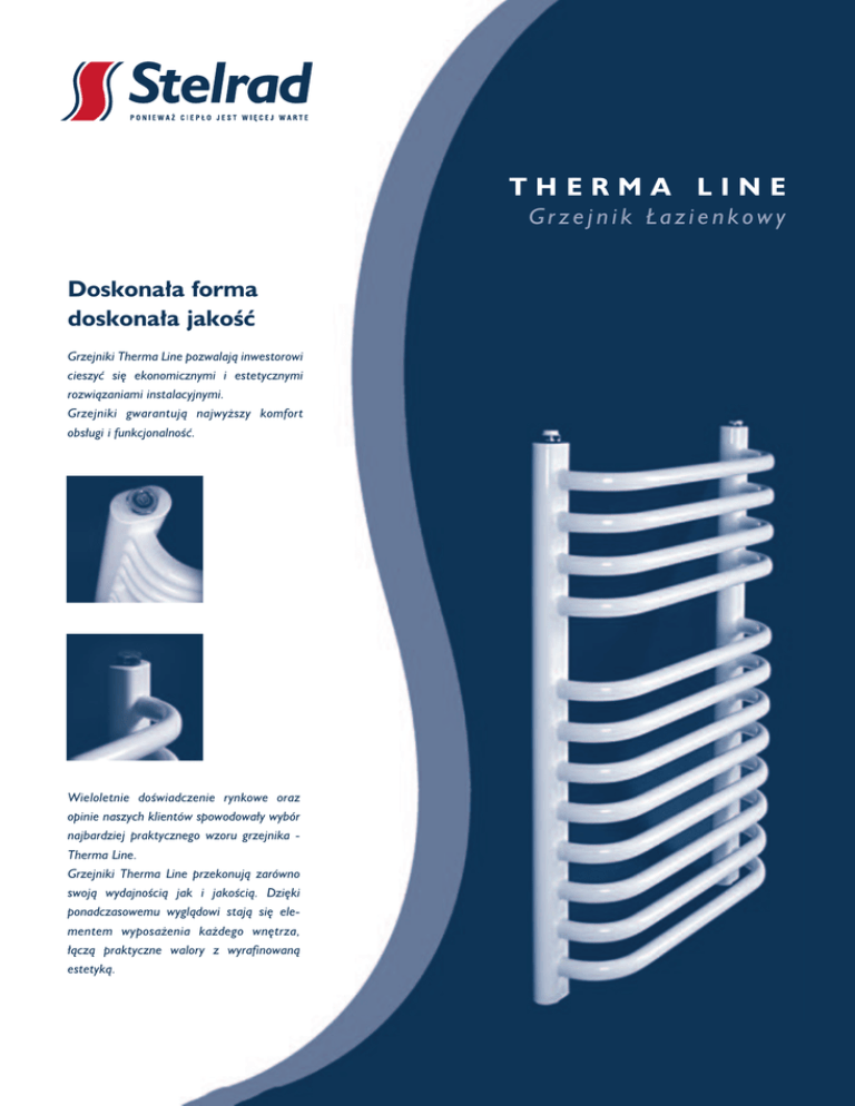 THERMA LINE Grzejnik ¸azienkowy Doskona∏a forma doskona∏a jakoÊç Grzejniki Therma Line pozwalajà inwestorowi cieszyç si´ ekonomicznymi i estetycznymi rozwiàzaniami instalacyjnymi. Grzejniki gwarantujà najwy˝szy komfort obs∏ugi i funkcjonalnoÊç. Wieloletnie doÊwiadczenie rynkowe oraz opinie naszych klientów spowodowa∏y wybór najbardziej praktycznego wzoru grzejnika Therma Line. Grzejniki Therma Line przekonujà zarówno swojà wydajnoÊcià jak i jakoÊcià. Dzi´ki ponadczasowemu wyglàdowi stajà si´ elementem wyposa˝enia ka˝dego wn´trza, ∏àczà praktyczne walory z wyrafinowanà estetykà. Parametry techniczne zestawienie typów 128,5 - 135,5 typ i symbol Therma line H R L 28 - 35 43 - 50 TL TL TL TL TL TL TL TL TL TL TL TL TL TL 40/80 40/100 40/120 40/140 50/50 50/80 50/100 50/120 50/140 60/50 60/70 60/100 60/120 60/140 wysokoÊç H (mm) szerokoÊç L (mm) rozstaw przy∏àczy R (mm) 700 940 1200 1400 480 700 940 1200 1400 480 700 940 1200 1400 450 450 450 450 550 550 550 550 550 650 650 650 650 650 400 400 400 400 500 500 500 500 500 600 600 600 600 600 pojemnoÊç moc moc wody cieplna (W) cieplna (W) (l) 90/70 75/65 2,7 3,8 5,2 6,0 2,3 3,3 4,7 5,9 7,0 2,4 3,6 4,8 6,5 7,6 410 545 682 807 320 468 620 776 920 358 526 696 871 1035 cena netto (z∏) 327 436 546 647 255 374 496 622 738 286 421 558 699 831 - Moc grzejników podana jest dla parametrów cieplnych wody, zasilania i powrotu 90/70/20 0C, 75/65/20 0C - CiÊnienie robocze 0,6 MPa - CiÊnienie próbne 0,9 MPa - Maksymalna temperatura wody 95 0C - Grzejniki wykonane sà z rur i profili stalowych najwy˝szej jakoÊci - Grzejniki sà fosforanowane w celu zwi´kszenia odpornoÊci na korozj´ a nast´pnie lakierowane proszkowo w kolorze bia∏ym Wyposa˝enie grzejnika - ZaÊlepki - Odpowietrznik manualny 1/2’ - Uchwyt do mocowania z mo˝liwoÊcià regulowania grzejnika od Êciany w zakresie 7 mm Pod∏àczanie - Cztery króçce przy∏àczeniowe 1/2’ Opakowanie - Karton - Folia ochronna Produkcja jest zgodna z europejskimi normami: PN-EN 442-1; 1999 Grzejniki: wymagania i warunki techniczne, PN-EN 442-2; 1999 Grzejniki: moc cieplna i metody badaƒ. Gwarancja na szczelnoÊç i pow∏ok´ lakierniczà 5 lat. Wyposa˝enie dodatkowe - grza∏ki elektryczne - komfort przez ca∏y rok Grza∏ka elektryczna umo˝liwia prac´ grzejnika tak˝e poza sezonem grzewczym. Zastosowanie trójnika pozwala na jednoczesne pod∏àczenie grzejnika do grza∏ki elektrycznej jak i do instalacji c.o. G∏owice i zawory termostatyczne - informacje w ulotce “Armatura i akcesoria Stelrad” ThermStelr 1/2005 Caradon Rymax Polska ul. Bartników 10 30-798 Kraków Tel: (12) 657 54 07 dzia∏ sprzeda˝y: Tel: (12) 2900300 Fax: (12) 2900301 www.stelrad.pl