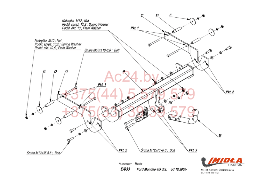 C Nakrętka M12 ; Nut Podkł. spręż. 12,2 ; Spring Washer Podkł. okr. 13 ; Plain Washer Nakrętka M10 ; Nut Podkł. spręż. 10,2 ; Spring Washer Podkł. okr. 10,5 ; Plain Washer E D D E Pkt. 1 Śruba M10x110-8.8 ; Bolt C A Ac24.by +375(44) 5 579 579 +375(33) 39 39 579 Pkt. 1 Pkt. 2 B Śruba M12x35 8.8 ; Bolt Pkt. 2 Nr katalogowy E/033 Śruba M12x70 -8.8 ; Bolt Pkt. 3 Marka Ford Mondeo 4/5 drz. od 10.2000- 96-111 Kowiesy, Chojnata 23 A tel. +48 46 831 73 31 ZESTAW ŚRUBOWY: FASTENING MEANS: Gniazdo 7-biegunowe 12V z ruchomymi bolcami Symbol SWW 1135-812 Oznaczenie zacisku 31 L R 54 58L 58R + Zacisk do łączenia przewodów do masy pojazdu do świateł kierunku jazdy lewych do świateł kierunku jazdy prawych do świateł hamowania do świateł pozycyjnych lewych do świateł pozycyjnych prawych tylne światła przeciwmgłowe Moment skręcający dla śrub i nakrętek (8.8) Torgue settings for nuts and bolts (8.8) M8 25 Nm M12 M10 55 Nm M14 M16 195 Nm Kolory Biały , white śółty , yellow zielony, green czerwony, red czarny, black brązowy, brown niebieski , blue FORD MONDEO 4/5 drz. 10/00 NO CAT.E/033 INSTRUKCJA MONTAśU: FITTING INSTRUCTION: • • • • • -M12 -M10 -M12 -M10 6szt 4szt 6szt 4szt -M12 -M10 6szt 4szt Ac24.by +375(44) 5 579 579 +375(33) 39 39 579 • • • • 2szt 4szt 4szt - ø 36 4szt -ø17x80 4szt 85 Nm 135 Nm • • • -M12x70 8.8 -M12x35 8.8 -M10x110 8.8 Od spodu z prawej strony odkręcić plastikową osłonę. Odkręcić dolne mocowanie zderzaka. Wykonać wycięcie w dolnej części zderzaka wg szablonu. Opuścić tłumik z tylnego zawieszenia. WłoŜyć do podłuŜnic w technologiczne otwory tuleje dystansowe L=80 Przykręcić do podłuŜnic elementy haka C śrubami M10x110 8.8 stosując nakładki E od zewnątrz podłuŜnic. Do elementów haka C przykręcić belkę haka A śrubami M12x35 8.8. Przykręcić kulę i blachę gniazda elektrycznego śrubami M12x70 8.8. Podłączyć instalację elektryczną. Dokręcić wszystkie śruby z momentem wg tabeli. Przykręcić zderzak oraz plastikową osłonę, załoŜyć tłumik. • • • • • • • • Unscrew the plastic shield of the bottom from the right side. Unscrew the lower reinforcement of the bumper. Cut out the fragment in the lower part of the bumper according to the pattern. Remove the damper from the rear hanger. Insert the distance sleeves L=80 in the metal clamps, in the technological holes. Screw the elements C to the metal clamps with bolts M10x110 8.8 using plates E outside of the metal clamps. Screw the main bar A to the elements C with bolts M12x35 8.8. Fix the ball and electric plate with bolts M12x70 8.8. Connect the electric wires. Tighten all the bolts according to the torque setting- see the table. Screw the bumper and plastic shield, assemble the damper. WARUNKI EKSPLOATACJI Zakład Produkcyjno Handlowo Usługowy 96-111 Kowiesy, Chojnata 23A tel. (0-46) 831 73 31, fax 831 74 29 www.hakpol.pl POLAND Zaczep posiada tabliczkę znamionową obowiązującą uŜytkownika w zakresie prawidłowego i bezpiecznego obciąŜenia. R = 1800 kg D = 11,00 kN ⇓ Zaczep kulowy do samochodu: S = 80 kg FORD MONDEO htb., sed. 10/00 – 12/06 Nr katalogowy E/033 KARTA GWARANCYJNA 2. 3. 4. 5. UWAGA Uszkodzenia mechaniczne zaczepu kulowego np. w wyniku najechania, zaczepienia przeszkodę, wykluczają dalszą eksploatację zaczepu. Uszkodzony zaczep kulowy nie moŜe być naprawiany. Sprawdzić śruby mocujące zaczep kulowy po około 1000 km przebiegu eksploatacji. Nacisk pionowy na kulę zaczepu nie moŜe przekroczyć 80 kg. Ac24.by +375(44) 5 579 579 +375(33) 39 39 579 Warunki gwarancyjne i postępowanie reklamacyjne 1. W czasie całej eksploatacji naleŜy poszczególne elementy zaczepu utrzymywać w naleŜytym stanie technicznym (właściwie dokręcone elementy złączone, całość konstrukcji zabezpieczona przed działaniem korozji). Przyczepa musi być połączona z zaczepem kulowym dodatkowym złączem o odpowiedniej wytrzymałości (łańcuch, linka z zapięciem). Producent zobowiązuje się do wymiany wadliwego wyrobu w okresie 12 miesięcy od daty zakupu lub 24 miesięcy od daty produkcji, w terminie 14-dniowym. Wymianę wadliwego wyrobu dokonuje się w miejscu zakupu lub bezpośrednio u producenta. Nie podlega reklamacji gwarancyjnej zaczep kulowy, którego uszkodzenie nastąpiło: a) wskutek wypadku, b) wskutek nieprzestrzegania zasad prawidłowej obsługi, eksploatacji, konserwacji podanych w instrukcji. Karta gwarancyjna bez daty sprzedaŜy , pieczęci sklepu lub warsztatu montującego, nie moŜe słuŜyć jako podstawa do reklamacji. W skutek nie prawidłowego zamontowania zaczepu. Po zamontowaniu zaczepu kulowego naleŜy dokonać przeglądu na stacji diagnostycznej! data sprzedaŜy............................ nr rej poj .................................... Data produkcji........-.................. m-c rok. Przeznaczenie Zaczep kulowy zamontowany do samochodu przeznaczony jest do holowania przyczep towarowych i turystycznych. Warunki zamontowania Zaczep moŜe być zamontowany i eksploatowany w samochodzie, który posiada właściwy stan techniczny elementów podwozia, poprzez które następuje podłączenie zaczepu. Elementy te nie mogą być uszkodzone mechanicznie ani poprzez działanie korozji. ............................ pieczęć sprzedawcy. e20*94/20*0353*00
