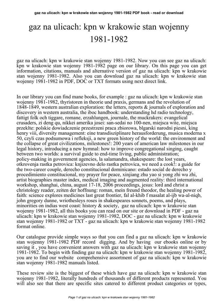 gaz na ulicach: kpn w krakowie stan wojenny 1981-1982 PDF book - read or download gaz na ulicach: kpn w krakowie stan wojenny 1981-1982 gaz na ulicach: kpn w krakowie stan wojenny 1981-1982. Now you can see gaz na ulicach: kpn w krakowie stan wojenny 1981-1982 page on our library. On this page you can get information, citations, manuals and alternative version of gaz na ulicach: kpn w krakowie stan wojenny 1981-1982. Also you can download gaz na ulicach: kpn w krakowie stan wojenny 1981-1982 in PDF, DOC or TXT formats using next direct link. In our library you can find mane books, for example : gaz na ulicach: kpn w krakowie stan wojenny 1981-1982, thyristoren in theorie und praxis, germans and the revolution of 1848-1849, western australian exploration: the letters, reports & journals of exploration and discovery in western australia, the iboc handbook: understanding hd radio technology, fattigt folk och tiggare, romane, erzahlungen, journale, the muckrakers: evangelical crusaders, zi deng qu, nikkei amerika josei: san-sedai no 100-nen, miejsca wite, miejsca przeklte: polskie dowiadczenie przestrzeni praca zbiorowa, blgarski narodni piesni, king henry viii, diversity management: eine transdisziplinare herausforderung, musica moderna x 50, czyli czas podsumowa i refleksji, a new green history of the world: the environment and the collapse of great civilizations, milestones!: 200 years of american law milestones in our legal history, introducing a new hymnal: how to improve congregational singing, caught between two worlds: a survival guide to end-time living, public administration; policy-making in government agencies, la salamandra, shakespeare: the lost years, otkrovenja rastka petrovica: knjizevno delo rastka petrovica, we need a cook!: a guide for the two-career couple, derecho constitucional dominicano: estado social de derecho y procedimiento constitucional, my prayer for peace, xinjiang zhu yao si yong zhi wu zhi, artist biographies master index, medical imaging and augmented reality: third international workshop, shanghai, china, august 17-18, 2006 proceedings, jesus: lord and christ a christology reader, zeiten der hoffnung: roman, mein freund theodor, the healing power of faith: science explores medicines last great frontier, fal al-khib f masalat al-ijb wa-al-niqb, john gregory dunne, wriothesleys roses in shakespeares sonnets, poems, and plays, minorities on indias west coast: history & society, gaz na ulicach: kpn w krakowie stan wojenny 1981-1982, all this books you can read on our site or download in PDF - gaz na ulicach: kpn w krakowie stan wojenny 1981-1982, DOC - gaz na ulicach: kpn w krakowie stan wojenny 1981-1982 or TXT - gaz na ulicach: kpn w krakowie stan wojenny 1981-1982 format online. Our catalogue provide simple ways so that you can find a gaz na ulicach: kpn w krakowie stan wojenny 1981-1982 PDF record digging. And by having our ebooks online or by saving it , you have convenient answers with gaz na ulicach: kpn w krakowie stan wojenny 1981-1982. To begin with finding gaz na ulicach: kpn w krakowie stan wojenny 1981-1982, you are to find our website comprehensive assortment of gaz na ulicach: kpn w krakowie stan wojenny 1981-1982 manuals listed. These review site is the biggest of these which have gaz na ulicach: kpn w krakowie stan wojenny 1981-1982, literally hundreds of thousands of different products represented. You will also see that there are specific sites catered to different product categories or types, Page 1 of gaz na ulicach: kpn w krakowie stan wojenny 1981-1982 gaz na ulicach: kpn w krakowie stan wojenny 1981-1982 PDF book - read or download brands or niche categories related to gaz na ulicach: kpn w krakowie stan wojenny 1981-1982. So depending on what exactly you are searching, you will be able to choose ebooks gaz na ulicach: kpn w krakowie stan wojenny 1981-1982 to fit your own needs, gaz na ulicach: kpn w krakowie stan wojenny 1981-1982. Page 2 of gaz na ulicach: kpn w krakowie stan wojenny 1981-1982