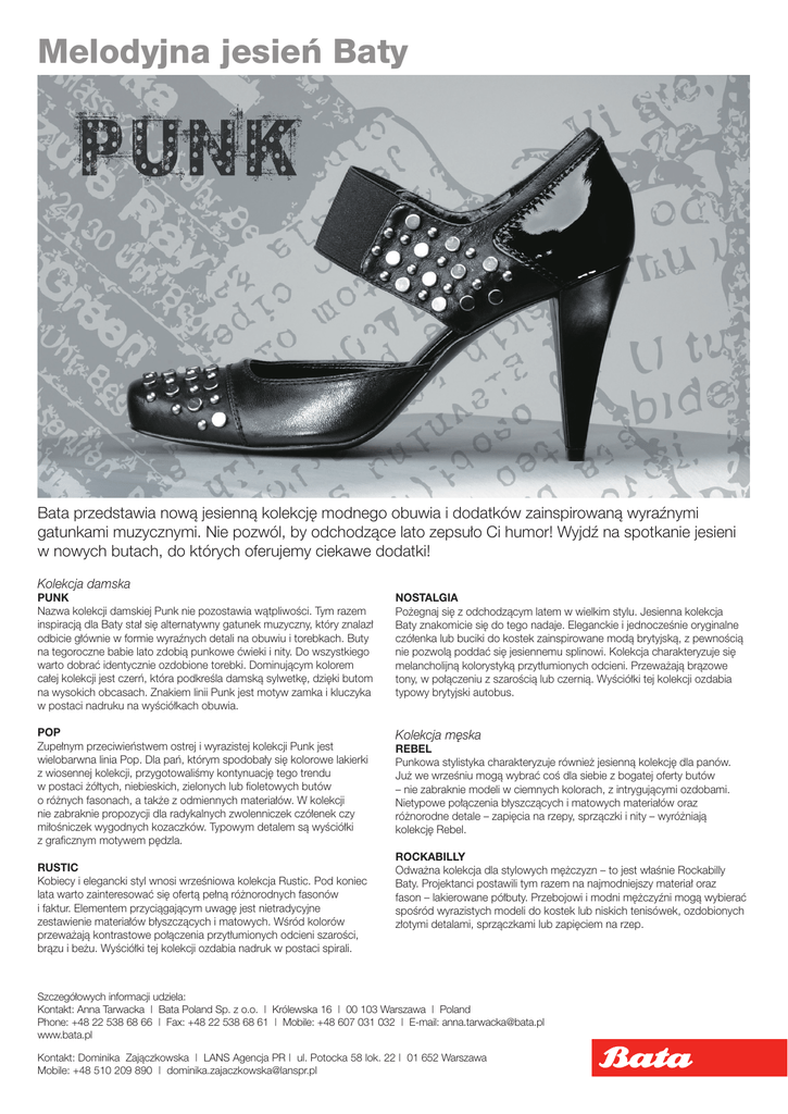 Melodyjna jesień Baty Bata przedstawia nową jesienną kolekcję modnego obuwia i dodatków zainspirowaną wyraźnymi gatunkami muzycznymi. Nie pozwól, by odchodzące lato zepsuło Ci humor! Wyjdź na spotkanie jesieni w nowych butach, do których oferujemy ciekawe dodatki! Kolekcja damska PUNK Nazwa kolekcji damskiej Punk nie pozostawia wątpliwości. Tym razem inspiracją dla Baty stał się alternatywny gatunek muzyczny, który znalazł odbicie głównie w formie wyraźnych detali na obuwiu i torebkach. Buty na tegoroczne babie lato zdobią punkowe ćwieki i nity. Do wszystkiego warto dobrać identycznie ozdobione torebki. Dominującym kolorem całej kolekcji jest czerń, która podkreśla damską sylwetkę, dzięki butom na wysokich obcasach. Znakiem linii Punk jest motyw zamka i kluczyka w postaci nadruku na wyściółkach obuwia. NOSTALGIA Pożegnaj się z odchodzącym latem w wielkim stylu. Jesienna kolekcja Baty znakomicie się do tego nadaje. Eleganckie i jednocześnie oryginalne czółenka lub buciki do kostek zainspirowane modą brytyjską, z pewnością nie pozwolą poddać się jesiennemu splinowi. Kolekcja charakteryzuje się melancholijną kolorystyką przytłumionych odcieni. Przeważają brązowe tony, w połączeniu z szarością lub czernią. Wyściółki tej kolekcji ozdabia typowy brytyjski autobus. POP Zupełnym przeciwieństwem ostrej i wyrazistej kolekcji Punk jest wielobarwna linia Pop. Dla pań, którym spodobały się kolorowe lakierki z wiosennej kolekcji, przygotowaliśmy kontynuację tego trendu w postaci żółtych, niebieskich, zielonych lub fioletowych butów o różnych fasonach, a także z odmiennych materiałów. W kolekcji nie zabraknie propozycji dla radykalnych zwolenniczek czółenek czy miłośniczek wygodnych kozaczków. Typowym detalem są wyściółki z graficznym motywem pędzla. Kolekcja męska RUSTIC Kobiecy i elegancki styl wnosi wrześniowa kolekcja Rustic. Pod koniec lata warto zainteresować się ofertą pełną różnorodnych fasonów i faktur. Elementem przyciągającym uwagę jest nietradycyjne zestawienie materiałów błyszczących i matowych. Wśród kolorów przeważają kontrastowe połączenia przytłumionych odcieni szarości, brązu i beżu. Wyściółki tej kolekcji ozdabia nadruk w postaci spirali. REBEL Punkowa stylistyka charakteryzuje również jesienną kolekcję dla panów. Już we wrześniu mogą wybrać coś dla siebie z bogatej oferty butów – nie zabraknie modeli w ciemnych kolorach, z intrygującymi ozdobami. Nietypowe połączenia błyszczących i matowych materiałów oraz różnorodne detale – zapięcia na rzepy, sprzączki i nity – wyróżniają kolekcję Rebel. ROCKABILLY Odważna kolekcja dla stylowych mężczyzn – to jest właśnie Rockabilly Baty. Projektanci postawili tym razem na najmodniejszy materiał oraz fason – lakierowane półbuty. Przebojowi i modni mężczyźni mogą wybierać spośród wyrazistych modeli do kostek lub niskich tenisówek, ozdobionych złotymi detalami, sprzączkami lub zapięciem na rzep. Szczegółowych informacji udziela: Kontakt: Anna Tarwacka | Bata Poland Sp. z o.o. | Królewska 16 | 00 103 Warszawa | Poland Phone: +48 22 538 68 66 | Fax: +48 22 538 68 61 | Mobile: +48 607 031 032 | E-mail: [email protected] www.bata.pl Kontakt: Dominika Zajączkowska | LANS Agencja PR | ul. Potocka 58 lok. 22 | 01 652 Warszawa Mobile: +48 510 209 890 | [email protected]