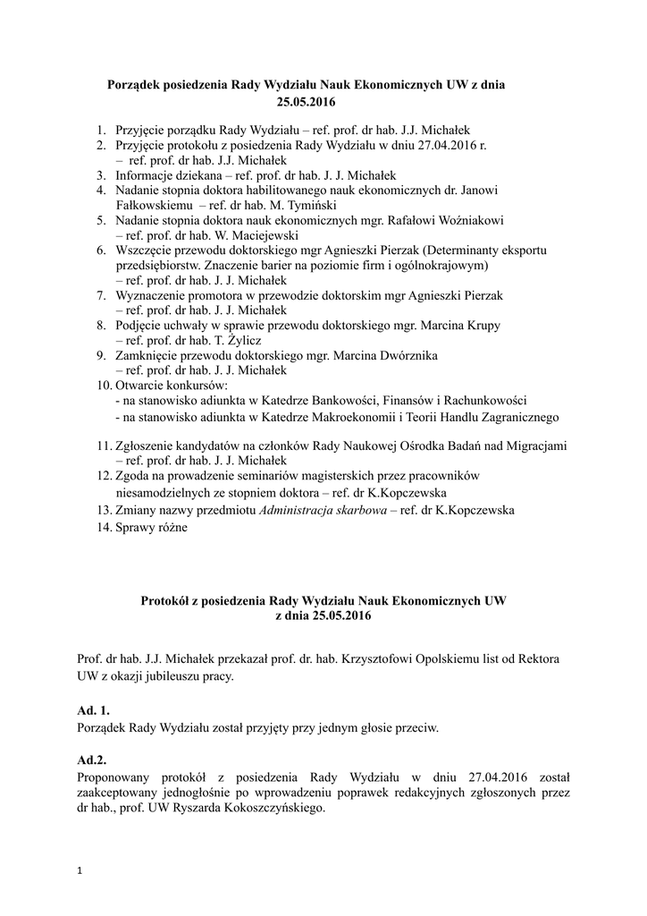 Porządek posiedzenia Rady Wydziału Nauk Ekonomicznych UW z dnia 25.05.2016 1. Przyjęcie porządku Rady Wydziału – ref. prof. dr hab. J.J. Michałek 2. Przyjęcie protokołu z posiedzenia Rady Wydziału w dniu 27.04.2016 r. – ref. prof. dr hab. J.J. Michałek 3. Informacje dziekana – ref. prof. dr hab. J. J. Michałek 4. Nadanie stopnia doktora habilitowanego nauk ekonomicznych dr. Janowi Fałkowskiemu – ref. dr hab. M. Tymiński 5. Nadanie stopnia doktora nauk ekonomicznych mgr. Rafałowi Woźniakowi – ref. prof. dr hab. W. Maciejewski 6. Wszczęcie przewodu doktorskiego mgr Agnieszki Pierzak (Determinanty eksportu przedsiębiorstw. Znaczenie barier na poziomie firm i ogólnokrajowym) – ref. prof. dr hab. J. J. Michałek 7. Wyznaczenie promotora w przewodzie doktorskim mgr Agnieszki Pierzak – ref. prof. dr hab. J. J. Michałek 8. Podjęcie uchwały w sprawie przewodu doktorskiego mgr. Marcina Krupy – ref. prof. dr hab. T. Żylicz 9. Zamknięcie przewodu doktorskiego mgr. Marcina Dwórznika – ref. prof. dr hab. J. J. Michałek 10. Otwarcie konkursów: - na stanowisko adiunkta w Katedrze Bankowości, Finansów i Rachunkowości - na stanowisko adiunkta w Katedrze Makroekonomii i Teorii Handlu Zagranicznego 11. Zgłoszenie kandydatów na członków Rady Naukowej Ośrodka Badań nad Migracjami – ref. prof. dr hab. J. J. Michałek 12. Zgoda na prowadzenie seminariów magisterskich przez pracowników niesamodzielnych ze stopniem doktora – ref. dr K.Kopczewska 13. Zmiany nazwy przedmiotu Administracja skarbowa – ref. dr K.Kopczewska 14. Sprawy różne Protokół z posiedzenia Rady Wydziału Nauk Ekonomicznych UW z dnia 25.05.2016 Prof. dr hab. J.J. Michałek przekazał prof. dr. hab. Krzysztofowi Opolskiemu list od Rektora UW z okazji jubileuszu pracy. Ad. 1. Porządek Rady Wydziału został przyjęty przy jednym głosie przeciw. Ad.2. Proponowany protokół z posiedzenia Rady Wydziału w dniu 27.04.2016 został zaakceptowany jednogłośnie po wprowadzeniu poprawek redakcyjnych zgłoszonych przez dr hab., prof. UW Ryszarda Kokoszczyńskiego. 1 Ad.3. Prof. dr hab. J.J. Michałek poinformował, że od czasu ostatniego posiedzenia Rady Wydziału odbyło się jedno posiedzenie Senatu UW w dniu 18 maja 2016. Gościem Senatu był wicepremier, Minister Nauki i Szkolnictwa Wyższego Jarosław Gowin oraz Wiceminister dr hab. Teresa Czerwińska z Wydziału Zarządzania UW. Minister Gowin poinformował o planowanych działaniach Ministerstwa. Mają one zmierzać do redukcji nadmiernego „przeregulowania” szkolnictwa wyższego w Polsce i wzmocnienia działań projakościowych. W najbliższym czasie nastąpi nowelizacja obecnej ustawy Prawo o Szkolnictwie Wyższym. Nowelizacja ta ma w niewielkim stopniu skorygować zasady parametryzacji i zmodyfikować zasady KRK. W przypadku parametryzacji być może wskaźnik 3N zostanie zmieniony na 2N. Nowe Polskie Ramy Kwalifikacji (PRK) mają być uproszczone. Prawdopodobnie zmieni się również formuła funkcjonowania Polskiej Komisji Akredytacyjnej (PKA), która ma stać się organem ekspercko-doradczym. Natomiast funkcje kontrolno-akredytacyjne mają być przejęte przez aparat MNiSW. Planowana jest także nowa Ustawa o Szkolnictwie Wyższym. Punktem wyjścia do jej przygotowania będzie materiał opracowany przez trzy niezależne zespoły, wyłonione na drodze konkursowej. Jednak ostateczny kształt Ustawy będzie zaproponowany przez Ministerstwo. Nowa Ustawa ma przyczynić się do premiowania jakości, a nie tylko liczby studentów. Jest to konieczne ze względu na dużą liczbę uczelni państwowych i spadek liczby maturzystów, związany z niżem demograficznym. Premiowane ma być również umiędzynarodowienie uczelni. W trakcie dyskusji Minister wyjaśnił, że podstawą do oceny uczelni mają być liczne (kilkanaście) wskaźniki jakościowe, oparte głównie o informacje z systemu POL-on. Mają one uwzględniać m.in. poziom wiedzy maturzystów przyjmowanych na studia (na podstawie wyników z matur) oraz szanse absolwentów na znalezienie miejsc pracy (na podstawie danych ZUS-u). Kluczowym zadaniem będzie dobór odpowiednich wskaźników i ich wag, co ma być przed wprowadzeniem empirycznie testowane. W dłuższej perspektywie, prawdopodobnie na podstawie parametryzacji, mają zostać wyłonione najlepsze uczelnie badawcze, będące odpowiednikiem „uczelni flagowych”. Minister wyjaśnił także, że rozważane jest przeniesienie z powrotem części procedury habilitacyjnej do rad wydziałów uczelni. Centralna Komisja, jego zdaniem, powinna pełnić przede wszystkim funkcję weryfikacyjną i odwoławczą. Minister raczej wykluczył możliwość powrotu do jednolitych studiów magisterskich (niezgodnych z procesem bolońskim) oraz funkcjonowania Krajowych Naukowych Ośrodków Wiodących (KNOW-ów). W czasie dyskusji Minister i senatorowie część czasu poświecili problemom umiędzynarodowienia uczelni. Minister obiecał wsparcie dla koncepcji prowadzenia międzynarodowych (międzyuczelnianych) doktoratów oraz potrzebę wzmocnienia finansowego doktorantów i staży post-doktorskich. Prof. dr hab. J.J. Michałek poinformował Radę Wydziału, iż w oparciu o doświadczenia Wydziału wyraził podczas posiedzenia Senatu pogląd o nadal występujących barierach instytucjonalno-administracyjnych ograniczających możliwości wymiany studentów i szerszej współpracy międzynarodowej uczelni. Minister Gowin zobowiązał prof. dr. hab. J.J. Michałka (UW) do opracowania katalogu najuciążliwszych barier. 2 Prof. dr hab. J.J. Michałek podkreślił, iż liczy na pomoc pracowników Wydziału w sporządzeniu takiego katalogu, a lista ta zostanie następnie przekazana Rektorowi. Prof. dr hab. J.J. Michałek poinformował, iż w dalszej części posiedzenia Senatu UW omówiono krótko i przyjęto plan finansowy Uniwersytetu na rok 2016. W trakcie dyskusji podkreślono, że sytuacja Uniwersytetu jest stabilna, a większość jedno