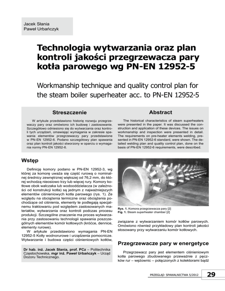 Jacek Słania Paweł Urbańczyk technologia wytwarzania oraz plan kontroli jakości przegrzewacza pary kotła parowego wg Pn-en 12952-5 workmanship technique and quality control plan for the steam boiler superheater acc. to Pn-en 12952-5 Streszczenie abstract W artykule przedstawiono historię rozwoju przegrzewaczy pary oraz omówiono ich budowę i zastosowanie. Szczegółowo odniesiono się do wytwarzania oraz kontroli tych urządzeń, omawiając wymagania w zakresie spawania elementów przegrzewaczy pary przedstawione w PN-EN 12952-6. Podano szczegółowy plan spawania oraz plan kontroli jakości stworzony w oparciu o wymagania normy PN-EN 12952-6. The historical characteristics of steam superheaters were presented in the paper. It was discussed the construction and application of these devices. The issues on workmanship and inspection were presented in detail. The requirements on pre-heater elements welding, presented in PN-EN 12952-6 standard, were shown. The detailed welding plan and quality control plan, done on the basis of PN-EN 12952-6 requirements, were described. wstęp Definicję komory podano w PN-EN 12952-3, wg której za komorę uważa się część rurową o nominalnej średnicy zewnętrznej większej od 76,2 mm, do której wchodzą nieosiowo trzy lub więcej rury. Komory kotłowe obok walczaka lub wodooddzielacza (w zależności od konstrukcji kotła) są jednym z najważniejszych elementów ciśnieniowych kotła parowego (rys. 1). Ze względu na obciążenia termiczne oraz obciążenia pochodzące od ciśnienia, elementy te podlegają specjalnemu traktowaniu pod względem zastosowanych materiałów, wytwarzania oraz kontroli podczas procesu produkcji. Szczególne znaczenie ma proces wytwarzania przy zastosowaniu technologii spawania poszczególnych elementów komór kotłowych (króćce, dennice, elementy rurowe). W artykule przedstawiono wymagania PN-EN 12952-5 Kotły wodnorurowe i urządzenia pomocnicze. Wytwarzanie i budowa części ciśnieniowych kotłów, Dr hab. inż. Jacek Słania, prof. PCz – politechnika Częstochowska, mgr inż. Paweł Urbańczyk – Urząd Dozoru Technicznego. Rys. 1. Komora przegrzewacza pary [2] Fig. 1. Steam superheater chamber [2] związane z wytwarzaniem komór kotłów parowych. Omówiono również przykładowy plan kontroli jakości stosowany przy wytwarzaniu komór kotłowych. Przegrzewacze pary w energetyce Przegrzewacz pary jest elementem ciśnieniowym kotła parowego zbudowanego przeważnie z pęczków rur – wężownic – połączonych z kolektorami bądź Przegląd sPawalnictwa 5/2012 29 komorami zbiorczymi, wlotową i wylotową. Zadaniem przegrzewacza jest doprowadzenie ciepła do pary nasyconej, suchej wytworzonej w parowniku i otrzymanie pary przegrzanej. Przegrzewacze pary ze względu na sposób wymiany ciepła można podzielić na: opromieniowane, półopromieniowane i konwekcyjne. Przy niskich ciśnieniach przegrzewacze umieszcza się w strefie niskiej temperatury spalin (drugi ciąg kotła). Ze wzrostem ciśnienia powierzchnia parownika zmniejsza się, a rośnie powierzchnia przegrzewacza. Przegrzewacz należy wówczas umieścić w strefie możliwie najwyższej temperatury. Duże przegrzewacze dzieli się na dwa lub więcej stopni, aby istniała możliwość montażu pomiędzy nimi regulatorów temperatury pary i mieszania pary, niwelując nierównomierności temperatury po stronie spalin oraz stronie pary. Jest to szczególnie istotne dla kotłów na wysokie parametry pary, gdy materiał wężownic pracuje w wysokiej temperaturze i jest w strefie bliskiej granicy dopuszczalnej wytrzymałości na pełzanie [1]. Przegrzewacze wtórne Przegrzewaczami wtórnymi pary wodnej nazwano urządzenia stosowane w celu podniesienia sprawności siłowni parowej. Para po częściowym rozprężeniu w części wysokoprężnej turbiny kierowana jest powtórnie do kotła parowego, w którym następuje podniesienie jej temperatury (a więc i entalpii). Oprócz podniesienia sprawności zabieg ten powoduje zwiększenie stopnia suchości pary na wylocie z turbiny. Przegrzewacze pary w kotłach bloków energetycznych na parametry nad- i ultranadkrytyczne Zastosowanie przegrzewaczy zwiększyło sprawność kotła energetycznego oraz obiegu siłowni parowych. Najnowsze kotły są budowane na parametry nadkrytyczne oraz o jeszcze większej sprawności – jednostki na parametry ultranadkrytyczne (temperatura pary przekracza 620oC). Dla tak wysokich parametrów przewidziano zastosowanie stali ferrytyczno-martenzytycznych (p = 260 bar; t = 545oC), austenitycznych (p = 290 bar, t = 600oC) oraz dla bloków pracujących na parametry ultranadkrytyczne stopów niklu (p = 350 bar, t > 700oC) [6]. Przyjęto, że dzięki zwiększeniu parametrów następuje wzrost sprawności ok. 0,5% na każde 10oC przyrostu temperatury pary świeżej i wtórnie przegrzanej oraz ok. 0,2% na każdy 1 MPa podwyższenia ciśnienia pary świeżej. Efektem zastosowania wyższych parametrów początkowych jest zwiększenie sprawności bloku o 1,3÷2,0% [6]. 30 Przegląd sPawalnictwa 5/2012 Praca przy takich parametrach wymaga zastosowania zaawansowanych technologii przy wytwarzaniu materiałów na elementy ciśnieniowe, jak i łączeniu tych materiałów, a w szczególności ich spawania. Wysoką sprawność bloków energetycznych kocioł – turbina – generator osiąga się na etapie projektowania m.in. przez wzrost temperatury wody zasilającej, oraz próżni w kondensatorze, obniżanie temperatury wylotowej spalin, a zwłaszcza przez wzrost ciśnienia i temperatury pary. Parametry nadkrytyczne i ultranadkrytyczne – rys historyczny Pierwszym zbudowanym na świecie dużym blokiem na ultranadkrytyczne parametry pary (p = 345 bar, t = 649oC) z podwójnym przegrzewem wtórnym (566/566oC) o mocy 325 MW był kocioł uruchomiony w USA w 1959 r. w elektrowni Eddystone, należącej do Philadelphia Electric Co. Ze względu na zastosowanie do jego budowy nieodpowiedniej jakości mat