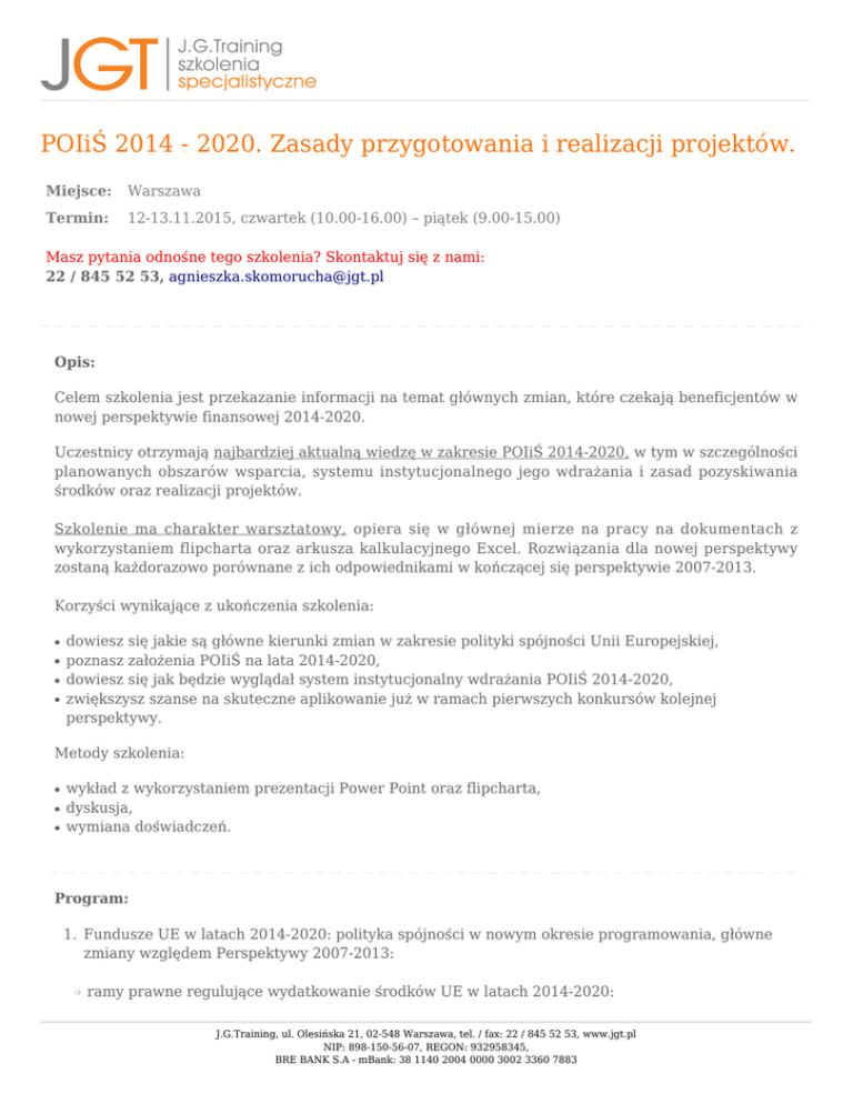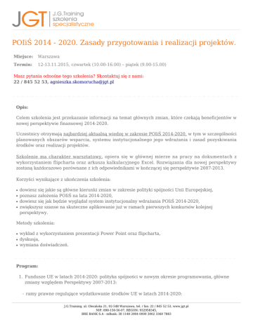 POIiŚ 2014 - 2020. Zasady przygotowania i realizacji projektów. Miejsce: Warszawa Termin: 12-13.11.2015, czwartek (10.00-16.00) – piątek (9.00-15.00) Masz pytania odnośne tego szkolenia? Skontaktuj się z nami: 22 / 845 52 53, [email protected] Opis: Celem szkolenia jest przekazanie informacji na temat głównych zmian, które czekają beneficjentów w nowej perspektywie finansowej 2014-2020. Uczestnicy otrzymają najbardziej aktualną wiedzę w zakresie POIiŚ 2014-2020, w tym w szczególności planowanych obszarów wsparcia, systemu instytucjonalnego jego wdrażania i zasad pozyskiwania środków oraz realizacji projektów. Szkolenie ma charakter warsztatowy, opiera się w głównej mierze na pracy na dokumentach z wykorzystaniem flipcharta oraz arkusza kalkulacyjnego Excel. Rozwiązania dla nowej perspektywy zostaną każdorazowo porównane z ich odpowiednikami w kończącej się perspektywie 2007-2013. Korzyści wynikające z ukończenia szkolenia: ● ● ● ● dowiesz się jakie są główne kierunki zmian w zakresie polityki spójności Unii Europejskiej, poznasz założenia POIiŚ na lata 2014-2020, dowiesz się jak będzie wyglądał system instytucjonalny wdrażania POIiŚ 2014-2020, zwiększysz szanse na skuteczne aplikowanie już w ramach pierwszych konkursów kolejnej perspektywy. Metody szkolenia: ● ● ● wykład z wykorzystaniem prezentacji Power Point oraz flipcharta, dyskusja, wymiana doświadczeń. Program: 1. Fundusze UE w latach 2014-2020: polityka spójności w nowym okresie programowania, główne zmiany względem Perspektywy 2007-2013: ❍ ramy prawne regulujące wydatkowanie środków UE w latach 2014-2020: J.G.Training, ul. Olesińska 21, 02-548 Warszawa, tel. / fax: 22 / 845 52 53, www.jgt.pl NIP: 898-150-56-07, REGON: 932958345, BRE BANK S.A - mBank: 38 1140 2004 0000 3002 3360 7883 ■ ■ ■ pakiet rozporządzeń wspólnotowych, prawo krajowe, wytyczne wspólnotowe oraz krajowe. 2. Zmiany w systemie wdrażania POIiŚ 2014-2020 w stosunku do Perspektywy 2007-2013: ❍ ❍ ❍ ❍ ❍ ❍ główne instytucje (funkcje i zadania), instytucja zarządzająca, instytucja pośrednicząca, instytucja wdrażająca, beneficjent, instytucja audytowa. 3. Zasady aplikowania o środki pomocowe oraz zasady realizacji projektów wynikające z prawa wspólnotowego: ❍ ❍ ❍ ❍ ❍ ❍ ❍ ❍ ❍ desygnacja. wybór projektów. rozliczenia i sprawozdawczość finansowa. rodzaj wsparcia: dotacja, pożyczka, gwarancja. kontrola. wykrywanie i raportowanie nieprawidłowości. procedury odwoławcze. przepływy finansowe. system informatyczny. 4. Wybrane obowiązki beneficjenta wynikające z rozporządzeń unijnych oraz umowy o dofinansowanie w perspektywie 2007-2013 oraz 2014-2020: ❍ ❍ ❍ trwałość (art. 57 rozp. 1083 oraz art. 71 rozp. 1303), dochodowość (art. 55 rozp. 1083 oraz 61 rozp. 1303), archiwizacja dokumentów (art. 90 rozp. 1083 oraz art. 140 rozp. 1303). 5. Wprowadzanie zmian w projekcie i umowie dofinansowania na zakończenie realizacji projektu. 6. Wskaźniki realizacji projektów i ryzyka z nimi związane. 7. Definicja okresu trwałości projektu w perspektywie 2007-2013 (art. 57 rozp. 1083) oraz 2014-2020 (art. 71 rozp. 1303). 8. Projekty generujące dochód w rozumieniu art. 55 rozp. 1083/2006 oraz art. 61 rozp. 1303 a pomoc publiczna w rozumieniu art. 107 Traktatu o funkcjonowaniu Unii Europejskiej. 9. Podstawowe zasady obliczania luki finansowej. J.G.Training, ul. Olesińska 21, 02-548 Warszawa, tel. / fax: 22 / 845 52 53, www.jgt.pl NIP: 898-150-56-07, REGON: 932958345, BRE BANK S.A - mBank: 38 1140 2004 0000 3002 3360 7883 ❍ ❍ ❍ wytyczne Ministra Rozwoju Regionalnego Wytyczne w zakresie wybranych zagadnień związanych z przygotowaniem projektów inwestycyjnych, w tym projektów generujących dochód, wytyczne Komisji Europejskiej – Komitetu Koordynującego Fundusze (COCOF) - interpretacja zapisów art. 55 rozporządzenia Rady (WE) nr 1083/2006 (COCOF 07/0074/09 z dnia 30 listopada 2010 r.), rozporządzenie delegowane Komisji (UE) nr 480/2014 z dnia 3 marca 2014 r. 10. Nowe metody określenia dochodu generowanego przez projekty, w tym uproszczone podejście oparte na stawkach zryczałtowanych dla operacji w dziedzinach technologii informacyjnych i komunikacyjnych (TIK), badań, rozwoju i innowacji oraz efektywności energetycznej w perspektywie 2014-2020. 11. Luka finansowa - określenie poziomu dofinansowania projektu, w tym metodologia wyliczenia luki finansowej: ❍ ❍ ❍ w jakich przypadkach należy ponownie przeliczać lukę finansową? zmiana poziomu dofinansowania w projekcie a luka finansowa, zmiana kosztów inwestycyjnych a luka finansowa i poziom dofinansowania. 12. Zasady określenia poziomu dofinansowania: ❍ ❍ ❍ wyłączenia ze stosowania luki finansowej modyfikacja art. 55 rozp. 1083/2006 wprowadzona rozp. 1341/2008 oraz art. 61 rozp. 1303, ewentualne błędy w analizie finansowej i ekonomicznej, rozliczenie projektu – horyzont czasowy monitorowania dochodów. 13. Obowiązki beneficjenta w zakresie monitorowania dochodowości w perspektywie 2007-2013 oraz 2014-2020. 14. Obowiązki jakie nakłada na Instytucje Zarządzające ust. 3 i 4 art. 55 rozp. 1083 oraz art. 61 rozp. 1303: ❍ ❍ ❍ ❍ ❍ monitorowanie dochodów i kosztów w projektach, w tym w projektach projektów generujących dochód, monitorowanie dochodów w przypadku projektów, o których mowa w art. 55 ust. 3 rozporządzenia Rady (WE) nr 1083/2006, monitorowanie dochodów w przypadku projektów, o których mowa w art. 55 ust. 4 rozporządzenia Rady (WE) nr 1083/2006 (po zmianie wprowadzonej rozporządzeniem Parlamentu Europejskiego i Rady (WE) 539/2010), monitorowanie kosztów kwalifikowanych w przypadku projektów generujących dochód, czy raz wyliczona luka w momencie aplikowania o środki „zamyka” temat dochodowości? 15. Dochodowość w rozumieniu art. 55 rozp. 1083/2006 a trwałość projektu w rozumieniu art. 57 rozp. 1083/2006