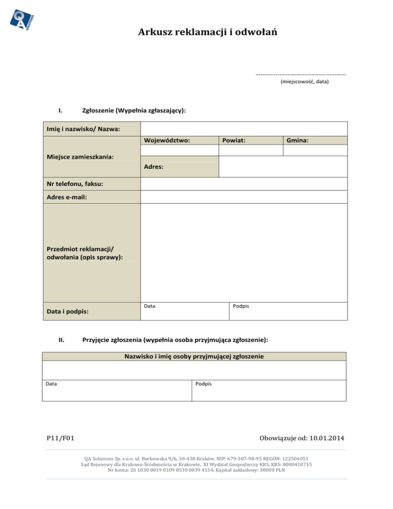 Arkusz reklamacji i odwołań ….………..………………………………… (miejscowość, data) I. Zgłoszenie (Wypełnia zgłaszający): Imię i nazwisko/ Nazwa: Województwo: Powiat: Gmina: Miejsce zamieszkania: Adres: Nr telefonu, faksu: Adres e-mail: Przedmiot reklamacji/ odwołania (opis sprawy): Data Podpis Data i podpis: II. Przyjęcie zgłoszenia (wypełnia osoba przyjmująca zgłoszenie): Nazwisko i imię osoby przyjmującej zgłoszenie Data P11/F01 Podpis Obowiązuje od: 10.01.2014 QA Solutions Sp. z o.o. ul. Borkowska 9/6, 30-438 Kraków, NIP: 679-307-98-95 REGON: 122504051 Sąd Rejonowy dla Krakowa-Śródmieścia w Krakowie, XI Wydział Gospodarczy KRS, KRS: 0000410715 Nr konta: 26 1030 0019 0109 8530 0039 4154, Kapitał zakładowy: 30000 PLN Arkusz reklamacji i odwołań III. Rejestracja (wypełnia Specjalista ds. dokumentacji QA Solutions Sp. z o.o.): Nr kolejny sprawy Imię i nazwisko osoby rejestrującej zgłoszenie Data Podpis Data i podpis: IV. Tryb rozpatrzenia zgłoszenia (wypełnia Prezes Zarządu QA Solutions Sp. z o.o.): Tryb rozpatrywania zgłoszenia, wyznaczenie osoby/jednostki odpowiedzialnej za rozpatrzenie zgłoszenia. Data Podpis V. Postępowanie wyjaśniające (wypełnia osoba/jednostka odpowiedzialna za rozpatrzenie sprawy): Imię i nazwisko/ Nazwa jednostki rozpatrującej: Planowany termin rozpatrzenia (data): Działania wyjaśniające (zaznaczyć TAK lub NIE) P11/F01 Weryfikacja dokumentów: TAK NIE Dodatkowa inspekcja: TAK NIE Pobranie próbek: TAK NIE Obowiązuje od: 10.01.2014 QA Solutions Sp. z o.o. ul. Borkowska 9/6, 30-438 Kraków, NIP: 679-307-98-95 REGON: 122504051 Sąd Rejonowy dla Krakowa-Śródmieścia w Krakowie, XI Wydział Gospodarczy KRS, KRS: 0000410715 Nr konta: 26 1030 0019 0109 8530 0039 4154, Kapitał zakładowy: 30000 PLN Arkusz reklamacji i odwołań VI. Decyzja w sprawie dalszego postępowania (wypełnia osoba/jednostka odpowiedzialna za rozpatrzenie sprawy): Opis sytuacji objętej odwołaniem/reklamacją: Uznanie odwołania/reklamacji: Działania naprawcze: Załączniki: TAK NIE TAK NIE 1. 2. 3. Opis proponowanego sposobu załatwienia odwołania/reklamacji Data Podpis Data i podpis: VII. Zatwierdzenie decyzji (wypełnia Prezes Zarządu QA Solutions Sp. z o.o.): Zatwierdzenie decyzji: Data ZATWIERDZAM / NIE ZATWIERDZAM* Podpis * niepotrzebne skreślić P11/F01 Obowiązuje od: 10.01.2014 QA Solutions Sp. z o.o. ul. Borkowska 9/6, 30-438 Kraków, NIP: 679-307-98-95 REGON: 122504051 Sąd Rejonowy dla Krakowa-Śródmieścia w Krakowie, XI Wydział Gospodarczy KRS, KRS: 0000410715 Nr konta: 26 1030 0019 0109 8530 0039 4154, Kapitał zakładowy: 30000 PLN
