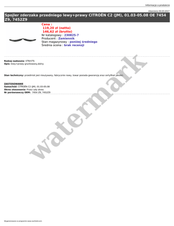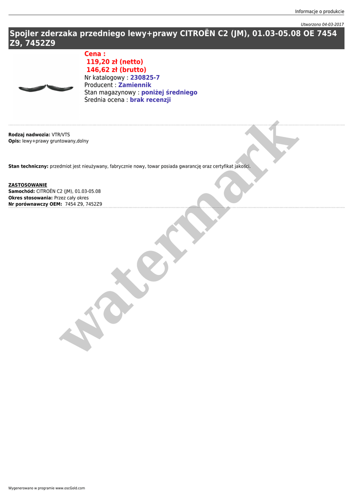 Informacje o produkcie Utworzono 04-03-2017 Spojler zderzaka przedniego lewy+prawy CITROËN C2 (JM), 01.03-05.08 OE 7454 Z9, 7452Z9 Cena : 119,20 zł (netto) 146,62 zł (brutto) Rodzaj nadwozia: VTR/VTS Opis: lewy+prawy gruntowany,dolny er m ar k Nr katalogowy : 230825-7 Producent : Zamiennik Stan magazynowy : poniżej średniego Średnia ocena : brak recenzji Stan techniczny: przedmiot jest nieużywany, fabrycznie nowy, towar posiada gwarancję oraz certyfikat jakości. w at ZASTOSOWANIE Samochód: CITROËN C2 (JM), 01.03-05.08 Okres stosowania: Przez cały okres Nr porównawczy OEM: 7454 Z9, 7452Z9 Wygenerowano w programie www.oscGold.com