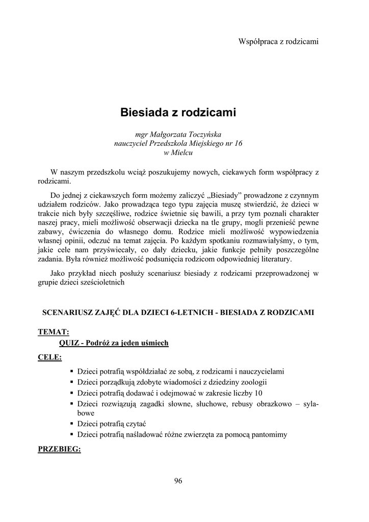 Współpraca z rodzicami Biesiada z rodzicami mgr Małgorzata Toczyńska nauczyciel Przedszkola Miejskiego nr 16 w Mielcu W naszym przedszkolu wciąż poszukujemy nowych, ciekawych form współpracy z rodzicami. Do jednej z ciekawszych form możemy zaliczyć „Biesiady” prowadzone z czynnym udziałem rodziców. Jako prowadząca tego typu zajęcia muszę stwierdzić, że dzieci w trakcie nich były szczęśliwe, rodzice świetnie się bawili, a przy tym poznali charakter naszej pracy, mieli możliwość obserwacji dziecka na tle grupy, mogli przenieść pewne zabawy, ćwiczenia do własnego domu. Rodzice mieli możliwość wypowiedzenia własnej opinii, odczuć na temat zajęcia. Po każdym spotkaniu rozmawiałyśmy, o tym, jakie cele nam przyświecały, co dały dziecku, jakie funkcje pełniły poszczególne zadania. Była również możliwość podsunięcia rodzicom odpowiedniej literatury. Jako przykład niech posłuży scenariusz biesiady z rodzicami przeprowadzonej w grupie dzieci sześcioletnich SCENARIUSZ ZAJĘĆ DLA DZIECI 6-LETNICH - BIESIADA Z RODZICAMI TEMAT: QUIZ - Podróż za jeden uśmiech CELE: Dzieci potrafią współdziałać ze sobą, z rodzicami i nauczycielami Dzieci porządkują zdobyte wiadomości z dziedziny zoologii Dzieci potrafią dodawać i odejmować w zakresie liczby 10 Dzieci rozwiązują zagadki słowne, słuchowe, rebusy obrazkowo – sylabowe Dzieci potrafią czytać Dzieci potrafią naśladować różne zwierzęta za pomocą pantomimy PRZEBIEG: 96 CKPiDN w Mielcu – Zeszyty nauczycielskie – Nr 2/2005 1. Przywitanie się dzieci, rodziców i nauczycieli piosenką pt. „Dzień dobry” 2. Odkrywanka matematyczno – sylabowa Dzieci wykonują działania matematyczne typu 2+5, 8-2, zamieszczone na kartonikach, na odwrocie których znajdują się sylaby. Następnie porządkują je od najmniejszego do największego wyniku tworząc hasło „Po – dróż za je – den u – śmiech” 3. Losowanie kolejnych etapów podróży Nauczyciel przygotowuje jajka niespodzianki, wewnątrz których znajdują się cyfry od 1 do 6 Dzieci losują cyfry, które są wyznacznikiem miejsca podróży STACJA 1 Aby dowiedzieć się gdzie wyruszymy w podróż dzieci muszą rozwiązać krzyżówkę, której hasłem jest wyraz: „ karawana”. Wyruszamy do Afryki, gdzie jest gorąco. − wyścigi rodziców i dzieci z kubkami z wodą, wygrywa ta drużyna, która wylała najmniej wody, − „czyja to sierść” – rozpoznawanie na obrazku, jakie to zwierzę, − zabawa integracyjna z rodzicami „Dżungla”. STACJA 2 Rozwiązanie zagadki słownej hasło: Indianin. Podróż do Ameryki, rozwiązanie rebusów obrazkowo – sylabowych, wykreślanek i odgadnięcie, „jakie ukryły się tu zwierzęta” (papuga, małpa, krokodyl). STACJA 3 Rozpoznanie miejsca podróży po zgromadzonych akcesoriach (czapka, szalik, rękawice). Podróż do Antarktydy. Rozwiązanie zagadek słownych hasło: pingwin, foka, mors. Zabawa z piłkami pingpongowymi – 5 dzieci rzuca piłki do rodziców. Trafieni rodzice wożą dzieci na sankach – kocykach. 97 Małgorzata Toczyńska – Biesiada z rodzicami STACJA 4 Rodzice mają umocowane na plecach litery, zadaniem dzieci jest ułożyć je w odpowiedniej kolejności i odczytać nazwę kontynentu – Europa. Poprowadzenie przez rodzica zabawy „Stary niedźwiedź mocno śpi”. STACJA 5 Dzieci rozpoznają „czyje to piórko?” (pióro strusia). Omówienie, gdzie żyją strusie, jak wyglądają i jak się poruszają. Zabawa ruchowa „ Kangurki” – skakanie w workach. Zabawa z rodzicami do muzyki – dzieci stają na nogach swoich rodziców i tańczą. STACJA 6 Ułożenie obrazka z części „Tygrys”. Podróż do Azji, rozpoznawanie na obrazkach: − czyje to ślady? − czyje kły? − czyj ogon? − czyja trąba? Rozwiązaniem jest hasło: słoń. Omówienie wyglądu słonia indyjskiego i afrykańskiego, wyszukanie różnic. Zabawa pantomimiczna „Zoo” do wiersza z magnetofonu o tym samym tytule. Dzieci podzielone na grupy naśladują ruchami, gestami występujące w wierszu zwierzęta. Zabawa z rodzicami do piosenki „Cztery słonie”. 4. Ewaluacja Rodzice otrzymali przygotowane przez dzieci swoje dłonie, na których zapisali jak czuli się na dzisiejszym zajęciu, jakie są ich odczucia. Z informacji zwrotnej dowiedziałam się, że zajęcia zostały wysoko ocenione przez rodziców, sprawiły im wiele radości, były okazją do zobaczenia własnego dziecka w różnych sytuacjach na tle grupy rówieśniczej. Uczestnicy wyrazili chęć brania udziału w takich zajęciach częściej. Literatura: 1. „Informacje i ciekawostki” – Jadwiga Misiak, Wydawnictwo Didasko Warszawa 2000 r. 2. „Śpiewające brzdące” cz. 2 – scenariusze, wiersze, propozycje zabaw, Katarzyna Komińska,, Dariusz Komiński, Wydawnictwo Grafikom Poznań 2002r. 98
