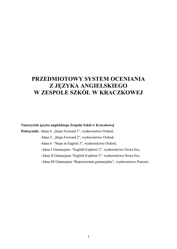 PRZEDMIOTOWY SYSTEM OCENIANIA Z JĘZYKA ANGIELSKIEGO W ZESPOLE SZKÓŁ W KRACZKOWEJ Nauczyciele języka angielskiego Zespołu Szkół w Kraczkowej Podręcznik: -klasa 4: „Steps Forward 1”, wydawnictwo Oxford, -klasa 5: „Steps Forward 2”, wydawnictwo Oxford, -klasa 6: “Steps in English 3”, wydawnictwo Oxford, - klasa I Gimnazjum- “English Explorer 2”, wydawnictwo Nowa Era, - klasa II Gimnazjum “English Explorer 3”, wydawnictwo Nowa Era, - klasa III Gimnazjum “Repetytorium gimnazjalne”, wydawnictwo Pearson. 1 Przedmiotowy system oceniania jest zgodny z Wewnątrzszkolnym Systemem Oceniania Szkoły Podstawowej w Kraczkowej. Zasady ogólne: I. Obowiązkowe wyposażenie ucznia na zajęciach: podręcznik, zeszyt ćwiczeń, zeszyt przedmiotowy, przybory do pisania, II. Ocenianiu podlegają: wiadomości, umiejętności, stosunek do przedmiotu, estetyka materiałów, aktywność na zajęciach, III. Uczniowie powinni otrzymać minimalnie 5 ocen na semestr, IV. Obowiązuje skala od 1 do 6. Uczeń otrzymuje oceny za: sprawdziany/ testy, kartkówki, odpowiedzi ustne, zadania domowe, zeszyt przedmiotowy, aktywność na zajęciach, V. Określanie pojęć: A) prace pisemne: -sprawdzian/ test- z określonego zakresu materiału, poprzedzone powtórzeniem i utrwaleniem wiadomości, zapisane w dzienniku i zapowiedziane z minimum tygodniowym wyprzedzeniem, -kartkówka- niezapowiedziana lub zapowiedziana praca pisemna obejmująca materiał z 1 do 3 jednostek lekcyjnych, lub z innego zakresu materiału ustalonego wcześniej z uczniami, -prace domowe ucznia- podlegające sprawdzeniu, ale nie zawsze ocenie w formie stopnia, -zeszyt przedmiotowy- podlega sprawdzeniu ale nie zawsze w formie stopnia, - zeszyt ćwiczeń- podlega sprawdzeniu ale nie zawsze w formie stopnia. B) wypowiedzi ustne: 2 -odpowiedzi z ostatnich 3 lekcji lub z większego zakresu materiału- jeśli nauczyciel odpytuje z większego zakresu materiału wcześniej uczniowie są o tym informowani, - aktywność na lekcji. VI. Ze sprawdzianów/testów oraz kartkówek uczeń otrzymuje ocenę: -celujący (tylko ze sprawdzianów/ testów) za poprawne wykonanie dodatkowych ćwiczeń jeśli takie znajdują się na danym sprawdzianie a czasem za 100% poprawnych odpowiedzi na danym teście, -bardzo dobry 100%- 91% poprawnych odpowiedzi, -dobry- 90%- 76% poprawnych odpowiedzi, -dostateczny-75%51% poprawnych odpowiedzi, -dopuszczający- 50%- 31% poprawnych odpowiedzi, -niedostateczny- 30%- 0% poprawnych odpowiedzi, VII. Obszary aktywności podlegające ocenie: A) Słownictwo: umiejętność radzenia sobie w codziennych sytuacjach, odpowiedni dobór słownictwa, odpowiedni zakres słownictwa, B) Gramatyka: poprawność, znajomość podstawowych struktur, formy pytające i przeczenia, czasy, szyk wyrazów w zdaniu, C) Rozumienie ze słuchu: zdolność rozumienia nauczyciela, kolegów, nagranych materiałów, wydobywanie szczegółowych informacji ze słuchanego tekstu, rozpoznawanie kontekstu, rozpoznawanie najważniejszych myśli, rozpoznawanie uczuć mówiącego, D) Mówienie: podawanie podstawowych informacji o sobie, poprawność, płynność, komunikacja interaktywna, zdolności negocjacyjne, wymowa, zasób struktur i słownictwa, umiejętność stosowania strategii komunikacyjnych, E) Czytanie: rozpoznawanie najważniejszych informacji, rozpoznawanie istotnych informacji, rozumienie przesłania/ znaczenia pisanego tekstu, F) Pisanie: zdolność przekazywania informacji, zdolność przekazywania informacji o sobie, zdolność opisywania ludzi, miejsc, zdarzeń , poprawność, podporządkowanie myśli i pomysłów, pisownia, G) Inne umiejętności: korzystanie ze słowników dwujęzycznych, tworzenie projektów (prac plastyczno- językowych). VIII . Ogólne zasady oceniania: 1. Uczniowie informowani są o swoich ocenach na bieżąco, 3 2. Uczeń ma prawo raz w ciągu semestru zgłosić nieprzygotowanie do zajęć ,musi to zrobić przed rozpoczęciem lekcji. Fakt ten zostaje odnotowany w dzienniku i w zeszycie przedmiotowym ucznia. Drugie i każde kolejne nieprzygotowanie oznacza ocenę cząstkową niedostateczną. Brak przygotowania spowodowany dłuższą nieobecnością lub szczególnymi wypadkami losowymi rozpatruje się indywidualnie. 3. Uczeń ma prawo raz w ciągu semestru zgłosić brak zadania domowego – przed rozpoczęciem lekcji. Fakt ten zostaje odnotowany w dzienniku i zeszycie przedmiotowym ucznia, natomiast każdy kolejny brak zadania domowego oznacza ocenę cząstkową niedostateczną, która nie podlega poprawie. Brak zadania spowodowany dłuższą usprawiedliwioną nieobecnością w szkole nie jest karany oceną niedostateczną, 4. Zadania domowe uczeń powinien odrabiać w domu. Uczeń, który odpisuje zadania domowe od innych uczniów w szkole, otrzymuje ocenę niedostateczną. 5. Przewiduje się maksymalnie 5 sprawdzianów/ testów na semestr- są one zawsze zapowiadane przez nauczyciela minimum tydzień wcześniej. Jeżeli uczeń opuścił sprawdzian z przyczyn losowych to powinien napisać go w ciągu dwóch tygodni od powrotu do szkoły lub w terminie ustalonym wcześniej indywidualnie z nauczycielem. Jeżeli uczeń nie przystąpił do napisania sprawdzianu z powodu dłuższej, usprawiedliwionej nieobecności w szkole, termin jego napisania jest do uzgodnienia z nauczycielem, 6. Kartkówki są przeważnie zapowiadane- zarówno ich termin, jak i obowiązujący zakres materiału. Jednak mogą się pojawić kartkówki niezapowiedziane- wtedy zakres materiału obejmuje 1 do maksymalnie 3 ostatnich jednostek lekcyjnych. Uczniowie nieobecni podczas kartkówek piszą je w możliwie najbliższym terminie po powrocie do szkoły lub odpowiadają ustnie, 7. Nie ocenia się uczniów do tygodnia po dłuższej (powyżej tygodnia), usprawiedliwionej nieobecności w szkole, 8. Nie ocenia się ucznia znajdującego się w trudnej sytuacji losowej lub nauczyciel uzgadnia z tym uczniem datę oraz dokładny zakres materiału odpow