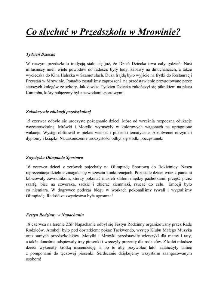 Co słychać w Przedszkolu w Mrowinie? Tydzień Dziecka W naszym przedszkolu tradycją stało się już, że Dzień Dziecka trwa cały tydzień. Nasi milusińscy mieli wiele powodów do radości: były lody, zabawy na dmuchańcach, a także wycieczka do Kina Halszka w Szamotułach. Dużą frajdą było wyjście na frytki do Restauracji Przystań w Mrowinie. Ponadto zostaliśmy zaproszeni na przedstawienie przygotowane przez starszych kolegów ze szkoły. Jak zawsze Tydzień Dziecka zakończył się piknikiem na placu Karamba, który połączony był z zawodami sportowymi. Zakończenie edukacji przedszkolnej 15 czerwca odbyło się uroczyste pożegnanie dzieci, które od września rozpoczną edukację wczesnoszkolną. Mrówki i Motylki wyruszyły w kolorowych wagonach na upragnione wakacje. Występ obfitował w piękne wiersze i piosenki tematyczne. Absolwenci otrzymali dyplomy i książki. Na zakończenie uroczystości odbył się słodki poczęstunek. Zwycięska Olimpiada Sportowa 16 czerwca dzieci z zerówek pojechały na Olimpiadę Sportową do Rokietnicy. Nasza reprezentacja dzielnie zmagała się w sześciu konkurencjach. Pozostałe dzieci wraz z paniami kibicowały zawodnikom, którzy pokonać musieli slalom między pachołkami, przejść przez szarfę, biec na czworaka, sadzić i zbierać ziemniaki, rzucać do celu. Emocji było co niemiara. W dogrywce podczas biegu w workach pokonaliśmy rywali i wygraliśmy Olimpiadę. Radość ze zwycięstwa była ogromna! Festyn Rodzinny w Napachaniu 18 czerwca na terenie ZSP Napachanie odbył się Festyn Rodzinny organizowany przez Radę Rodziców. Atrakcji było pod dostatkiem: pokaz Taekwondo, występ Klubu Małego Muzyka oraz samych przedszkolaków. Motylki i Mrówki przedstawiły wierszyki dla mamy i taty, a także donośnie odśpiewały trzy piosenki i wręczyły prezenty dla rodziców. Z kolei młodsze dzieci wykonały krótką inscenizację, a po to aby przywołać lato, zatańczyły taniec z pomponami do tęczowej piosenki. Serdecznie dziękujemy wszystkim zaangażowanym osobom! Projekt „Zdrowo jem” W czerwcu dzieci z grupy Biedronek wzięły udział w projekcie pt. „Zdrowo jem”. Wspólnie z Panią Mariolą Protasiewicz (przyszłą dietetyk) poznały zasady zdrowego odżywiania się oraz piramidę żywności. Wykonały także pyszne sałatki owocowe i kanapki. Obiecały również, że nie będą jeść już tyle słodyczy Lato, lato… 21 czerwca całe przedszkole z wielką radością witało kolejną porę roku- lato. Dzieci i panie przystrojone pięknymi wiankami i bukietami z polnych kwiatów, świętowały nadejście tej długo wyczekiwanej pory roku. Na zakończenie uroczystości wianki zostały zawieszone przy wejściu do przedszkola, a bukiety umieszczone w kankach i dzbanach w holu. Konkurs „9 planeta” i Turniej Przyrodniczy Pod koniec czerwca grupa Motyli podsumowała realizowany przez cały rok autorski program przyrodniczy ,,Przyroda wokół nas" oraz projekt ,,Rytm planet- rytm ziemi". W konkursie ,,9 planeta'' zwyciężył Wojtek Staszak, konstruując planetę marzeń. W ramach programu ,,Przyroda wokół nas" realizowany był też projekt ,,Drzewa", w którym dzieci wraz z rodzicami fotografowali te same drzewa w czterech porach roku. Piękne zdjęcia wykonała Basia Ginter z grupy Motyli. Tego dnia odbył się też Turniej Przyrodniczy stanowiący ewaluację obu programów. Dzieci wykazały się zdobytą wiedzą przyrodniczą. Doskonale odpowiadały na pytania dotyczące otaczającej przyrody: lasu, sadu, parku, kosmosu, zwierząt, pogody i ekologii a także bezpieczeństwa. W nagrodę wszystkie dzieci otrzymały medal opiekuna i miłośnika przyrody oraz certyfikat astronoma. Wszystkim osobom zaangażowanym w realizację programów serdeczne dziękujemy. Światowy Dzień Psa 1 lipca przypada Światowy Dzień Psa. Z tej okazji w dniu 28 czerwca gościliśmy w naszym przedszkolu specjalistę od dogoterapii wraz z psem rasy border collie - Willym. Dzieci podzielone na małe grupy uczestniczyły w zajęciach z pieskiem. Poznały właściwe zachowanie się w obecności nieznanego psa. Pomagały właścicielce czworonoga spakować odpowiednie akcesoria dla psa na wakacje. Potem podziwiały umiejętności pieska, który pokonywał slalom, przejście w tunelu, aportował i podawał łapę. Na pożegnanie wszyscy otrzymali pamiątkowe dyplomy ,,Przyjaciela psa" z wizerunkiem Willego. Konkurs „Mój przyjaciel pies” W ostatnich dniach czerwca rozstrzygnięty został konkurs ,,Mój przyjaciel pies". Zwycięzcą został Kacper Zboralski z grupy Motyli. Drugie miejsce zajęła Asia Gościniak- Mrówki, a trzecie Basia Kuśnierek z Biedronek. Wszystkim uczestnikom gratulujemy i zapraszamy do brania udziału w konkursach w przyszłym roku przedszkolnym. Co słychać w przedszkolu w Napachaniu? Dzień Dziecka w Przedszkolu. Początek czerwca to czas wyjątkowo lubiany przez wszystkie dzieci. Nasze świętowanie rozpoczęliśmy już we wtorek 31.05. od tzw. dmuchańców. Śmiechu ,gwaru dziecięcego i zabawy było bardzo dużo. Środa to pierwszy dzień czerwca kiedy każde małe i duże dziecko obchodzi swoje święto. Również nasi Podopieczni z radością świętowali swój dzień − Dzień Dziecka − na zorganizowanej przez nas zabawie. W tym dniu zamiast codziennych zajęć dydaktycznych zaproponowaliśmy naszym Przedszkolakom liczne gry i zabawy oraz piknik: była muzyka, tańce oraz dużo balonów . Do tego odrobina smakołyków i już wszyscy byli zadowoleni. Z początku lekko zdezorientowane Przedszkolaki, wkrótce zrozumiały, że to ich Święto i z tej okazji ochoczo rzuciły się w wir zabawy. Czwartek był dniem kolorów- udowodniliśmy, że możemy malować "STOPAMI". Na koniec naszego świętowania zamieniliśmy się w sportowców, bo w zdrowym ciele zdrowy duch. Wycieczka Edukacyjna do Biblioteki w Mrowinie Wycieczka dzieci z grupy Żabki do Biblioteki Publicznej w Mrowinie w dniu 10 czerwca br. była