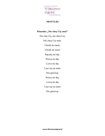 MOTYLKI Piosenka „Nie chcę Cię znać” Nie chę Cię, nie chcę Cię, Nie chcę Cię znać. Chodź do mnie, Chodź do mnie Rączkę mi daj. Prawą mi daj, Lewa mi daj I już się na mnie Nie gniewaj. Prawa mi daj, Lewą mi daj I już się na mnie Nie gniewaj. www.WisniowyOgrod.pl Piosenka „Bal na łące”” Kiedy świeci słoneczko, To na łące nad rzeczką, Świerszcze stroją skrzypeczki Do wiosennej poleczki. Dylu-dylu już grają, Grube bąki śpiewają, Muszki tańczą poleczkę, Sapią przy tym troszeczkę. A trzy małe biedronki, Nie chcą tańczyć tej polki I czekają na walca, Aby tańczyć na palcach. www.WisniowyOgrod.pl Piosenka „ Orkiestra” Mały jeżyk na bębenku gra, Ram tam tam, ram tam tam, Ram tam tam. Na grzechotkach grają misie dwa, Szu szu szu, szu szu szu, Szu szu szu. Stary zając na talerzach gra, Bum ta ra, bum ta ra, Bum ta ra. Młody dzięcioł puka w drzewo tak Stuku-puk, stuku-puk, Stuku-puk. www.WisniowyOgrod.pl Piosenka „Święto taty” Słońce mocno przygrzewa, Jaki piękny mamy maj. Święto taty już się zbliża, Szumi rzeka, szumi gaj. Zerwę kwiatki pachnące, Piękny bukiet zrobię sam, Złożę tacie dziś życzenia I w prezencie kwiaty dam. Potem razem pójdziemy, Spacerować poprzez las, Bardzo lubię z moim tatą Spędzać wspólnie wolny czas. Rymowanka „Kolorowa wiosna” Kolorowa wiosna Kwiaty rozsiewała. Tu wsadziła stokrotkę, Tam maka dodała. www.WisniowyOgrod.pl www.WisniowyOgrod.pl