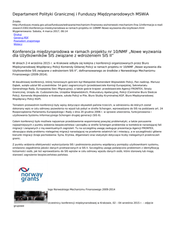 Departament Polityki Granicznej i Funduszy Międzynarodowych MSWiA Źródło: http://fundusze.mswia.gov.pl/ue/fundusze/wdrazane/mechanizm-finansowy-eo/norweski-mechanizm-fina-1/informacje-o-reali zowan/13302,Konferencja-miedzynarodowa-w-ramach-projektu-nr-10NMF-Nowe-wyzwania-dla-Uzytkown.html Wygenerowano: Sobota, 4 marca 2017, 06:14 Drukuj Generuj PDF Powiadom znajomego Wstecz Konferencja międzynarodowa w ramach projektu nr 10/NMF „Nowe wyzwania dla Użytkowników SIS związane z wdrożeniem SIS II” W dniach 2-4 września 2015 r. w Krakowie odbyła się kolejna z konferencji organizowanych przez Biuro Międzynarodowej Współpracy Policji Komendy Głównej Policji w ramach projektu nr 10/NMF „Nowe wyzwania dla Użytkowników SIS związane z wdrożeniem SIS II”, dofinansowanego ze środków z Norweskiego Mechanizmu Finansowego (2009-2014). W dwudniowej konferencji, której honorowym gościem był Małopolski Komendant Wojewódzki Policji, Pan nadinsp. Mariusz Dąbek, wzięło udział 90 uczestników: 54 gości zagranicznych (przedstawiciele Komisji Europejskiej, Sekretariatu Generalnego Rady, Europejskiej Sieci Migracyjnej), a także goście krajowi: przedstawiciele Agencji FRONTEX, Straży Granicznej, Urzędu ds. Cudzoziemców, Urzędów Wojewódzkich, Prokuratury Apelacyjnej, Policji (Centralne Biuro Śledcze Policji, Komenda Wojewódzka w Krakowie, szkoła Policji w Pile, Biuro Służby Kryminalnej KGP, Biuro Międzynarodowej Współpracy Policji KGP). Tematem przewodnim konferencji były wpisy dotyczące obywateli państw trzecich, w odniesieniu do których został dokonany wpis w celu odmowy pozwolenia na wjazd lub pobyt w strefie Schengen, wprowadzane do SIS na podstawie art. 24 Rozporządzenia Parlamentu Europejskiego i Rady z dnia 20 grudnia 2006 r. w sprawie utworzenia, funkcjonowania i użytkowania Systemu Informacyjnego Schengen drugiej generacji (SIS II). Celem konferencji było możliwie najszersze przedstawienie wspomnianej powyżej problematyki, a także poruszenie najważniejszych z punktu widzenia bezpieczeństwa i porządku w strefie Schengen problemów w kontekście narastającej fali migracji i związanych z nią ewentualnych zagrożeń. Tu na szczególną uwagę zasługuje prezentacja Agencji FRONTEX, obrazująca skalę problemu nielegalnej migracji narastającej na przełomie ostatnich lat i miesięcy, a w szczególności główne kierunki migracji (kraje pochodzenia: Syria, Erytrea, Afganistan) oraz statystyki dotyczące liczby nielegalnych przekroczeń granic. Z punktu widzenia efektywności wykorzystania SIS i podniesienia poziomu współpracy pomiędzy użytkownikami systemu, omówiono zagadnienia jakości danych przetwarzanych w SIS II. Szczególną uwagę poświęcono problemom z identyfikacją tożsamości osób, jak też wprowadzaniu do SIS wpisów w celu odmowy wjazdu danych osób, które stanowią lub mogą stanowić zagrożenie bezpieczeństwa państwa. logo Norweskiego Mechanizmu Finansowego 2009-2014 Uczestnicy konferencji międzynarodowej w Krakowie, 02 – 04 września 2015 r. – zdjęcie grupowe Otwarcie konferencji międzynarodowej w Krakowie, 02 – 04 września 2015 r. przez nadinsp. Mariusza Dąbka, Małopolskiego Komendanta Wojewódzkiego Policji i insp. Rafała Łysakowskiego, Dyrektora Biura Międzynarodowej Współpracy Policji KGP Otwarcie konferencji. Na zdjęciu: nadinsp. Mariusz Dąbek, Małopolski Komendant Wojewódzki Policji, insp. Rafał Łysakowski, Dyr. Biura Międzynarodowej Współpracy Policji KGP i podinsp. Łukasz Wiliński, Z-ca Dyr. Biura Międzynarodowej Współpracy Policji KGP Prezentacja przedstawiciela Europejskiej Sieci Migracyjnej - Pani Madeleine Vazques Ortiz Uczestnicy konferencji międzynarodowej w Krakowie, 02 – 04 września 2015 r. – przedstawiciele zagranicznych Biur SIRENE Uczestnicy konferencji międzynarodowej w Krakowie, 02 – 04 września 2015 r. – przedstawiciele zagranicznych Biur SIRENE Uczestnicy konferencji międzynarodowej w Krakowie, 02 – 04 września 2015 r. – przedstawiciele zagranicznych Biur SIRENE Osoba publikująca: Administrator DWMiFE, liczba wejść: 227