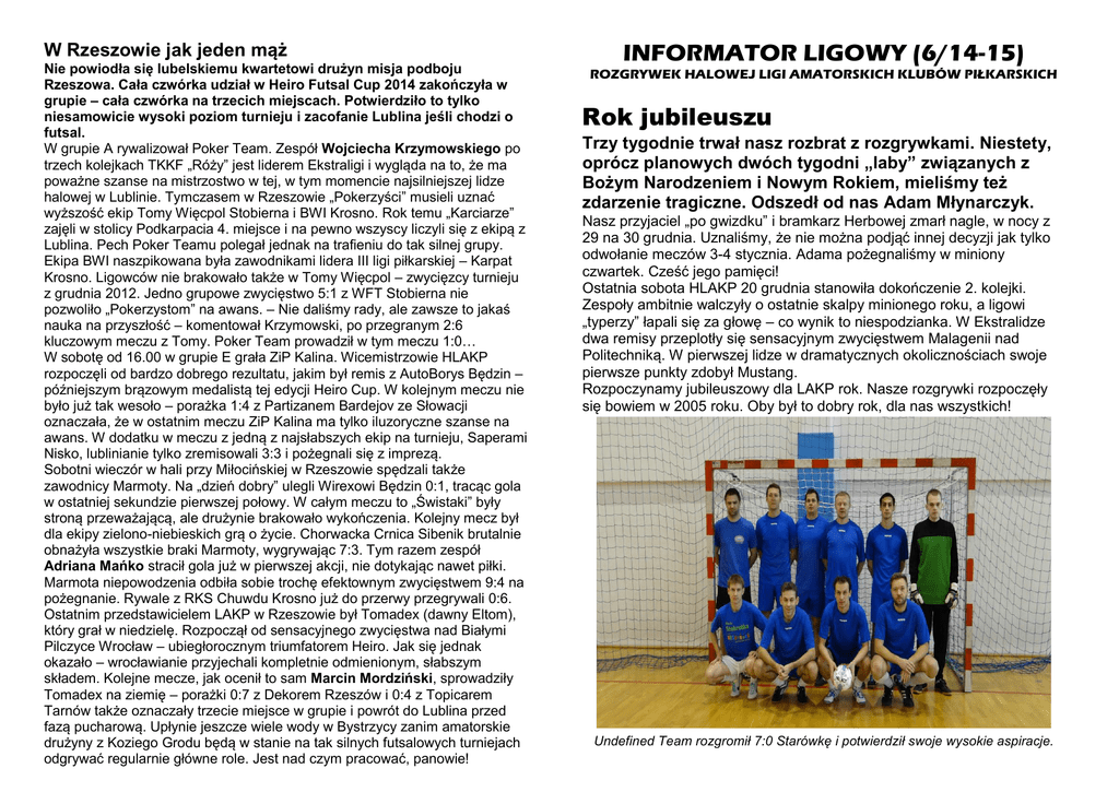 W Rzeszowie jak jeden mąż Nie powiodła się lubelskiemu kwartetowi drużyn misja podboju Rzeszowa. Cała czwórka udział w Heiro Futsal Cup 2014 zakończyła w grupie – cała czwórka na trzecich miejscach. Potwierdziło to tylko niesamowicie wysoki poziom turnieju i zacofanie Lublina jeśli chodzi o futsal. W grupie A rywalizował Poker Team. Zespół Wojciecha Krzymowskiego po trzech kolejkach TKKF „Róży” jest liderem Ekstraligi i wygląda na to, że ma poważne szanse na mistrzostwo w tej, w tym momencie najsilniejszej lidze halowej w Lublinie. Tymczasem w Rzeszowie „Pokerzyści” musieli uznać wyższość ekip Tomy Więcpol Stobierna i BWI Krosno. Rok temu „Karciarze” zajęli w stolicy Podkarpacia 4. miejsce i na pewno wszyscy liczyli się z ekipą z Lublina. Pech Poker Teamu polegał jednak na trafieniu do tak silnej grupy. Ekipa BWI naszpikowana była zawodnikami lidera III ligi piłkarskiej – Karpat Krosno. Ligowców nie brakowało także w Tomy Więcpol – zwycięzcy turnieju z grudnia 2012. Jedno grupowe zwycięstwo 5:1 z WFT Stobierna nie pozwoliło „Pokerzystom” na awans. – Nie daliśmy rady, ale zawsze to jakaś nauka na przyszłość – komentował Krzymowski, po przegranym 2:6 kluczowym meczu z Tomy. Poker Team prowadził w tym meczu 1:0… W sobotę od 16.00 w grupie E grała ZiP Kalina. Wicemistrzowie HLAKP rozpoczęli od bardzo dobrego rezultatu, jakim był remis z AutoBorys Będzin – późniejszym brązowym medalistą tej edycji Heiro Cup. W kolejnym meczu nie było już tak wesoło – porażka 1:4 z Partizanem Bardejov ze Słowacji oznaczała, że w ostatnim meczu ZiP Kalina ma tylko iluzoryczne szanse na awans. W dodatku w meczu z jedną z najsłabszych ekip na turnieju, Saperami Nisko, lublinianie tylko zremisowali 3:3 i pożegnali się z imprezą. Sobotni wieczór w hali przy Miłocińskiej w Rzeszowie spędzali także zawodnicy Marmoty. Na „dzień dobry” ulegli Wirexowi Będzin 0:1, tracąc gola w ostatniej sekundzie pierwszej połowy. W całym meczu to „Świstaki” były stroną przeważającą, ale drużynie brakowało wykończenia. Kolejny mecz był dla ekipy zielono-niebieskich grą o życie. Chorwacka Crnica Sibenik brutalnie obnażyła wszystkie braki Marmoty, wygrywając 7:3. Tym razem zespół Adriana Mańko stracił gola już w pierwszej akcji, nie dotykając nawet piłki. Marmota niepowodzenia odbiła sobie trochę efektownym zwycięstwem 9:4 na pożegnanie. Rywale z RKS Chuwdu Krosno już do przerwy przegrywali 0:6. Ostatnim przedstawicielem LAKP w Rzeszowie był Tomadex (dawny Eltom), który grał w niedzielę. Rozpoczął od sensacyjnego zwycięstwa nad Białymi Pilczyce Wrocław – ubiegłorocznym triumfatorem Heiro. Jak się jednak okazało – wrocławianie przyjechali kompletnie odmienionym, słabszym składem. Kolejne mecze, jak ocenił to sam Marcin Mordziński, sprowadziły Tomadex na ziemię – porażki 0:7 z Dekorem Rzeszów i 0:4 z Topicarem Tarnów także oznaczały trzecie miejsce w grupie i powrót do Lublina przed fazą pucharową. Upłynie jeszcze wiele wody w Bystrzycy zanim amatorskie drużyny z Koziego Grodu będą w stanie na tak silnych futsalowych turniejach odgrywać regularnie główne role. Jest nad czym pracować, panowie! INFORMATOR LIGOWY (6/14-15) ROZGRYWEK HALOWEJ LIGI AMATORSKICH KLUBÓW PIŁKARSKICH Rok jubileuszu Trzy tygodnie trwał nasz rozbrat z rozgrywkami. Niestety, oprócz planowych dwóch tygodni „laby” związanych z Bożym Narodzeniem i Nowym Rokiem, mieliśmy też zdarzenie tragiczne. Odszedł od nas Adam Młynarczyk. Nasz przyjaciel „po gwizdku” i bramkarz Herbowej zmarł nagle, w nocy z 29 na 30 grudnia. Uznaliśmy, że nie można podjąć innej decyzji jak tylko odwołanie meczów 3-4 stycznia. Adama pożegnaliśmy w miniony czwartek. Cześć jego pamięci! Ostatnia sobota HLAKP 20 grudnia stanowiła dokończenie 2. kolejki. Zespoły ambitnie walczyły o ostatnie skalpy minionego roku, a ligowi „typerzy” łapali się za głowę – co wynik to niespodzianka. W Ekstralidze dwa remisy przeplotły się sensacyjnym zwycięstwem Malagenii nad Politechniką. W pierwszej lidze w dramatycznych okolicznościach swoje pierwsze punkty zdobył Mustang. Rozpoczynamy jubileuszowy dla LAKP rok. Nasze rozgrywki rozpoczęły się bowiem w 2005 roku. Oby był to dobry rok, dla nas wszystkich! Undefined Team rozgromił 7:0 Starówkę i potwierdził swoje wysokie aspiracje.