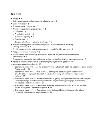 Spis treści • • • • • • • • • • • • Wstęp • 4 Cele programowe edukacyjne i wychowawcze • 4 Czas realizacji • 5 Przeznaczenie programu • 5 Treści i zagadnienia programowe • 5 – Człowiek • 6 – Przedmioty wokół • 6 – Budowle i ogrody • 6 – Cywilizacja • 6 – Związki z kulturą – wybrane przykłady • 6 Procedury osiągania celów edukacyjnych i wychowawczych, sposoby i formy realizacji • 7 Przykładowe techniki wykonywania prac i projektów (do wyboru) • 7 Miejsce i warunki realizacji • 8 Przykładowa tematyka zajęć ilustrująca wybrane zagadnienia programowe (do wyboru) • 8 Planowanie sposobów i metod oceny osiągnięć edukacyjnych i wychowawczych • 9 Ramowy rozkład materiału z orientacyjnym przydziałem godzin • 10 Wybrane scenariusze lekcji • 17 – Scenariusz zajęć nr 3 – Moda, stroje i fryzury wybranych epok na podstawie dzieł sztuki. Pokaz mody • 17 – Scenariusz zajęć nr 4 – Stara szafa. O detektywie poszukującym codziennych przedmiotów w słynnych dziełach malarskich. Formy przedmiotów inspirowane naturą • 19 – Scenariusz zajęć nr 8 – Otoczenie budowli. Ogrody jako połączenie form naturalnych i przemyślanego kształtowania przestrzeni. Tajemniczy ogród i jego mieszkańcy lub rzeźba z roślin i kwiatów • 22 – Scenariusz zajęć nr 9 – Przedstawienie pracy, wytworów techniki w sztuce. Mobile, sztuka kinetyczna i obrazy futurystów • 24 – Scenariusz zajęć nr 11 – Elementy z historii pisma i książki. Kompozycja tekstu i ilustracji – ilustrowany tomik wierszy • 26