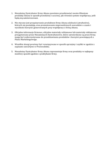 1. Niezależny Dystrybutor firmy Akuna powinien przedstawiać swoim Klientom produkty Akuna w sposób prawdziwy i uczciwy, jak również system współpracy, jeśli będą nią zainteresowani. 2. Nie etyczne jest przypisywanie produktom firmy Akuna zdolności (atrybutów), których nie posiadają, oraz prezentowanie nieprawdziwych warunków o czasie i wysokości korzyści generowanych przy współpracy z firmą Akuna. 3. Oficjalne informacje firmowe, oficjalne materiały reklamowe lub materiały reklamowe przygotowane przez Niezależnych Dystrybutorów, które zatwierdzone są przez firmę mogą być wykorzystywane do przedstawiania produktów i korzyści powstających z Planu Marketingowego. 4. Wszelkie skargi powinny być rozwiązywane w sposób uprzejmy i szybki w zgodzie z zapisami zawartymi w Przewodniku. 5. Niezależny Dystrybutor firmy Akuna reprezentuje firmy oraz produkty w najlepszy możliwy sposób zgodnie z praktykami firmy.