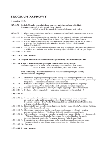 PROGRAM NAUKOWY 11 września 2015 r. 9.45-10.50 Sesja I. Choroba zwyrodnieniowa stawów – aktualne poglądy, mity i fakty Moderatorzy: prof. dr hab. n. med. Paweł Małdyk, dr hab. n. med. Krystyna Księżopolska-Orłowska, prof. nadzw. 9.45-10.05 1. Choroba zwyrodnieniowa stawów –etiopatogeneza i możliwości współczesnego leczenia – Grzegorz Szczęsny 2. Analiza zależności czynników wpływających na wystąpienie zmian zwyrodnieniowych stawów – Anna Olczak, Włodzisław Kuliński, Józef Mróz, Hanna Kowalewska 3. Ryzyko wystąpienia choroby zwyrodnieniowej kręgosłupa lędźwiowego wśród piłkarzy nożnych – Ewa Wodka-Natkaniec, Gabriela Siwecka, Tadeusz Niedźwiedzki, Łukasz Niedźwiedzki 4. Analiza zmian przeciążeniowych kręgosłupa u osób pracujących z komputerem w korelacji z wiekiem pracowników oraz analiza efektów podjętej rehabilitacji – Katarzyna Wegner 5. Dyskusja 10.05-10.15 10.15-10.25 10.25-10.35 10.35-10.45 10.45-11.10 Przerwa kawowa 11.10-17.15 Sesja II. Nowości w leczeniu zachowawczym choroby zwyrodnieniowej stawów 11.10-13.30 Część 1. Rehabilitacja i fizjoterapia – nowoczesne metody terapii Moderatorzy: dr hab. n. med. Krystyna Księżopolska-Orłowska, prof. nadzw., dr hab. n. med. Dariusz Białoszewski, dr n. med. Marek Kiljański Blok tematyczny – leczenie zachowawcze versus leczenie operacyjne choroby zwyrodnieniowej kręgosłupa 11.10-11.30 1. Możliwości diagnostyczne i terapeutyczne metody McKenziego w przypadkach ciasnoty otworowej i kanałowej na tle przewlekłych zmian zwyrodnieniowych odcinka lędźwiowego kręgosłupa – Tomasz Stengert, Rajmund Tomczakowski 11.30-11.50 2. Osteopatia w profilaktyce i terapii choroby zwyrodnieniowej stawów kręgosłupa – Michał Dwornik, Paweł Karczewski, Jakub Górnicki, Sebastian Szajkowski 11.50-12.10 3. Leczenie operacyjne zespołu ciasnoty w obrębie kręgosłupa – Paweł Baranowski 12.10-12.25 4. Dyskusja – „bitwa na poglądy” – uczestniczą prezenterzy wystąpień: 1, 2 i 3 12.25-12.40 Przerwa kawowa 12.40-12.50 5. Ocena wyników leczenia usprawniającego po protezoplastyce stawu kolanowego na podstawie badań elektromiograficznych wybranych mięśni kończyny dolnej. Doniesienie wstępne – Ewa Wodka-Natkaniec, Tadeusz Gaździk, Łukasz Niedźwiedzki, Alicja Jurecka, Łukasz Oleksy 12.50-13.00 6. Fizjoprofilaktyka w chorobie zwyrodnieniowej stawów – Anna Olczak, Włodzisław Kuliński, Józef Mróz, Hanna Kowalewska 13.00-13.10 7. Choroba zwyrodnieniowa stawów problemem współczesnej cywilizacji – analiza postępowania fizykalnego – Włodzisław Kuliński, Józef Mróz, Anna Olczak 13.10-13.20 8. Telerehabilitacja u pacjentów z chorobą zwyrodnieniową stawów biodrowych i kolanowych – Wojciech Glinkowski, Dominika Cabaj, Anna Czyżewska, Karolina Krawczak, Katarzyna Walesiak, Agnieszka Żukowska, Sławomir Paśko, Robert Sitnik 13.20-13.30 9. Kinesiotaping w dysfunkcjach narządu ruchu powodowanych chorobą reumatyczną. Wybrane aplikacje w chorobie zwyrodnieniowej stawów – Mariusz Dowejko 13.30-13.35 10. Dyskusja 13.35-14.00 Przerwa kawowa 14.00-17.15 Część 2. Farmakoterapia, metody biologiczne, komplementarne i in. Moderatorzy: dr hab. Wiesław Tomaszewski, prof. nadzw., dr hab. n. farm. Jacek Sapa, prof. nadzw., dr n. med. Artur Biel 14.00-14.15 1. Zastowanie NLPZ w chorobie zwyrodnieniowej stawów – Maciej Materkowski 14.15-14.55 2. Leki miorelaksacyjne – aktualna pozycja w leczeniu stanów spastycznych w ortopedii – Jacek Sapa, Leszek Nowiński 14.55-15.10 3. Co oznacza kompleksowe leczenie choroby zwyrodnieniowej stawów? Nowości 2015 – Wojciech Marczyński 15.10-15.25 4. Viscosuplementacja w leczeniu choroby zwyrodnieniowej stawów – fakty i mity – Artur Biel 15.25-16.10 Przerwa obiadowa 16.10-16.30 5. Dyskusja – „bitwa na poglądy” – uczestniczą prezenterzy wystąpień: 1,2,3 i 4 16.30-16.45 6. Regulacja stanu zapalnego w ChZS na przykładzie najnowszych badań naukowych złożonego leku naturalnego – Anita Bania 16.45-16.55 7. Efekty aplikacji pochodnych kwasu hialuronowego na aktywność wolnoprzewodzących włókien nerwowych zaopatrujących staw kolanowy szczura – Matthias Pawlak, Robert F. Schmidt 16.55-17.05 8. STADA – partner w leczeniu bólu (wykład sponsorowany) 17.05-17.15 9. Dyskusja 17.15-17.30 Przerwa kawowa 17.30-18.40 Sesja III. Nowości w leczeniu operacyjnym choroby zwyrodnieniowej stawów – co przed aloplastyką? Moderatorzy: prof. dr hab. n. med. Wojciech Marczyński, dr hab. n. med. Ireneusz Kotela, prof. nadzw. 17.30-17.40 1. Rola czynników wzrostu w leczeniu miejscowym elementów choroby zwyrodnieniowej stawów – doniesienie wstępne – Wojciech Marczyński, Jolanta Korsak, Iwona Jabłońska, Jerzy Białecki 17.40-17.50 2. Operacje korekcyjne osi kończyny jako zapobieganie rozwojowi choroby zwyrodnieniowej stawu kolanowego – Grzegorz Adamczyk, M. Dawidziuk 17.50-18.00 3. Ocena jakości życia u chorych po osteotomii okołopanewkowej miednicy – A. Czwojdziński, K. Kołodziejczyk, J. Czubak 18.00-18.10 4. Odległe wyniki leczenia chorych z dysplazją stawów biodrowych z użyciem osteotomii okołopanewkowej w aspekcie zmiany położenia środka stawu – K. Kołodziejczyk, A. Czwojdziński, J. Czubak 18.10-18.20 5. Czy jest możliwe zatrzymanie rozwoju zmian zwyrodnieniowych stawu skokowego – Andrzej Boszczyk, Stanisław Pomianowski 18.30-18.40 6. Porównanie endoprotezoplastyki i artrodezy w leczeniu zaawansowanego palucha sztywnego – Anna Skulimowska, Paweł Kołodziejski, Krzysztof Bryłka, Katarzyna Bażant 18.30-18.40 7. Dyskusja 18.40 Podsumowanie i zakończenie I-go dnia Kongresu