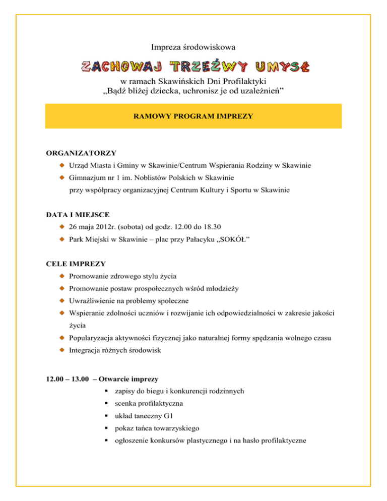Impreza środowiskowa w ramach Skawińskich Dni Profilaktyki „Bądź bliżej dziecka, uchronisz je od uzależnień” RAMOWY PROGRAM IMPREZY ORGANIZATORZY Urząd Miasta i Gminy w Skawinie/Centrum Wspierania Rodziny w Skawinie Gimnazjum nr 1 im. Noblistów Polskich w Skawinie przy współpracy organizacyjnej Centrum Kultury i Sportu w Skawinie DATA I MIEJSCE 26 maja 2012r. (sobota) od godz. 12.00 do 18.30 Park Miejski w Skawinie – plac przy Pałacyku „SOKÓŁ” CELE IMPREZY Promowanie zdrowego stylu życia Promowanie postaw prospołecznych wśród młodzieży Uwrażliwienie na problemy społeczne Wspieranie zdolności uczniów i rozwijanie ich odpowiedzialności w zakresie jakości życia Popularyzacja aktywności fizycznej jako naturalnej formy spędzania wolnego czasu Integracja różnych środowisk 12.00 – 13.00 – Otwarcie imprezy zapisy do biegu i konkurencji rodzinnych scenka profilaktyczna układ taneczny G1 pokaz tańca towarzyskiego ogłoszenie konkursów plastycznego i na hasło profilaktyczne 13.00 -14.00 – start do biegu grupy dzieci i młodzieży bieg „krasnali” – dzieci do 7 lat bieg dzieci 8-10 lat bieg dzieci 11-13 lat bieg młodzieży 14 - 16 lat pokaz salsy 14.00 –program artystyczny i rozpoczęcie współzawodnictwa rodzinnego występ artystyczny ogłoszenie wyników biegu dzieci i młodzieży, dekoracja zwycięzców pokaz szczudlarzy pokaz taekwondo występ artystyczny pokaz „zumby” 15.30 – start do sztafety honorowej ogłoszenie wyników konkursów na plakat, plastycznego i profilaktycznego, wręczenie nagród ogłoszenie wyników współzawodnictwa rodzin oraz sztafety, wręczenie nagród loteria fantowa dla dzieci i młodzieży 17.00 – KONCERT JANA WOJDAKA z Zespołu „WAWELE” ok. 18.30 – zakończenie imprezy