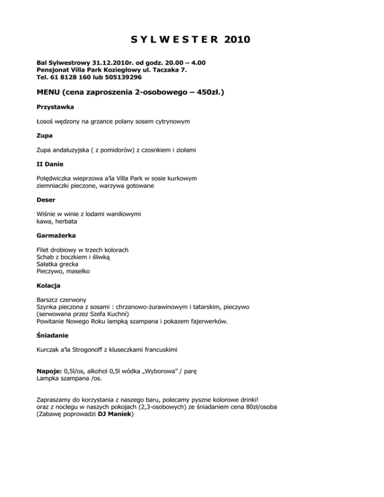 S Y L W E S T E R 2010 Bal Sylwestrowy 31.12.2010r. od godz. 20.00 – 4.00 Pensjonat Villa Park Koziegłowy ul. Taczaka 7. Tel. 61 8128 160 lub 505139296 MENU (cena zaproszenia 2-osobowego – 450zł.) Przystawka Łosoś wędzony na grzance polany sosem cytrynowym Zupa Zupa andaluzyjska ( z pomidorów) z czosnkiem i ziołami II Danie Polędwiczka wieprzowa a’la Villa Park w sosie kurkowym ziemniaczki pieczone, warzywa gotowane Deser Wiśnie w winie z lodami waniliowymi kawa, herbata Garmażerka Filet drobiowy w trzech kolorach Schab z boczkiem i śliwką Sałatka grecka Pieczywo, masełko Kolacja Barszcz czerwony Szynka pieczona z sosami : chrzanowo-żurawinowym i tatarskim, pieczywo (serwowana przez Szefa Kuchni) Powitanie Nowego Roku lampką szampana i pokazem fajerwerków. Śniadanie Kurczak a’la Strogonoff z kluseczkami francuskimi Napoje: 0,5l/os, alkohol 0,5l wódka „Wyborowa” / parę Lampka szampana /os. Zapraszamy do korzystania z naszego baru, polecamy pyszne kolorowe drinki! oraz z noclegu w naszych pokojach (2,3-osobowych) ze śniadaniem cena 80zł/osoba (Zabawę poprowadzi DJ Maniek)