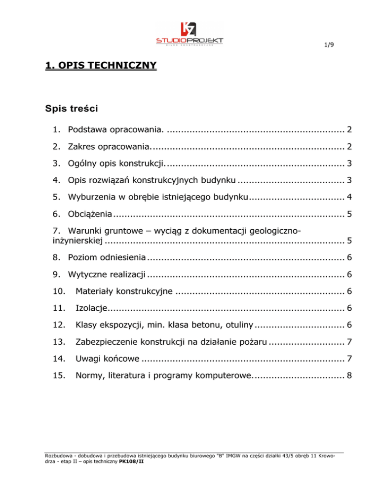 1/9 1. OPIS TECHNICZNY Spis treści 1. Podstawa opracowania. ............................................................... 2 2. Zakres opracowania..................................................................... 2 3. Ogólny opis konstrukcji................................................................ 3 4. Opis rozwiązań konstrukcyjnych budynku ...................................... 3 5. Wyburzenia w obrębie istniejącego budynku.................................. 4 6. Obciążenia .................................................................................. 5 7. Warunki gruntowe – wyciąg z dokumentacji geologicznoinżynierskiej ..................................................................................... 5 8. Poziom odniesienia ...................................................................... 6 9. Wytyczne realizacji ...................................................................... 6 10. Materiały konstrukcyjne ............................................................ 6 11. Izolacje.................................................................................... 6 12. Klasy ekspozycji, min. klasa betonu, otuliny ................................ 6 13. Zabezpieczenie konstrukcji na działanie pożaru ........................... 7 14. Uwagi końcowe ........................................................................ 7 15. Normy, literatura i programy komputerowe................................. 8 Rozbudowa - dobudowa i przebudowa istniejącego budynku biurowego "B" IMGW na części działki 43/5 obręb 11 Krowodrza - etap II – opis techniczny PK108/II 2/9 1. Podstawa opracowania. 1.1 Umowa ze Zleceniodawcą 1.2 Projekt budowlany/wykonawczy branży architektonicznej opracowany w listopadzie 2010r/lipcu 2011r. przez: Pracownia Projektowa Elżbieta Kierska ul. Halczyna 25, 30-086 Kraków 1.3 Dokumentacja geologiczno-inżynierska opracowana w listopadzie 2010r. przez: Zakład Usług Geologicznych „GEO-NOT” mgr inż. Tadeusz Nowak ul.Siewna 21a/53, 31-231 Kraków 1.4 Dokumentacja archiwalna istniejącego budynku tj. „Ośrodek odbioru i przetwarzania danych satelitarnych IMGW” przy ul. P.Borowego 14 sporządzona w listopadzie 1987r. przez: Krakowskie Biuro Projektowo Badawcze Budownictwa Ogólnego 1.5 Wizja lokalna w sierpniu oraz listopadzie oraz dokumentacja zdjęciowa 1.6 Wytyczne przeciwpożarowe do projektu 1.7 Opinia techniczna o możliwości rozbudowy istniejącego budynku „Ośrodek odbioru i przetwarzania danych satelitarnych IMGW” przy ul. Piotra Borowego 14 w Krakowie, oraz wpływu dobudowanego obiektu na istniejący. Sporządzona przez: KZ STUDIO PROJEKT Ul.Ostatnia 1C, 31-444 Kraków 1.8 Projekt budowlany branży konstrukcyjnej opracowany w listopadzie 2010r przez: KZ STUDIO PROJEKT Ul.Ostatnia 1C, 31-444 Kraków 1.9 Uzgodnienia międzybranżowe 1.10 Obowiązujące normy i przepisy budowlane. 2. Zakres opracowania. PROJEKT WYKONAWCZY BRANŻY KONSTRUKCYJNEJ: Rozbudowa - dobudowa i przebudowa istniejącego budynku biurowego "B" IMGW na części działki 43/5 obręb 11 Krowodrza - ETAP II Inwestor : Instytut Meteorologii i Gospodarki Wodnej 30-215 Kraków, ul. P. Borowego 14 Rozbudowa - dobudowa i przebudowa istniejącego budynku biurowego "B" IMGW na części działki 43/5 obręb 11 Krowodrza - etap II – opis techniczny PK108/II 3/9 3. Ogólny opis konstrukcji. Projektuje się: Budynek biurowy o 3 kondygnacjach nadziemnych, bez podpiwniczenia z dachem płaskim. Budynek będzie pełnił funkcję biurową i dobudowany zostanie do istniejącego budynku 2 kondygnacyjnego z podpiwniczeniem („Ośrodek odbioru i przetwarzania danych satelitarnych IMGW”) zbudowanego na przełomie lat 80-tych i 90-tych. Budynki zostaną połączone funkcjonalnie istniejącą klatką schodową. Budynki zostały od siebie oddylatowane. Nowoprojektowany budynek posiada nieregularny kształt w max wymiarach 24.3m x 13.8m. Konstrukcja budynku, ze względu na ograniczone wysokości kondygnacji i nawiązanie się poziomami do istniejącej klatki schodowej, została zaprojektowana w układzie bezbelkowym (płytowo-słupowy). Zastosowanie takiego układu konstrukcyjnego ma na celu umożliwienie bezkolizyjne rozprowadzenie instalacji. Ze względu na ograniczone wysokościami użytkowymi pomieszczeń grubości płyt zagęszczona została siatka słupów a płyty żelbetowe gr.18cm zostały dozbrojone na przebicie dyblami Halfen Deha. Sztywność budynku zapewniono stosując fragmenty żelbetowych ścian poprzecznych i podłużnych. Posadowienie budynku zostanie zrealizowane za pomocą układu ław i stóp fundamentowych na rzędnej ok. 203.3m npm. na stropie warstwy żwirów. Fundamenty zostały odsunięte i oddylatowane od fundamentów budynku istniejącego. Szczegółowy opis obiektu znajduje się w projekcie branży architektonicznej. 4. Opis rozwiązań konstrukcyjnych budynku Fundamenty Wykonane wg. odrębnego opracowania Ściany fundamentowe Wykonane wg. odrębnego opracowania Ściany zewnętrzne kondygnacji parterowej, 1, 2 piętra Ściany kondygnacji parterowej, 1,2, piętra mają grubość 19cm, murowane są z pustaków ceramicznych klasy 15 lub wykonywane z betonu B30 (C25/30) i zbrojone stalą AIIIN obustronnie (obustronna siatka). Ściany żelbetowe oznaczono szrafem. Ściany nośne pokazano na rysunku szalunkowym (bez szrafu), ścian wypełniających nie pokazywano (należy je przyjmować wg. rysunków architektonicznych). Ściany wypełniające wykonać po wykonaniu wszystkich stropów z zachowaniem 2cm szczeliny pod stropem wypełnionej materiałem elastycznym. Strop nad kondygnacją parterową, 1,2 piętrem Stropy nad parterem, 1,2 piętrem zaprojektowano w układzie płytowo-słupowym (bezbelkowym) gr.18cm z betonu B30 (C25/30). Krawędzie płyty zostały pogrubione i stanowią nadproże dla okien kondygnacji niżej i parapet dla okien kondygnacji powyżej. Ze względu na przebicie zastosowano zbrojenie w postaci dybli Halfen Deha. W str