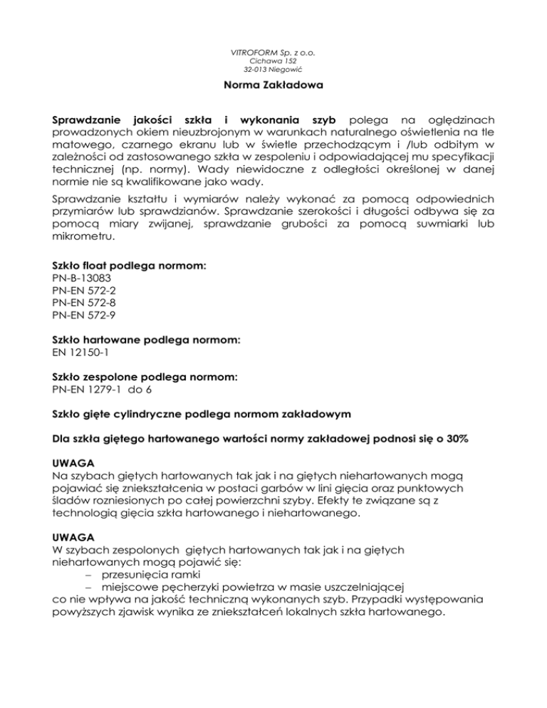 VITROFORM Sp. z o.o. Cichawa 152 32-013 Niegowić Norma Zakładowa Sprawdzanie jakości szkła i wykonania szyb polega na oględzinach prowadzonych okiem nieuzbrojonym w warunkach naturalnego oświetlenia na tle matowego, czarnego ekranu lub w świetle przechodzącym i /lub odbitym w zależności od zastosowanego szkła w zespoleniu i odpowiadającej mu specyfikacji technicznej (np. normy). Wady niewidoczne z odległości określonej w danej normie nie są kwalifikowane jako wady. Sprawdzanie kształtu i wymiarów należy wykonać za pomocą odpowiednich przymiarów lub sprawdzianów. Sprawdzanie szerokości i długości odbywa się za pomocą miary zwijanej, sprawdzanie grubości za pomocą suwmiarki lub mikrometru. Szkło float podlega normom: PN-B-13083 PN-EN 572-2 PN-EN 572-8 PN-EN 572-9 Szkło hartowane podlega normom: EN 12150-1 Szkło zespolone podlega normom: PN-EN 1279-1 do 6 Szkło gięte cylindryczne podlega normom zakładowym Dla szkła giętego hartowanego wartości normy zakładowej podnosi się o 30% UWAGA Na szybach giętych hartowanych tak jak i na giętych niehartowanych mogą pojawiać się zniekształcenia w postaci garbów w lini gięcia oraz punktowych śladów rozniesionych po całej powierzchni szyby. Efekty te związane są z technologią gięcia szkła hartowanego i niehartowanego. UWAGA W szybach zespolonych giętych hartowanych tak jak i na giętych niehartowanych mogą pojawić się: − przesunięcia ramki − miejscowe pęcherzyki powietrza w masie uszczelniającej co nie wpływa na jakość techniczną wykonanych szyb. Przypadki występowania powyższych zjawisk wynika ze zniekształceń lokalnych szkła hartowanego.