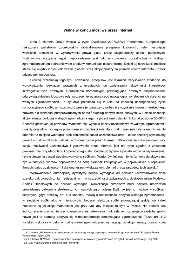 Walne w końcu możliwe przez Internet Dnia 3 sierpnia 2007r. weszła w życie Dyrektywa 2007/36/WE Parlamentu Europejskiego nakazująca państwom członkowskim zliberalizowanie przepisów krajowych, celem usunięcia wszelkich przeszkód w wykonywaniu prawa głosu przez akcjonariuszy spółek publicznych. Podstawową korzyścią tegoż rozporządzenia jest fakt umożliwienia uczestnictwa w walnych zgromadzeniach za pośrednictwem środków komunikacji elektronicznej. Dzięki tej nowelizacji możliwe stanie się między innymi oddawanie głosów przez akcjonariuszy za pośrednictwem Internetu i to bez udziału pełnomocników. Główną przesłanką tego typu nowelizacji przepisów jest wyraźnie zarysowana tendencja do wprowadzania rozwiązań prawnych zmierzających do zwiększania aktywności inwestorów, szczególnie tych drobnych. Uprawnienia korporacyjne przysługujące drobnym akcjonariuszom odgrywają aktualnie kluczową rolę, szczególnie wziąwszy pod uwagę ogromny stopień ich absencji na walnych zgromadzeniach. Ta sytuacja przekłada się z kolei na znaczną dezorganizację życia korporacyjnego spółki, a może grozić wręcz jej paraliżem, wobec nie uzyskania kworum niezbędnego prawem dla ważności przeprowadzanych obrad.1 Według danych szacunkowych, w Polsce absencja akcjonariuszy podczas walnych zgromadzeń sięga na przestrzeni ostatnich kilku lat poziomu 50-60%! Spośród głównych jej powodów wymienia się: wysokie koszty uczestnictwa w walnym zgromadzeniu (koszty dojazdów, noclegów poza miejscem zamieszkania, itp.), brak czasu (nie tyle uczestnictwa, ile dotarcia na miejsce walnego), brak znajomości zasad uczestnictwa oraz – coraz częściej wymieniany powód – brak możliwości udziału w zgromadzeniu przez Internet. 2 Wzmocnienie praw akcjonariuszy, dzięki możliwości uczestnictwa i głosowania przez Internet, jest nie tylko zgodne z zasadami powszechnie przyjętego ładu korporacyjnego, ale i bardzo pożądane z punktu widzenia usprawnienia i przyspieszenia decyzji podejmowanych w spółkach. Warto również nadmienić, iż nowa dyrektywa ma być w zamyśle twórców odpowiedzią na serię skandali korupcyjnych w największych europejskich firmach, dając udziałowcom i akcjonariuszom większą kontrolę nad pracą zarządów tych spółek.3 Wprowadzenie europejskiej dyrektywy będzie wymagało od polskich ustawodawców dość szeroko zakrojonych zmian legislacyjnych, w szczególności związanych z dostosowaniem Kodeksu Spółek Handlowych do nowych wymagań. Nowelizacja przepisów musi bowiem umożliwiać prowadzenie całkowicie elektronicznych walnych zgromadzeń. Dziś nie jest to możliwe w spółkach akcyjnych, gdyż przepisy art. 403 kodeksu mówią o konieczności odbycia walnego zgromadzenia w siedzibie spółki albo w miejscowości będącej siedzibą spółki prowadzącej giełdę, na której notowane są jej akcje. Warunkiem jest przy tym, aby miejsce to było w Polsce. Nie sposób zaś jednoznacznie przyjąć, że sieć internetowa jest adekwatnym określeniem do miejsca siedziby spółki, nawet jeśli to stamtąd odbywa się wideokonferencja transmitująca zgromadzenie. Także art. 412 kodeksu wyklucza w pełni wirtualne walne zgromadzenie, wymagając od akcjonariuszy uczestnictwa 1 za D. Wajda: „Problemy z uczestnictwem akcjonariuszy mniejszościowych w walnych zgromadzeniach”, Przegląd Prawa Handlowego, lipiec 2006 2 za J. Okolski, D. Wajda: „Pełnomocnictwo do udziału w walnym zgromadzeniu”, Przegląd Prawa Handlowego, maj 2006 3 za „UE: Wybierz zarząd przez internet”, money.pl oraz wykonywania prawa głosu osobiście lub przez umocowanych pełnomocników. W chwili obecnej nie ma jedynie przeszkód, aby Internet pomagał akcjonariuszom, którzy nie mogą osobiście stawić się na walnym zgromadzeniu. Wideoprzekaz może być przez nich wykorzystany do śledzenia walnego oraz zabierania w nim głosu przez pełnomocników obecnych na sali obrad. Pierwszą polską spółką publiczną, która zdecydowała się na to nowatorskie rozwiązanie jest PKN Orlen, który zorganizował w 2006 r. obrady walnego zgromadzenia dla akcjonariuszy za pośrednictwem Internetu. W wirtualnych obradach wzięło udział prawie 1050 osób. Akcjonariusze uczestniczyli w posiedzeniu i zabierali w nim głos przez Internet, ale podczas głosowania przekazywali swoje instrukcje obecnym fizycznie na walnym pełnomocnikom, którzy w ich imieniu wykonywali prawo głosu. Żadna z przyjętych w ten sposób uchwał nie została zakwestionowana prawnie. PKN Orlen potwierdza ogromne korzyści płynące z zastosowania internetowego rozwiązania nie tylko dla spółki, ale przede wszystkim dla akcjonariuszy. Otwartość dla inwestorów oraz ich pełna wiedza o bieżącej sytuacji spółki są fundamentalnymi zasadami decyzji inwestorskich i przyciągania do niej kapitału.4 Nieco inaczej wygląda do tej pory sytuacja w spółkach z ograniczoną odpowiedzialnością, gdzie ustawodawca dopuszcza głosowanie przy użyciu urządzenia elektronicznego, nie precyzując konkretnej formy głosowania. Istotne jest jedynie, aby wola głosującego została wyrażona w sposób niebudzący wątpliwości. Przepisy art. 222 k.s.h. precyzują dodatkowo, że podejmowanie uchwał przez radę nadzorczą w trybie pisemnym lub przy wykorzystaniu środków bezpośredniego porozumiewania się na odległość jest dopuszczalne tylko w przypadku, gdy umowa spółki tak stanowi. Dodają, iż uchwała jest ważna, gdy wszyscy członkowie rady nadzorczej zostali powiadomieni o treści projektu uchwały. Z treści przytoczonego artykułu wynika jasno, że spółka z ograniczoną odpowiedzialnością może zorganizować i przeprowadzić posiedzenie rady nadzorczej w formie wideokonferencji w czasie rzeczywistym za pośrednictwem Internetu. W tym miejscu zaznaczyć jednak należy, iż ustawodawca wyklucza możliwość podejmowania uchwał drogą wideokonferencji, jeżeli ich przedmiotem 