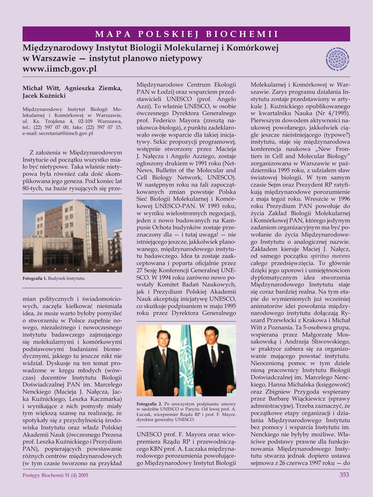 MAPA POLSKIEJ BIOCHEMII Międzynarodowy Instytut Biologii Molekularnej i Komórkowej w Warszawie — instytut planowo nietypowy www.iimcb.gov.pl Michał Witt, Agnieszka Ziemka, Jacek Kuźnicki Międzynarodowy Instytut Biologii Molekularnej i Komórkowej w Warszawie, ul. Ks. Trojdena 4, 02-109 Warszawa, tel.: (22) 597 07 00, faks: (22) 597 07 15, e-mail: [email protected] Z założenia w Międzynarodowym Instytucie od początku wszystko miało być nietypowe. Taka właśnie nietypowa była również cała dość skomplikowana jego geneza. Pod koniec lat 80-tych, na bazie rysujących się prze- Fotografia 1. Budynek Instytutu. mian politycznych i świadomościowych, zaczęła kiełkować nieśmiała idea, że może warto byłoby pomyśleć o stworzeniu w Polsce zupełnie nowego, niezależnego i nowoczesnego instytutu badawczego zajmującego się molekularnymi i komórkowymi podstawowymi badaniami biomedycznymi, jakiego tu jeszcze nikt nie widział. Dyskusje na ten temat prowadzone w kręgu młodych (wówczas) docentów Instytutu Biologii Doświadczalnej PAN im. Marcelego Nenckiego (Macieja J. Nałęcza, Jacka Kuźnickiego, Leszka Kaczmarka) i wynikające z nich pomysły miały tym większą szansę na realizację, że spotykały się z przychylnością środowiska Instytutu oraz władz Polskiej Akademii Nauk (ówczesnego Prezesa prof. Leszka Kuźnickiego i Prezydium PAN), popierających powstawanie różnych centrów międzynarodowych (w tym czasie tworzono na przykład Postępy Biochemii 51 (4) 2005 Międzynarodowe Centrum Ekologii PAN w Łodzi) oraz wsparciem przedstawicieli UNESCO (prof. Angelo Azzi). To właśnie UNESCO, w osobie ówczesnego Dyrektora Generalnego prof. Federico Mayora (zresztą naukowca-biologa), z punktu zadeklarowało swoje wsparcie dla takiej inicjatywy. Szkic propozycji programowej, wstępnie stworzony przez Macieja J. Nałęcza i Angelo Azziego, zostaje ogłoszony drukiem w 1991 roku (NetNews, Bulletin of the Molecular and Cell Biology Network, UNESCO). W następnym roku na fali zapoczątkowanych zmian powstaje Polska Sieć Biologii Molekularnej i Komórkowej UNESCO-PAN. W 1993 roku, w wyniku wielostronnych negocjacji, jeden z nowo budowanych na Kampusie Ochota budynków zostaje przeznaczony dla — i tutaj uwaga! — nie istniejącego jeszcze, jakkolwiek planowanego, międzynarodowego instytutu badawczego. Idea ta zostaje zaakceptowana i poparta oficjalnie przez 27 Sesję Konferencji Generalnej UNESCO. W 1994 roku zarówno nowo powstały Komitet Badań Naukowych, jak i Prezydium Polskiej Akademii Nauk akceptują inicjatywę UNESCO, co skutkuje podpisaniem w maju 1995 roku przez Dyrektora Generalnego Fotografia 2. Po uroczystym podpisaniu umowy w siedzibie UNESCO w Paryżu. Od lewej prof. A. Łuczak, wicepremier Rządu RP i prof. F. Mayor, dyrektor generalny UNESCO. UNESCO prof. F. Mayora oraz wicepremiera Rządu RP i przewodniczącego KBN prof. A. Łuczaka międzynarodowego porozumienia powołującego Międzynarodowy Instytut Biologii Molekularnej i Komórkowej w Warszawie. Zarys programu działania Instytutu zostaje przedstawiony w artykule J. Kuźnickiego opublikowanego w kwartalniku Nauka (Nr 4/1995). Pierwszym dowodem aktywności naukowej powołanego, jakkolwiek ciągle jeszcze nieistniejącego (typowe?) instytutu, staje się międzynarodowa konferencja naukowa „New Frontiers in Cell and Molecular Biology” zorganizowana w Warszawie w październiku 1995 roku, z udziałem sław światowej biologii. W tym samym czasie Sejm oraz Prezydent RP ratyfikują międzynarodowe porozumienie z maja tegoż roku. Wreszcie w 1996 roku Prezydium PAN powołuje do życia Zakład Biologii Molekularnej i Komórkowej PAN, którego jedynym zadaniem organizacyjnym ma być powołanie do życia Międzynarodowego Instytutu o analogicznej nazwie. Zakładem kieruje Maciej J. Nałęcz, od samego początku spiritus movens całego przedsięwzięcia. To głównie dzięki jego uporowi i umiejętnościom dyplomatycznym idea stworzenia Międzynarodowego Instytutu staje się coraz bardziej realna. Na tym etapie do wymienionych już wcześniej animatorów idei powołania międzynarodowego instytutu dołączają Ryszard Przewłocki z Krakowa i Michał Witt z Poznania. Ta 5-osobowa grupa, wspierana przez Małgorzatę Mossakowską i Andrzeja Śliwowskiego, w praktyce zabiera się za organizowanie mającego powstać instytutu. Nieocenioną pomoc w tym dziele niosą pracownicy Instytutu Biologii Doświadczalnej im. Marcelego Nenckiego, Hanna Michalska (księgowość) oraz Zbigniew Przygoda wspierany przez Barbarę Wiąckiewicz (sprawy admnistracyjne). Trzeba zaznaczyć, że początkowe etapy organizacji i działania Międzynarodowego Instytutu bez pomocy i wsparcia Instytutu im. Nenckiego nie byłyby możliwe. Właściwe podstawy prawne dla funkcjonowania Międzynarodowego Instytutu stwarza jednak dopiero ustawa sejmowa z 26 czerwca 1997 roku — do 353 tego momentu takie jednostki naukowe o międzynarodowym charakterze w polskim systemie prawnym w ogóle nie istniały. Sejm uchwalił ją głównie dzięki skutecznym staraniom posłów Unii Demokratycznej z Krzysztofem Dołowym na czele. W 1998 roku po raz pierwszy zbiera się powołany Międzynarodowy Komitet Doradczy Instytutu. Dyrektorem tworzonego Instytutu wybrany zostaje Włoch, prof. Angelo Azzi, pracujący na Uniwersytecie w Bernie, zaś jego zastępcami zostają Jacek Kuźnicki i Michał Witt (ten pierwszy decyzją Prezesa PAN pełni faktycznie obowiązki dyrektora). Wreszcie 1 stycznia 1999 roku, po rozwiązaniu Zakładu PAN, swój nareszcie niezależny żywot rozpoczyna Międzynarodowy Instytut Biologii Molekularnej i Komórkowej. Problem w tym, że wtedy jeszcze kadrowo wyposażony wyłącznie w sztab administracyjny, bez pracowników badawczych. Co gorsza, w tamtym momencie jeszcze bez jakichkolwiek funduszy na działalność badawczą, zaledwie z bardzo mglistymi widokami na ich uzyskanie. Stan ten bardzo szybko się zmienia. W tym sa