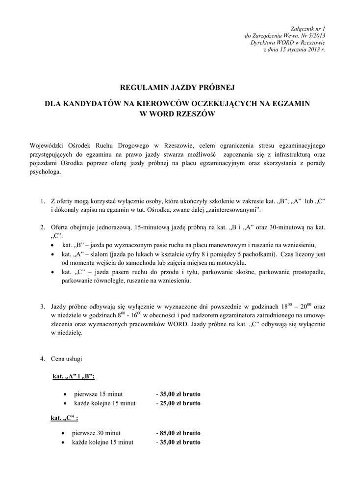 Załącznik nr 1 do Zarządzenia Wewn. Nr 5/2013 Dyrektora WORD w Rzeszowie z dnia 15 stycznia 2013 r. REGULAMIN JAZDY PRÓBNEJ DLA KANDYDATÓW NA KIEROWCÓW OCZEKUJĄCYCH NA EGZAMIN W WORD RZESZÓW Wojewódzki Ośrodek Ruchu Drogowego w Rzeszowie, celem ograniczenia stresu egzaminacyjnego przystępujących do egzaminu na prawo jazdy stwarza możliwość zapoznania się z infrastrukturą oraz pojazdami Ośrodka poprzez ofertę jazdy próbnej na placu egzaminacyjnym oraz skorzystania z porady psychologa. 1. Z oferty mogą korzystać wyłącznie osoby, które ukończyły szkolenie w zakresie kat. „B”, „A” lub „C” i dokonały zapisu na egzamin w tut. Ośrodku, zwane dalej „zainteresowanymi”. 2. Oferta obejmuje jednorazową, 15-minutową jazdę próbną na kat. „B i „A” oraz 30-minutową na kat. „C”: kat. „B” – jazda po wyznaczonym pasie ruchu na placu manewrowym i ruszanie na wzniesieniu, kat. „A” – slalom (jazda po łukach w kształcie cyfry 8 i pomiędzy 5 pachołkami). Czas liczony jest od momentu wejścia do samochodu lub zajęcia miejsca na motocyklu. kat. „C” – jazda pasem ruchu do przodu i tyłu, parkowanie skośne, parkowanie prostopadłe, parkowanie równoległe, ruszanie na wzniesieniu. 3. Jazdy próbne odbywają się wyłącznie w wyznaczone dni powszednie w godzinach 1800 – 2000 oraz w niedziele w godzinach 800 - 1600 w obecności i pod nadzorem egzaminatora zatrudnionego na umowęzlecenia oraz wyznaczonych pracowników WORD. Jazdy próbne na kat. „C” odbywają się wyłącznie w niedzielę. 4. Cena usługi kat. „A” i „B”: pierwsze 15 minut każde kolejne 15 minut - 35,00 zł brutto - 25,00 zł brutto kat. „C” : pierwsze 30 minut każde kolejne 15 minut - 85,00 zł brutto - 35,00 zł brutto 5. Opłata za jazdę próbną winna być wpłacona na konto WORD w Rzeszowie z dopiskiem „JP”. 6. Pojazdy udostępniane będą zainteresowanym w terminie zgodnym z wcześniejszym zapisem. 7. Zapisy na jazdę próbną prowadzi Dział Szkoleń i BRD tut. Ośrodka, sporządzając listę osób zakwalifikowanych na dany dzień i godzinę, którą przekazuje do Działu AdministracyjnoTechnicznego. 8. Warunkiem przyjęcia zgłoszenia zainteresowanego jest : - okazanie zaświadczenia o wyznaczonym terminie egzaminu, - doręczenie oryginału wpłaty za jazdę próbną, - podpisanie oświadczenia o zapoznaniu się z regulaminem jazdy próbnej, - okazanie dokumentu tożsamości. 9. Pracownik WORD, udostępnia zainteresowanemu plac manewrowy i pojazd w wyznaczonym terminie, po okazaniu przez nią dokumentu potwierdzającego tożsamość (dowód osobisty lub paszport). 10. Zainteresowany zobowiązany jest użytkować pojazd z zachowaniem zasad prawidłowej eksploatacji i stosować się do poleceń odpowiedzialnych pracowników WORD. 11. Dopuszcza się, żeby w trakcie prób zainteresowanemu towarzyszyła jedna osoba. 12. Zmiany terminu lub rezygnacji z jazdy próbnej można dokonać najpóźniej do 2 dni przed wyznaczonym terminem. 13. W przypadku nie zgłoszenia się w wyznaczonym terminie opłata nie podlega zwrotowi. 14. Porady psychologa udzielane są zainteresowanym w każdą środę, w godzinach od 1600 do 1800 w pokoju nr 109, I piętro w tut. Ośrodku. Warunkiem skorzystania z porady jest okazanie zaświadczenia o wyznaczonym terminie egzaminu. 15. WORD ponosi odpowiedzialność za szkody powstałe w czasie korzystania z pojazdu w wyniku jego uszkodzenia bądź utraty pojazdu lub jego części, w zakresie w jakim szkody nie zostały pokryte przez ubezpieczyciela. 16. W sprawach nie uregulowanych niniejszym Regulaminem mają zastosowanie przepisy kodeku cywilnego.