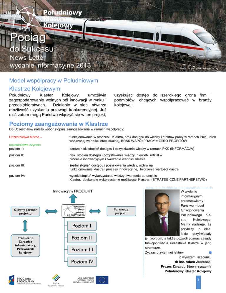 Pociąg do Sukcesu News Letter wydanie informacyjne 2013 http://upload.wikimedia.org źródło:źródło: urbanemusings.wordpress.com Model współpracy w Południowym Klastrze Kolejowym Południowy Klaster Kolejowy umożliwia zagospodarowanie wolnych pól innowacji w rynku i przedsiębiorstwach. Działanie w sieci stwarza możliwość uzyskania przewagi konkurencyjnej. Już dziś zatem mogą Państwo włączyć się w ten projekt, uzyskując dostęp do szerokiego grona firm i podmiotów, chcących współpracować w branży kolejowej.. Poziomy zaangażowania w Klastrze Do Uczestników należy wybór stopnia zaangażowania w ramach współpracy: Uczestnictwo bierne – uczestnictwo czynne: poziom 1: funkcjonowanie w otoczeniu Klastra, brak dostępu do wiedzy i efektów pracy w ramach PKK, brak wnoszonej wartości intelektualnej, BRAK WSPÓŁPRACY = ZERO PROFITÓW bardzo niski stopień dostępu i pozyskiwania wiedzy w ramach PKK (INFORMACJA) poziom II: niski stopień dostępu i pozyskiwania wiedzy, niewielki udział w procesie innowacyjnym i tworzenie wartości klastra poziom III: średni stopień dostępu i pozyskiwania wiedzy, wpływ na funkcjonowanie klastra i procesy innowacyjne, tworzenie wartości klastra poziom IV: wysoki stopień wykorzystania wiedzy, tworzenie potencjału Klastra, doskonałe wykorzystanie możliwości Klastra, (STRATEGICZNE PARTNERSTWO) W wydaniu informacyjnym przedstawiamy Państwu model funkcjonowania Południowego Klastra Kolejowego. Mamy nadzieję, że przybliży to idee, jakie przyświecały jej twórcom, a także pozwoli poznać zasady funkcjonowania uczestnika Klastra w jego strukturze. Życząc przyjemnej lektury Z wyrazami szacunku dr inż. Adam Jabłoński Prezes Zarządu Stowarzyszenia Południowy Klaster Kolejowy 1 Członkowie Klastra mogą realizować swoje cele poprzez cele Klastra: 1. 2. 3. 4. 5. 6. 7. 8. Wspólne działania promocyjne i marketingowe Organizowanie seminariów, warsztatów, wyjazdów studyjnych, udziału w targach, misjach oraz doradztwa dla wszystkich członków Klastra, prowadzenie działalności informacyjnej i promocyjnej oraz podejmowanie innych działań. Utworzenie i prowadzenie systemu informacji i wymiany doświadczeń, służącego nawiązywaniu i rozwijaniu kontaktów naukowych i gospodarczych. Promocję współpracy przedsiębiorstw z sektora kolejowego. Pozyskiwanie środków unijnych w celu finansowania badań, inwestycji, przedsięwzięć wspierających rozwój branży kolejowej. Pozyskiwanie inwestorów krajowych i zagranicznych dla przedsięwzięć z sektora kolejowego, realizowanych przy udziale Klastra. Współpraca z innymi organizacjami krajowymi i zagranicznymi, których cele i zakres działalności pozostają zbieżne z celami i działalnością Klastra. Wymiana doświadczeń w zakresie patentowania innowacji. Miejsce dla Państwa firmy Projekt B Projekt D Klaster Firmy działające w sieci Klastra „mówią tym samym językiem”. Na porozumieniu opieramy współpracę, umożliwiającą osiągnięcie sukcesu. Projekt A Projekt C CZŁONKOWIE POŁUDNIOWEGO KLASTRA KOLEJOWEGO Agencja Rozwoju Lokalnego SA w Sosnowcu Akademia Techniczno-Humanistyczna w Bielsku-Białej CTL Maczki-Bór SA CTL MB Service Sp. z o.o. CTL Rail Sp. z o.o. CZ LOKO Polska Sp. z o.o. EFOE „Cert” Sp. z o.o. Fabryka Przewodów Energetycznych SA Instytut Spawalnictwa Instytut Technik Innowacyjnych EMAG Invest-Eko Sp. z o.o. Katedra Nauki o Materiałach, Wydział Inżynierii Materiałowej i Metalurgii Politechniki Śląskiej Katedra Transportu Uniwersytetu Ekonomicznego w Katowicach Koleje Śląskie Sp. z o.o. Mavex-Rekord Vasuti Jarmu Es Alkatresz Gyarto Forgalmazo Es Ingatlanforgalmazo Korlatolt Felelossegu Tarsasag Sp. z o.o. Oddział w Polsce Ośrodek Badawczo-Rozwojowy Dźwignic i Urządzeń Transportowych „Detrans” OTTIMA plus Sp. z o.o. P.W Paulus Norbert Brodiuk Państwowy Instytut Geologiczny - Państwowy Instytut Badawczy Oddział Górnośląski PHU Gemini Anna Janczak PHU Herma Roman Kabut Polwir Sp. z o.o. PPM Sp. z o.o Przedsiębiorstwo „STOR” Sp. z o.o. Przedsiębiorstwo „UNITOR B” Sp. z o.o. Przedsiębiorstwo Inżynieryjno-Budowlane „Armex” Sp. z o.o. Przedsiębiorstwo Robót Torowych Porębski Andrzej Przedsiębiorstwo Wielobranżowe Koldrex 2 Sped Trans Polska Sp. z o.o. Śląskie Zaplecze Remontowe Sp. z o. o. Torex-Bud Sp. z o.o. Wichary Technologies Sp. z o.o. Zakład Budowlano-Remontowy „Romator” Sp. z o.o. Polskie Stowarzyszenie Telematyki Transportu Euroterminal Sławków Sp. z o.o. RAPZ Sp. z o.o. Zakłady Produkcyjno- Naprawcze Taboru Maszyn i Urządzeń „TABOR” M. Dybowski S. Interesuje Cię współpraca z Klastrem? Skontaktuj się z nami: e-mail: [email protected] tel.: 32 793 71 47 www.klasterkolejowy.com.pl „Utworzenie Klastra Kolejowego” Projekt współfinansowany przez Unię Europejską z Europejskiego Funduszu Rozwoju Regionalnego w ramach Regionalnego Programu Operacyjnego Województwa Śląskiego na lata 2007-2013. Realna odpowiedź na realne potrzeby 2