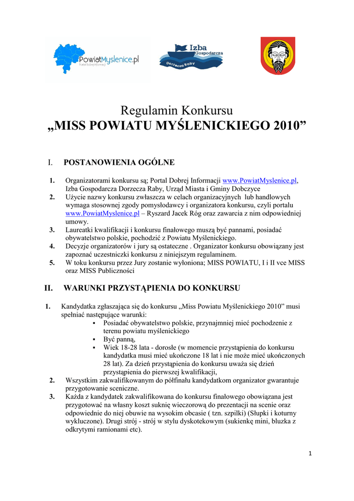 Regulamin Konkursu „MISS POWIATU MYŚLENICKIEGO 2010”