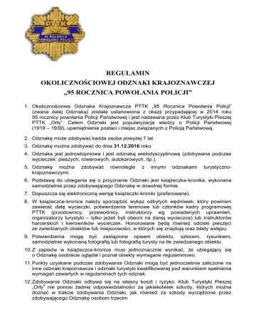 REGULAMIN OKOLICZNOŚCIOWEJ ODZNAKI KRAJOZNAWCZEJ „95 ROCZNICA POWOŁANIA POLICJI” 1. Okolicznościowa Odznaka Krajoznawcza PTTK „95 Rocznica Powołania Policji” (zwana dalej Odznaką) została ustanowiona z okazji przypadającej w 2014 roku 95 rocznicy powołania Policji Państwowej i jest nadawana przez Klub Turystyki Pieszej PTTK „Orły”. Celem Odznaki jest popularyzacja wiedzy o Policji Państwowej (1919 – 1939), upamiętnienie postaci i miejsc związanych z Policją Państwową. 2. Odznakę może zdobywać każda osoba powyżej 7 lat. 3. Odznakę można zdobywać do dnia 31.12.2016 roku 4. Odznaka jest jednostopniowa i jest odznaką wielodyscyplinową (zdobywana podczas wycieczek: pieszych, rowerowych, autokarowych, itp.). 5. Odznakę można krajoznawczymi. zdobywać równolegle z innymi odznakami turystyczno- 6. Podstawą do ubiegania się o przyznanie Odznaki jest książeczka-kronika, wykonana samodzielnie przez zdobywającego Odznakę w dowolnej formie. 7. Dopuszcza się elektroniczną wersję książeczki-kroniki (preferowane). 8. W książeczce-kronice należy sporządzić wykaz odbytych wędrówek, który powinien zawierać datę wycieczki, potwierdzenia terenowe lub członków kadry programowej PTTK (przodownicy, przewodnicy, instruktorzy wg posiadanych uprawnień, organizatorzy turystyki – tylko jeżeli byli obecni na danej wycieczce) lub instruktorów harcerskich i kierowników wycieczek. Honorowane będą również odciski pieczęci ze zwiedzanych obiektów lub miejscowości, w których się znajdują oraz bilety wstępu. 9. Potwierdzenia mogą być zastąpione opisem obiektu, szkicem, rysunkiem, samodzielnie wykonaną fotografią lub fotografią turysty na tle zwiedzanego obiektu. 10. Z zapisów w książeczce-kronice musi jednoznacznie wynikać, że ubiegający się o Odznakę osobiście oglądał i poznał obiekty wymagane regulaminowo. 11. Punkty uzyskane podczas zdobywania Odznaki mogą być jednocześnie zaliczone na inne odznaki krajoznawcze i odznaki turystyki kwalifikowanej pod warunkiem spełnienia wymagań zawartych w regulaminach tych odznak. 12. Zdobywanie Odznaki odbywa się na własny koszt i ryzyko. Klub Turystyki Pieszej „Orły” nie ponosi żadnej odpowiedzialności za jakiekolwiek szkody, których można doznać w trakcie zdobywania Odznaki, jak również za szkody wyrządzone przez zdobywającego Odznakę osobom trzecim 13. Aby zdobyć odznakę należy zwiedzić 5 miejsc związanych z Policja Państwową i obiektów poświęconych pamięci policjantów (pomniki, mogiły, muzea, tablice pamiątkowe, epitafia, itp). Do obiektów zalicza się także miejsca pamięci poświęcone policjantom poległym i pomordowanym na wschodzie w 1940 r. Równoważne z obiektami będzie udział w prelekcjach okolicznościowych oraz zwiedzanie czasowych ekspozycji związanych Policją Państwową, itp. 14. W celu weryfikacji i przyznania Odznaki, książeczkę-kronikę należy przesłać na adres korespondencyjny: Robert Pyśk, 75-350 Koszalin 9, skrytka pocztowa 40 lub drogą elektroniczną na adres: [email protected] 15. Odznaka przyznawana w trybie regulaminowym jest odpłatna. 16. W wyjątkowych przypadkach odznaka na wniosek Zarządu Klubu Turystyki Pieszej „Orły” może zostać nadana honorowo. 17. Interpretacja niniejszego regulaminu należy do Zarządu Klubu Turystyki Pieszej „Orły”. Pomysłodawcą odznaki jest: Robert Pyśk. Regulamin opracował: Robert Pyśk. Wszelkich informacji o odznace udziela kol. Robert Pyśk, tel. 0-792-937-188, e-mail: [email protected] 2