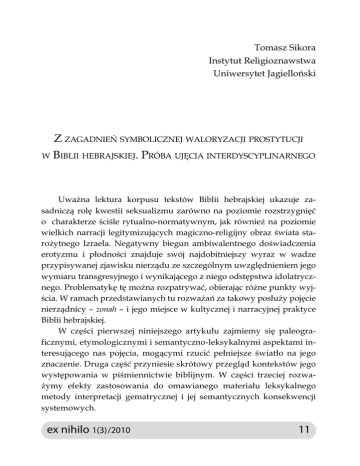 Tomasz Sikora Instytut Religioznawstwa Uniwersytet Jagielloński Z zagadnień symbolicznej waloryzacji prostytucji w Biblii hebrajskiej. Próba ujęcia interdyscyplinarnego Uważna lektura korpusu tekstów Biblii hebrajskiej ukazuje zasadniczą rolę kwestii seksualizmu zarówno na poziomie rozstrzygnięć o charakterze ściśle rytualno-normatywnym, jak również na poziomie wielkich narracji legitymizujących magiczno-religijny obraz świata starożytnego Izraela. Negatywny biegun ambiwalentnego doświadczenia erotyzmu i płodności znajduje swój najdobitniejszy wyraz w wadze przypisywanej zjawisku nierządu ze szczególnym uwzględnieniem jego wymiaru transgresyjnego i wynikającego z niego odstępstwa idolatrycznego. Problematykę tę można rozpatrywać, obierając różne punkty wyjścia. W ramach przedstawianych tu rozważań za takowy posłuży pojęcie nierządnicy – zonah – i jego miejsce w kultycznej i narracyjnej praktyce Biblii hebrajskiej. W części pierwszej niniejszego artykułu zajmiemy się paleograficznymi, etymologicznymi i semantyczno-leksykalnymi aspektami interesującego nas pojęcia, mogącymi rzucić pełniejsze światło na jego znaczenie. Druga część przyniesie skrótowy przegląd kontekstów jego występowania w piśmiennictwie biblijnym. W części trzeciej rozważymy efekty zastosowania do omawianego materiału leksykalnego metody interpretacji gematrycznej i jej semantycznych konsekwencji systemowych. ex nihilo 1(3) /2010 11 Tomasz Sikora Semantyka terminu zonah W ramach zaproponowanej przez Hansa Jensena rekonstrukcji derywacji znaków alfabetu hebrajskiego od form staroegipskiego pisma hieroglificznego1 trzem literom słowa zonah: zajin ( – זz) – nun ( – נn) – he ( – הh) odpowiadają trzy piktogramy: „ozdobna laska” – „wąż” – „postać człowieka z uniesionymi rękami wyrażająca okrzyk radości”. W świetle ideograficznej rekonstrukcji Eliasa Lipinera, opierającego się głównie na tradycji midraszowej i kabalistycznej, wspomnianym znakom hebrajskim odpowiadają kolejno: zajin – „broń”, „miecz”, „strzała”, „lanca”; nun –„ ryba” waloryzowana żeńsko; he – „graficzny znak onomatopeicznego dźwięku wyrażającego uczucia pożądania lub miłości”2. Słownik Reubena Alcalaya w odniesieniu do znaku zajin podaje dodatkową informację, że w znaczeniu wulgarnym litera oznacza membrum virile3. Złożenie wymienionych znaczeń liter w łańcuch składniowy można wyrazić opisowo zdaniem: Miecz/strzała/lanca przebija węża/rybę, czemu towarzyszy okrzyk radości. Komplementarny ciąg uwzględniający seksualny potencjał znaczeniowy omawianych znaków przynosi znaczenie: Członek wnika w pochwę, czemu towarzyszy okrzyk rozkoszy/pożądania. Mityczno-kosmologiczne odczytanie powyższego ciągu znaków uwzględniające mitologemy w rodzaju walki Marduka z Tiamat, Re z Apopisem czy Jahwe z Lewiatanem generowałoby wypowiedź: Porządek zwycięża z chaosem, czemu towarzyszy okrzyk triumfu. Zważywszy na odwzorowanie przytoczonej syntagmy w ideologii monarchicznej, można by ją rozumieć jako zwięzłą formułę rytualnej instytucji hieros gamos. Będący podstawą dla słowa zonah, jako urzeczownikowionej formy imiesłowu czynnego, rdzeń werbalny składający się z tych samych 1 H. Jensen, Die Schrift, Gluckstadt–Hamburg, rys. 187, za: J. Friedrich, Zapomniane pisma i języki, przeł. B.S. Kupść, Warszawa 1958, s. 163. 2 E. Lipiner, Hazon ‘otijot, Jeruszalajim 5759 [1989], s. 434, 452–453, 508–509. Znaczenie tych znaków w egzegezie chasydzkiej wraz z próbą ich interpretacji egzystencjalnej podaje: F. Weinreb, Zahl – Zeichen – Wort. Das symbolische Universum der Bibelsprache, Weiler im Allgäu 1986, s. 66, 68–70. 3 R. Alcalay, Zajin, [w:] idem, The Complete Hebrew-English Dictionary, Jerusalem 1988, s. 663. 12 ex nihilo 1(3) /2010 Z zagadnień symbolicznej waloryzacji prostytucji w Biblii hebrajskiej... znaków z – n – h przynosi ze sobą w różnych trybach koniugacyjnych następujące znaczenia: 1. „popełnić cudzołóstwo”, 2. „być niewiernym w relacji z Bogiem”, 3. „zachęcać do uprawiania cudzołóstwa”. W poszukiwaniu etymologii terminu zonah zwracano się ku zbliżonym w realizacji rdzeniowej słowom, takim jak: arabskie zanā, etiopskie zamawa, zenjat („wypływ nasienia”), tigrijskie zannā („cudzołożyć”) czy akkadyjskie zenû („namiętnie nienawidzić”, „popaść w odszczepieństwo”4. Próbując dociec podstawowego pola semantycznego rdzenia werbalnego z – n – h, Samson Raphael Hirsch, odwołując się do midraszowej metody zestawiania jednostek homojofonicznych, zwraca uwagę na takie rdzenie jak: zajin – nun – chet („odrzucać”, „zbezcześcić”); zajin – waw – nun („podtrzymywać”); jod – zajin – nun („karmić”); sin – nun – ̀alef („nienawidzić”); cade – nun – ́ajin („umocnić”, „ochronić”, „być pokornym, dyskretnym”); samech – nun – he („bronić się”); szin – nun – he („zmieniać się”); cade – nun – he („ogradzać”, „odseparowywać”); szin – nun – alef („lśnić”); cade – nun – chet („uderzyć”, „bić”)5. Wymienione znaczenia w odniesieniu do rdzenia z – n – h przynosiłyby łącznie pole semantyczne wskazujące na coś, co w swoim odrzuceniu i izolacji jest przechowywane w odosobnieniu i co zachowuje atrakcyjną funkcję podtrzymującą i karmiącą, a mimo to spotyka się ze skrajnie negatywnymi reakcjami. Nic dodać, nic ująć, jeśli uznać ten kompleks znaczeniowy za opis zjawiska sakralnej prostytucji. Termin zonah w narracjach Biblii hebrajskiej W tekstach starotestamentowych określenie zonah odnosi się do szeregu różnych postaci6. Przykładowo pojawia się ono w odniesieniu do Tamar (Rdz 38) czy Rachab (Joz 2:1; 6:17, 22, 25). W kontekście tych Zonah, [w:] Wielki słownik hebrajsko-polski 