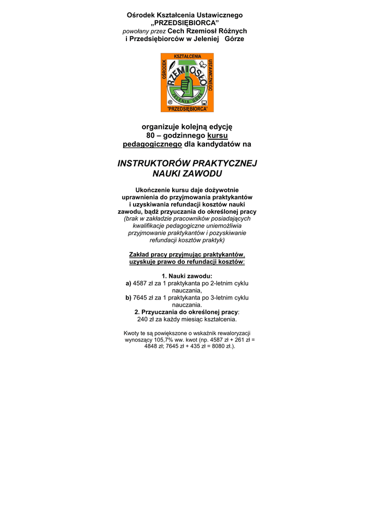 Ośrodek Kształcenia Ustawicznego „PRZEDSIĘBIORCA” powołany przez Cech Rzemiosł RóŜnych i Przedsiębiorców w Jeleniej Górze organizuje kolejną edycję 80 – godzinnego kursu pedagogicznego dla kandydatów na INSTRUKTORÓW PRAKTYCZNEJ NAUKI ZAWODU Ukończenie kursu daje doŜywotnie uprawnienia do przyjmowania praktykantów i uzyskiwania refundacji kosztów nauki zawodu, bądź przyuczania do określonej pracy (brak w zakładzie pracowników posiadających kwalifikacje pedagogiczne uniemoŜliwia przyjmowanie praktykantów i pozyskiwanie refundacji kosztów praktyk) Zakład pracy przyjmując praktykantów, uzyskuje prawo do refundacji kosztów: 1. Nauki zawodu: a) 4587 zł za 1 praktykanta po 2-letnim cyklu nauczania, b) 7645 zł za 1 praktykanta po 3-letnim cyklu nauczania. 2. Przyuczania do określonej pracy: 240 zł za kaŜdy miesiąc kształcenia. Kwoty te są powiększone o wskaźnik rewaloryzacji wynoszący 105,7% ww. kwot (np. 4587 zł + 261 zł = 4848 zł; 7645 zł + 435 zł = 8080 zł.). Program kursu został zatwierdzony przez Kuratora Oświaty i zawiera treści dotyczące wszystkich grup zawodów: • • • • Wybrane zagadnienia z psychologii; Wybrane zagadnienia z pedagogiki; Metodyka praktycznej nauki zawodu ( wraz z praktyką metodyczną ) Podstawy prawne nauki zawodu i zatrudniania młodocianych pracowników. Kurs kończy się egzaminem państwowym. Zajęcia prowadzone są przez doświadczonych wykładowców – praktyków i odbywają się w Jeleniej Górze, w miejscu wskazanym przez Organizatora, po dokonaniu naboru uczestników. Zajęcia realizowane są systemem weekendowym (piątki: 15.30-19.30, soboty: 8.30-15.30). Kurs trwa 5-6 tygodni (5-6 zjazdów piątkowosobotnich), w zaleŜności od jego organizacji - do ustalenia z Uczestnikami. UWAGA! Kurs moŜe być prowadzony systemem zaocznym /dla osób spoza Jeleniej Góry/. Kolejna edycja kursu – w lipcu/sierpniu 2010 r., egzamin planowany jest we wrześniu 2010 r. Wpłata od uczestnika kursu wynosi 700-800 zł /w zaleŜności od liczebności grupy/. W ramach wpłaty: - zajęcia prowadzone na najwyŜszym poziomie, - „Poradnik dla instruktora praktycznej nauki zawodu”; - poczęstunek podczas kaŜdych zajęć. W ramach wpłaty mieści się równieŜ koszt egzaminu. Wszelkie informacje o kursie oraz zgłoszenia udziału – w OKU „Przedsiębiorca” w Jeleniej Górze, ul. J. Tuwima 2, pok. 7 oraz w siedzibie Cechu Rzemiosł RóŜnych i Przedsiębiorców – adres j.w., w godz. 7.00 – 15.00 lub pod numerami: tel./fax: 75 752-42-37; tel.: 75 753-43-53, bądź 506 065 224; oraz na adres e-mail: [email protected] Tadeusz Popowicz – Dyrektor Cechu Rzemiosł RóŜnych i Przedsiębiorców ds. Kształcenia Zawodowego