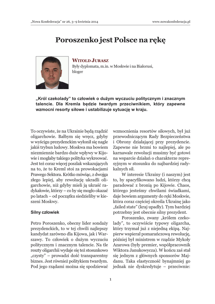 „Nowa Konfederacja” nr 26, 3–9 kwietnia 2014 www.nowakonfederacja.pl Poroszenko jest Polsce na rękę Witold Jurasz Były dyplomata, m.in. w Moskwie i na Białorusi, bloger „Król czekolady” to człowiek o dużym wyczuciu politycznym i znacznym talencie. Dla Kremla będzie twardym przeciwnikiem, który zapewne wzmocni resorty siłowe i ustabilizuje sytuację w kraju. To oczywiste, że na Ukrainie będą rządzić oligarchowie. Bałbym się wręcz, gdyby w wyścigu prezydenckim wyłonił się nagle jakiś trybun ludowy. Moskwa ma bowiem niezmiennie bardzo duże wpływy w Kijowie i mogłaby takiego polityka wykreować. Jest też coraz więcej poszlak wskazujących na to, że to Kreml stoi za prowokacjami Prawego Sektora. Krótko mówiąc, z dwojga złego lepiej, aby rewolucję ukradli oligarchowie, niż gdyby mieli ją ukraść radykałowie, którzy – co by się mogło okazać po latach – od początku siedzieliby w kieszeni Moskwy. wzmocnienia resortów siłowych, był już przewodniczącym Rady Bezpieczeństwa i Obrony działającej przy prezydencie. Zapewne nie brzmi to najlepiej, ale po karnawale rewolucji musimy być gotowi na wsparcie działań o charakterze represyjnym w stosunku do najbardziej radykalnych sił. W interesie Ukrainy (i naszym) jest to, by spacyfikowano ludzi, którzy chcą paradować z bronią po Kijowie. Chaos, którego jesteśmy chwilami świadkami, daje bowiem argumenty do ręki Moskwie, która coraz częściej określa Ukrainę jako „failed state” (kraj upadły). Tym bardziej potrzebny jest obecnie silny prezydent. Poroszenko, zwany „królem czekolady”, to oczywiście typowy oligarcha, który trzymał już z niejedną ekipą. Najpierw wspierał pomarańczową rewolucję, później był ministrem w rządzie Mykoły Azarowa (były premier, współpracownik Wiktora Janukowycza). W końcu zaś stał się jednym z głównych sponsorów Majdanu. Taka elastyczność bynajmniej go jednak nie dyskredytuje – przeciwnie: Silny człowiek Petro Poroszenko, obecny lider sondaży prezydenckich, to w tej chwili najlepszy kandydat zarówno dla Kijowa, jak i Warszawy. To człowiek o dużym wyczuciu politycznym i znacznym talencie. Na tle reszty oligarchii wydaje się też stosunkowo „czysty” – prowadzi dość transparentny biznes. Jest również politykiem twardym. Pod jego rządami można się spodziewać 1 „Nowa Konfederacja” nr 26, 3–9 kwietnia 2014 www.nowakonfederacja.pl jest warunkiem koniecznym, by móc efektywnie rządzić. Co ważne, Petro Poroszenko odczuwa wspólnotę losu z ukraińską oligarchią, która dziś po prostu boi się Rosji. W Kijowie zawsze istniało poczucie, że w zderzeniu z Moskwą ukraińska oligarchia nie ma szans, a już na pewno nie zdołałaby utrzymać wpływów politycznych. Kreml dodatkowo wzmocnił te obawy, zezwalając na to, by na Krymie już teraz dochodziło do przejmowania majątku ukraińskich biznesmenów przez promoskiewskie siły pod wodzą Siergieja Aksjonowa (obecny premier Republiki Krymu). W efekcie tej niezbyt roztropnej polityki Moskwy nawet ludzie z Partii Regionów (dawna formacja Janukowycza) zaczynają się układać z aktualną ekipą w Kijowie. Sygnałem to potwierdzającym jest dla mnie wystawienie Mykhaiła Dobkina jako kandydata na prezydenta. Partia Regionów mogła sięgnąć po znacznie mocniejszych, bardziej rozpoznawalnych kandydatów, wolała jednak wystawić kogoś absolutnie niewybieralnego. Dobkin jako parlamentarzysta zasłynął np. propozycją przeniesienia stolicy z Kijowa do Charkowa, co już samo w sobie powoduje, że ma ogromny elektorat negatywny w zachodniej i centralnej Ukrainie. biona, że raczej nie pociągnie za sobą większości wyborców. Wydaje się zatem, że w wyścigu prezydenckim pojawić się może ktoś jeszcze. Nie jest zresztą pewne, czy do wyborów dojdzie w planowanym terminie, czyli 25 maja. To, czy Rosjanie wejdą na wschodnią Ukrainę, jest tematem na osobny tekst, ale w kontekście wyborów istotne jest to, że nawet nie dokonując interwencji, mogą sabotować ukraińską demokrację na wiele innych sposobów. Po karnawale rewolucji musimy być gotowi na wsparcie działań o charakterze represyjnym w stosunku do najbardziej radykalnych sił Możliwe jest np., że wywołując zamieszki, uniemożliwią przeprowadzenie wyborów we wschodniej części kraju. Mogą starać się podważyć ich ważność tak, aby nie pozwolić ekipie pomajdanowej na wzmocnienie swojej władzy za pomocą mocnego wyborczego mandatu. Możliwe są prowokacje, skandale i protesty wyborcze. Innymi słowy, gra się toczy dalej. Teraz najważniejsze jest pytanie, czy do ewentualnego porozumienia Zachodu z Rosją ws. Ukrainy dojdzie przed, czy po wyborach i jak daleko idący będzie to konsensus. Czy oznaczać on będzie pozostawienie Kijowa w strefie buforowej, czy też wręcz uznanie Ukrainy jako elementu rosyjskiej strefy wpływów. Powyższe rozstrzygnięcie może dla przebiegu wyborów mieć znaczenie nie mniejsze od wewnątrzukraińskiej dynamiki. Rosja gra swoją grę Jeśli Partia Regionów przestanie się liczyć, to Rosja będzie musiała sobie poszukać nowego kandydata. Kimś takim mogłaby być np. Julia Tymoszenko. Jej przeszłość polityczna i biznesowa, a zwłaszcza jej związki z Pawłem Łazarenko (były premier, skazany w USA za defraudację) wyraźnie wskazują na to, że jest postacią bardzo dwuznaczną. Na szczęście jednak Tymoszenko wydaje się politycznie na tyle osła2