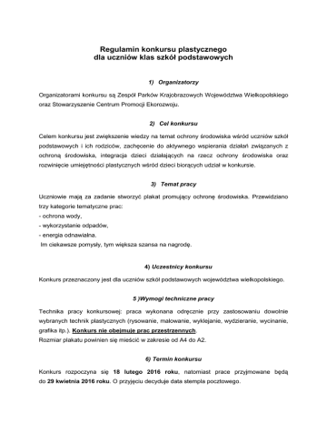 Regulamin konkursu plastycznego dla uczniów klas szkół podstawowych 1) Organizatorzy Organizatorami konkursu są Zespół Parków Krajobrazowych Województwa Wielkopolskiego oraz Stowarzyszenie Centrum Promocji Ekorozwoju. 2) Cel konkursu Celem konkursu jest zwiększenie wiedzy na temat ochrony środowiska wśród uczniów szkół podstawowych i ich rodziców, zachęcenie do aktywnego wspierania działań związanych z ochroną środowiska, integracja dzieci działających na rzecz ochrony środowiska oraz rozwinięcie umiejętności plastycznych wśród dzieci biorących udział w konkursie. 3) Temat pracy Uczniowie mają za zadanie stworzyć plakat promujący ochronę środowiska. Przewidziano trzy kategorie tematyczne prac: - ochrona wody, - wykorzystanie odpadów, - energia odnawialna. Im ciekawsze pomysły, tym większa szansa na nagrodę. 4) Uczestnicy konkursu Konkurs przeznaczony jest dla uczniów szkół podstawowych województwa wielkopolskiego. 5 )Wymogi techniczne pracy Technika pracy konkursowej: praca wykonana odręcznie przy zastosowaniu dowolnie wybranych technik plastycznych (rysowanie, malowanie, wyklejanie, wydzieranie, wycinanie, grafika itp.). Konkurs nie obejmuje prac przestrzennych. Rozmiar plakatu powinien się mieścić w zakresie od A4 do A2. 6) Termin konkursu Konkurs rozpoczyna się 18 lutego 2016 roku, natomiast prace przyjmowane będą do 29 kwietnia 2016 roku. O przyjęciu decyduje data stempla pocztowego. 7) Wymogi formalne uczestnictwa w konkursie Osoby chcące wziąć udział w konkursie mogą zgłosić jedną własnoręcznie przygotowaną pracę. Wszyscy uczestnicy muszą wypełnić formularz zgłoszeniowy, stanowiący załącznik nr 1 do niniejszego regulaminu. Formularz zgłoszeniowy musi zostać podpisany przez prawomocnego opiekuna (opiekunów) uczestnika (tzn. rodziców lub opiekunów prawnych), co stanowić będzie zgodę na udział w konkursie oraz zgodę na postanowienia zawarte w niniejszym regulaminie. Dodatkowo, każda praca musi być opisana na rewersie w następujący sposób: • imię i nazwisko dziecka, • nazwa szkoły i klasa, • tematyka pracy (ochrona wody, wykorzystanie odpadów lub energia odnawialna). Prace nieopisane w powyższy sposób oraz prace, do których nie dołączono podpisanego formularza zgłoszeniowego, nie będą brane pod uwagę. Zgłoszenia (pracę oraz formularz zgłoszeniowy) należy wysłać pocztą lub przesyłką kurierską na następujący adres: Zespół Parków Krajobrazowych Województwa Wielkopolskiego ul. Kościuszki 95, 61-716 Poznań z dopiskiem: Konkurs plastyczny. Możliwe jest również osobiste dostarczenie pracy w miejscu i czasie wskazanych przez organizatorów po uprzednim z nimi tego ustaleniu. Osoba do kontaktu ze strony organizatorów konkursu: Tomasz Michalski, e-mail: [email protected], tel. 61 65 54 656 Prace przesłane po terminie nie będą brane pod uwagę. Organizator nie ponosi odpowiedzialności za uszkodzenia powstałe podczas przesyłki oraz terminowość dostawy prac przez Pocztę Polską lub firmę kurierską. Prace przechodzą na własność organizatora i nie będą odsyłane. 8) Wyłonienie zwycięzców Zwycięzcy konkursu wyłonieni zostaną w maju 2016 roku Komisja konkursowa składająca się z członków Zespołu Parków Krajobrazowych Województwa Wielkopolskiego oraz Stowarzyszenia Centrum Promocji Ekorozwoju spośród zgłoszonych do konkursu prac wybierze trzy najlepsze, w każdym z trzech tematów prac. Ocenie będą podlegać: − pomysł oraz kreatywność twórcy pracy, − estetyka wykonania, − siła przekazu plakatu. Decyzje komisji są ostateczne oraz nieodwołalne. Zwycięzcy poinformowani będą e-mailem lub telefonicznie, zgodnie z danymi kontaktowymi podanymi na formularzu dołączonym do nadesłanej pracy. Lista zwycięzców zostanie opublikowana na stronie internetowej www.zpkww.pl. Prace zostaną wystawione podczas Wielkopolskiego Dnia Ochrony Środowiska, 5 czerwca br. w Ogrodzie Botanicznym UAM w Poznaniu. Tego dnia zostaną także wręczone nagrody zwycięzcom konkursu. 9) Wymogi prawne Na organizatora przechodzą autorskie prawa majątkowe do prac na następujących polach eksploatacji: a) zwielokrotnienie każdą znaną techniką, w szczególności techniką drukarską, fotograficzną, reprograficzną, cyfrową (w tym w drodze skanowania i wydruku cyfrowego), filmową itp.; b) wprowadzenie do obrotu, najem, użyczenie oryginału oraz kopii pracy; c) publiczne wystawienie oraz publiczne udostępnienie pracy. Dane osobowe uczestników będą wykorzystane wyłącznie w celu wyłonienia zwycięzcy i przyznania nagrody. Poprzez podanie danych osobowych oraz podpisanie formularza zgłoszenia uczestnik oraz jego rodzic lub opiekun (przedstawiciel ustawowy uczestnika) wyrażają zgodę na przetwarzanie tych danych przez organizatora w celu wyżej wskazanym oraz opublikowanie imienia i nazwiska uczestnika jako autora pracy. Sprawy nieuregulowane niniejszym regulaminem rozstrzygają organizatorzy konkursu. Organizatorzy zastrzegają sobie prawa do zmian treści regulaminu.
