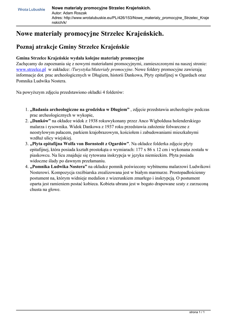 Nowe materiały promocyjne Strzelec Krajeńskich. Autor: Adam Roszak Adres: http://www.wrotalubuskie.eu/PL/426/153/Nowe_materialy_promocyjne_Strzelec_Kraje nskich/k/ Nowe materiały promocyjne Strzelec Krajeńskich. Poznaj atrakcje Gminy Strzelce Krajeńskie Gmina Strzelce Krajeńskie wydała kolejne materiały promocyjne Zachęcamy do zapoznania się z nowymi materiałami promocyjnymi, zamieszczonymi na naszej stronie: www.strzelce.pl w zakładce: /Turystyka/Materiały promocyjne. Nowe foldery promocyjne zawierają informacje dot. prac archeologicznych w Długiem, historii Dankowa, Płyty epitafijnej w Ogardach oraz Pomnika Ludwika Nostera. Na powyższym zdjęciu przedstawiono okładki 4 folderów: 1. „Badania archeologiczne na grodzisku w Długiem” , zdjęcie przedstawia archeologów podczas prac archeologicznych w wykopie, 2. „Danków” na okładce widok z 1938 rokuwykonany przez Anco Wigboldusa holenderskiego malarza i rysownika. Widok Dankowa z 1937 roku przedstawia założenie folwarczne z neostylowym pałacem, parkiem krajobrazowym, kościołem i zabudowaniami mieszkalnymi wzdłuż ulicy wiejskiej. 3. „Płyta epitafijna Wolfa von Bornstedt z Ogardów”. Na okładce folderka zdjęcie płyty epitafijnej, która posiada kształt prostokąta o wymiarach: 177 x 86 x 12 cm i wykonana została w piaskowcu. Na licu znajduje się rytowana inskrypcja w języku niemieckim. Płyta posiada widoczne ślady po dawnym przełamaniu. 4. „Pomnika Ludwika Nostera” na okładce pomnik poświecony wybitnemu malarzowi Ludwikowi Nosterowi. Kompozycja rzeźbiarska zrealizowana jest w białym marmurze. Prostopadłościenny postument na, którym widnieje medalion z wizerunkiem zmarłego i inskrypcją. O postument oparta jest ramieniem postać kobieca. Kobieta ubrana jest w bogato drapowane szaty z zarzuconą chusta na głowe. strona 1 / 1 Powered by TCPDF (www.tcpdf.org)
