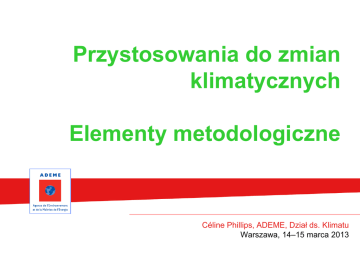 Przystosowania do zmian klimatycznych Elementy metodologiczne Céline Phillips, ADEME, Dział ds. Klimatu Warszawa, 14–15 marca 2013 Dostosowanie Przeszkody, które trzeba pokonać • Niepewność • • • • • • scenariusze klimatyczne wpływy kontekst społeczno-ekonomiczny kontekst polityczny współzależności (klimat, wpływy, kontekst i środki dostosowawcze) Brak jednego celu strategicznego dającego się określić liczbowo • np. ograniczenie emisji gazów cieplarnianych • Aspekt lękowy niektórych wpływów • Odległa perspektywa czasowa 2 1. Analiza podatności • Ocena ogólna • Narażenie i wrażliwość klimatu w przeszłości • dane meteo, dokumenty • wiedza zbiorowa • Narażenie i wrażliwość w przyszłości Wizualizacja zmniejszenia pokrywy śnieżnej w przyszłości w Kolumbi Brytyjskiej. Źródło: CALP, Kanada. • scenariusze klimatyczne • wiedza zbiorowa • • Określenie i klasyfikacja rodzajów narażenia • Wiedza zbiorowa Zgłębienie • Badanie sektorów najbardziej narażonych Schemat skali narażenia i wrażliwości. Źródło: East Midlands, Wielka Brytania 3 2. Łączenie różnych działań dostosowawczych o różnych poziomach trudności 1. Działania krótkoterminowe, „przyrostowe” • • motywowane aktualnym klimatem działania typu „no-regret” • • np. patrzenie na wszystkie działania przez pryzmat klimatu Działania długoterminowe, „transformujące” • • długi okres podejmowania decyzji i wdrażania, np. infrastruktura Konieczność pogłębionej analizy przed podjęciem decyzji • • 3. przynoszące podwójną korzyść nawet, jeśli nie klimat się nie zmieni Włączone do istniejących działań • 2. Ogród w 20. dzielnicy Paryża Badania i projekty pilotażowe Przygotowanie kilku scenariuszy przystosowania W Szampanii winobranie rozpoczyna się średnio dwa tygodnie wcześniej niż 20 lat temu (CICV) Fot. Jean-Luc Demissy Rozwój zdolności do dostosowania • • • uświadamianie, szkolenie, edukacja badania, tworzenie wiedzy monitorowanie i ocena Thames Barrier 3. Przyjęcie elastycznych sposobów podejmowania decyzji – zarządzanie adaptacyjne Ocena Wdrożenie zarządzania Monitoring, ocena Uczenie się Monitoring i ewaluacja są podstawowymi środkami działania i stymulowania nauczania Opracowanie planu działania Wdrożenie planu działania 5