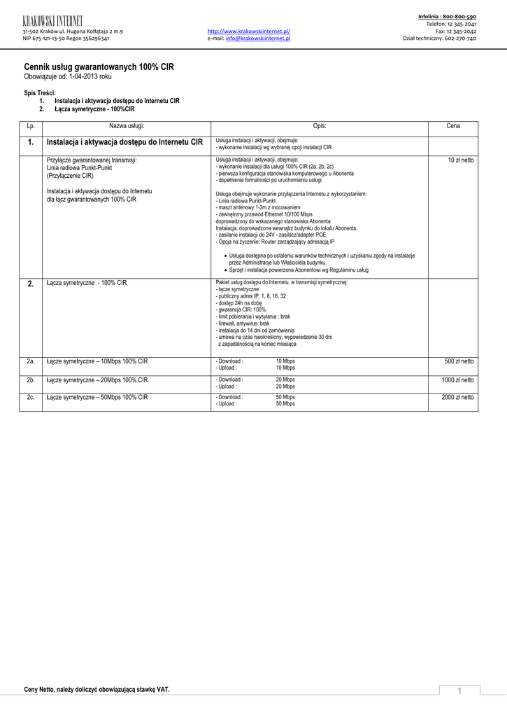 KRAKOWSKI INTERNET 31-502 Kraków ul. Hugona Kołłątaja 2 m.9 NIP 675-121-13-50 Regon 356296341 Infolinia : 800-800-590 Telefon: 12 345-2041 Fax: 12 345-2042 Dział techniczny: 602-270-740 http://www.krakowskiinternet.pl/ e-mail: [email protected] Cennik usług gwarantowanych 100% CIR Obowiązuje od: 1-04-2013 roku Spis Treści: 1. Instalacja i aktywacja dostępu do Internetu CIR 2. Łącza symetryczne - 100%CIR Lp. Nazwa usługi: 1. Instalacja i aktywacja dostępu do Internetu CIR Usługa instalacji i aktywacji, obejmuje: - wykonanie instalacji wg wybranej opcji instalacji CIR Przyłącze gwarantowanej transmisji: Linia radiowa Punkt-Punkt (Przyłączenie CIR) Usługa instalacji i aktywacji, obejmuje: - wykonanie instalacji dla usługi 100% CIR (2a, 2b, 2c) - pierwsza konfiguracja stanowiska komputerowego u Abonenta - dopełnienie formalności po uruchomieniu usługi Instalacja i aktywacja dostępu do Internetu dla łącz gwarantowanych 100% CIR Opis: Cena 10 zł netto Usługa obejmuje wykonanie przyłączenia Internetu z wykorzystaniem: - Linia radiowa Punkt-Punkt - maszt antenowy 1-3m z mocowaniem - zewnętrzny przewód Ethernet 10/100 Mbps doprowadzony do wskazanego stanowiska Abonenta Instalacja, doprowadzona wewnątrz budynku do lokalu Abonenta. - zasilanie instalacji do 24V - zasilacz/adapter POE. - Opcja na życzenie: Router zarządzający adresacją IP Usługa dostępna po ustaleniu warunków technicznych i uzyskaniu zgody na instalacje przez Administracje lub Właściciela budynku. Sprzęt i instalacja powierzona Abonentowi wg Regulaminu usług 2. Łącza symetryczne - 100% CIR Pakiet usług dostępu do Internetu, w transmisji symetrycznej: - łącze symetryczne - publiczny adres IP: 1, 8, 16, 32 - dostęp 24h na dobę - gwarancja CIR: 100% - limit pobierania i wysyłania : brak - firewall, antywirus: brak - instalacja do 14 dni od zamówienia - umowa na czas nieokreślony, wypowiedzenie 30 dni z zapadalnością na koniec miesiąca 2a. Łącze symetryczne – 10Mbps 100% CIR - Download : - Upload : 10 Mbps 10 Mbps 500 zł netto 2b. Łącze symetryczne – 20Mbps 100% CIR - Download : - Upload : 20 Mbps 20 Mbps 1000 zł netto 2c. Łącze symetryczne – 50Mbps 100% CIR - Download : - Upload : 50 Mbps 50 Mbps 2000 zł netto Ceny Netto, należy doliczyć obowiązującą stawkę VAT. 1