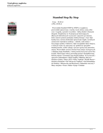 Tytuł główny nagłówka podtytuł nagłówka Stambuł Step By Step Cena: 28.48 zł (-5%) 29.90 zł Przewodnik Stambuł STEP by STEP to wyjątkowy przewodnik opracowany z myślą o tych, którzy cenią sobie czas i wygodę, a przede wszystkim – lubią chodzić własnymi drogami. Znajdziemy tu 16 propozycji interesujących, dłuższych lub krótszych wycieczek i spacerów po mieście, które stanowi pomost pomiędzy kulturą Europy i Azji. Opis każdej trasy zawiera doskonale opracowane mapki, na których zaznaczono największe atrakcje – zabytki, cuda natury i fascynujące punkty widokowe. Opis uwzględnia także miejsca, w których warto się zatrzymać, by spróbować specjałów lokalnej kuchni, zrobić zakupy i poczuć egzotyczną atmosferę miasta. Przewodnik zawiera również bazę miejsc noclegowych i składaną mapę Stambułu, z której można korzystać nawet bez książki. Interesujące teksty pozwalają poznać skomplikowaną historię miasta i zrozumieć jego bogatą kulturę. 16 wycieczek i spacerów Sultanahmet • Hagia Sophia • Błękitny Meczet • dzielnice Galata, Tünel i Pera • Pałac Topkapi • Wielki Bazar • dzielnica Eminönü • Od Taksim do Tophane • Od Dolmabahçe do Ortaköy • Miasteczka nad Bosforem • Sułtańskie meczety • Mury miejskie • Fener i Balat • Eyüp • Üsküdar 1/1 Powered by TCPDF (www.tcpdf.org)
