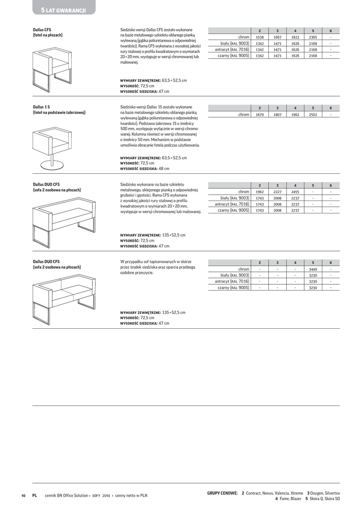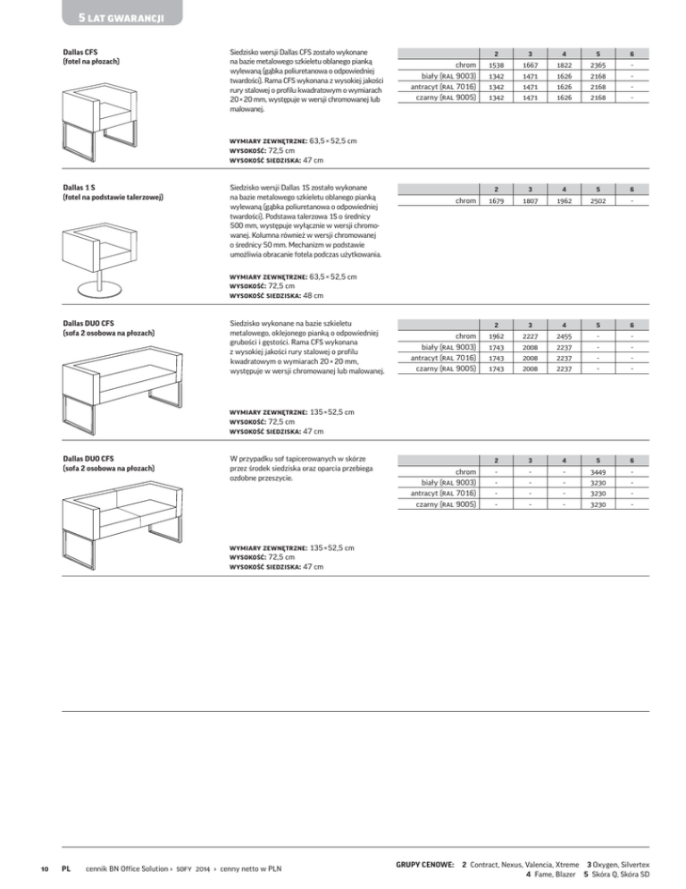5 lat gwarancji Dallas CFS (fotel na płozach) Siedzisko wersji Dallas CFS zostało wykonane na bazie metalowego szkieletu oblanego pianką wylewaną (gąbka poliuretanowa o odpowiedniej twardości). Rama CFS wykonana z wysokiej jakości rury stalowej o profilu kwadratowym o wymiarach 20 × 20 mm, występuje w wersji chromowanej lub malowanej. 2 3 4 5 6 chrom biały (ral 9003) antracyt (ral 7016) czarny (ral 9005) 1538 1342 1342 1342 1667 1471 1471 1471 1822 1626 1626 1626 2365 2168 2168 2168 - 2 3 4 5 6 chrom 1679 1807 1962 2502 - 2 3 4 5 6 chrom biały (ral 9003) antracyt (ral 7016) czarny (ral 9005) 1962 1743 1743 1743 2227 2008 2008 2008 2455 2237 2237 2237 - - 2 3 4 5 6 - - - 3449 3230 3230 3230 - wymiary zewnętrzne: 63,5 × 52,5 cm wysokość: 72,5 cm wysokość siedziska: 47 cm Dallas 1 S (fotel na podstawie talerzowej) Siedzisko wersji Dallas 1S zostało wykonane na bazie metalowego szkieletu oblanego pianką wylewaną (gąbka poliuretanowa o odpowiedniej twardości). Podstawa talerzowa 1S o średnicy 500 mm, występuje wyłącznie w wersji chromowanej. Kolumna również w wersji chromowanej o średnicy 50 mm. Mechanizm w podstawie umożliwia obracanie fotela podczas użytkowania. wymiary zewnętrzne: 63,5 × 52,5 cm wysokość: 72,5 cm wysokość siedziska: 48 cm Dallas DUO CFS (sofa 2 osobowa na płozach) Siedzisko wykonane na bazie szkieletu metalowego, oklejonego pianką o odpowiedniej grubości i gęstości. Rama CFS wykonana z wysokiej jakości rury stalowej o profilu kwadratowym o wymiarach 20 × 20 mm, występuje w wersji chromowanej lub malowanej. wymiary zewnętrzne: 135 × 52,5 cm wysokość: 72,5 cm wysokość siedziska: 47 cm Dallas DUO CFS (sofa 2 osobowa na płozach) W przypadku sof tapicerowanych w skórze przez środek siedziska oraz oparcia przebiega ozdobne przeszycie. chrom biały (ral 9003) antracyt (ral 7016) czarny (ral 9005) wymiary zewnętrzne: 135 × 52,5 cm wysokość: 72,5 cm wysokość siedziska: 47 cm 10 PL cennik BN Office Solution › sofy 2014 › cenny netto w PLN GRUPY CENOWE: 2 Contract, Nexus, Valencia, Xtreme 3 Oxygen, Silvertex 4 Fame, Blazer 5 Skóra Q, Skóra SD
