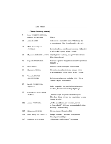 Spis treści 1. Obrazy literatury polskiej 7 11 Beata WALĘCIUK-DEJNEKA, Łukasz A. WAWRYNIUK Wstęp Anna ADAMIEC Tożsamość z okruchów szans. O kobiecej sile w opowiadaniu Elizy Orzeszkowej A… B… C… 21 Maria DŁUGOŁĘCKA-PIETRZAK Bunt jako obrona przed rzeczywistością – kilka słów o bohaterkach prozy Sylwii Chutnik 31 Magdalena DZIUGIEŁ-LAGUNA Aksjologiczne wymiary „innego” w Dziurdziach Elizy Orzeszkowej 45 Bogumiła KACZMAREK Gabriela Zapolska – kapryśna skandalistka przełomu XIX i XX w 55 Iwona MITYK Manuela Gretkowska jako felietonistka 67 Magdalena NIEKRA Niemożność pozbawienia się samego siebie w Kieszonkowym atlasie kobiet Sylwii Chutnik 79 Weronika PAWLIK-KWAŚNIEWSKA Kobieta metaforyczną wariatką. Lejbe i Siora Juliana Ursyna Niemcewicza 87 Brygida PAWŁOWSKA-JĄDRZYK Lolita po polsku. Na przykładzie Dziewczynki z hotelu „Excelsior” Eustachego Rylskiego 97 Grażyna PIETRUSZEWSKA-KOBIELA „Wierszy uczyń miejscem i ruchem oporu”. Mitosfera dzikiej kobiety (na przykładzie wierszy Joanny Mueller) 113 Joanna POSŁUSZNA „Niebo gwiaździste jest wszędzie, nawet w Ravensbrück”. Wojenne wspomnienia hrabiny Karoliny Lanckorońskiej 125 Małgorzata STADNIK Harpie Joanny Chmielewskiej 135 Beata WALĘCIUK-DEJNEKA Święta wiedźma Christiana Skrzyposzka. Wokół powieści Mojra 145 Agnieszka WOJCIESZEK „Niegrzeczne dziewczynki” Reymonta 153 Małgorzata WÓJCIK-DUDEK Dziewczyny i wojna (na podstawie wybranych przykładów literatury dla dzieci i młodzieży) 2. Obrazy literatury obcej 167 Estera GŁUSZKO-BOCZOŃ Przewrotność miłosierdzia, czyli (nie)miłosierne opiekunki. Postacie kobiece na podstawie dramatu Theresii Walser King Kongs Töchter 177 Luiza KARABAN Uwiedzione przez romantyzm i kozaków ukraińskich czyli w poszukiwaniu niegrzecznych dziewczynek w wierszach Tomasza Padurry 185 Dmytro KLYMENKO „Niegrzeczne dziewczynki” Michała Bułhakowa w powieści Mistrz i Małgorzata 199 Joanna KOŁODZIEJCZYK Eskarina Smith: Beyond Socially Established Role Models. Analysis of Combining Feminine Vocation with Masculine Occupation on the Basis of Terry Pratchett’s Egual Rites 209 Ewa KOZAK „Niegrzeczne dziewczynki” w twórczości Mariny i Siergieja Diaczenko 219 Magdalena LANGE-HENSZKE Radosna dekonstrukcja. Les merveilles Claire Castillon 231 Natalia LYZHNIKOVA Nowa „Rosyjska piękność”: o bohaterce powieści Wiktora Jerofiejewa 237 Michał MOLIŃSKI Evil as a Necessary Condition for the Existence of Good – a Reading of Toni Morrison’s Sula 249 Joanna SIEPIETOWSKA A Huli – „niegrzeczna dziewczynka” Wiktora Pielewina 257 Sabina Waleria ŚWITAŁA Andersenowskie bohaterki versus Potwory Grzeczności. Interpretacje 271 Danuta SZYMONIK Miłość kazirodcza. Ada albo Żar. Kronika rodzinna Vladimira Nabokova 281 Lidia URBAŃCZYK Ofeliczność kontra heroiczność – bohaterki współczesnych książek dla dzieci i młodzieży (przykłady z prozy Neila Gaimana i Clive’a Barkera) 295 Łukasz A. WAWRYNIUK Głuptaska w kręgu świętych. O bohaterce powieści Swietłany Wasilenko