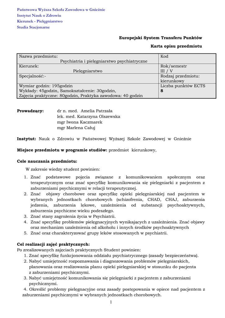 Państwowa Wyższa Szkoła Zawodowa w Gnieźnie Instytut Nauk o Zdrowiu Kierunek - Pielęgniarstwo Studia Stacjonarne Europejski System Transferu Punktów Karta opisu przedmiotu Nazwa przedmiotu: Kod Psychiatria i pielęgniarstwo psychiatryczne Kierunek: Pielęgniarstwo Specjalność:Wymiar godzin: 195godzin Wykłady: 45godzin, Samokształcenie: 30godzin, Zajęcia praktyczne: 80godzin, Praktyka zawodowa: 40 godzin Prowadzący: Rok/semestr III / V Rodzaj przedmiotu: kierunkowy Liczba punktów ECTS 8 dr n. med. Amelia Patrzała lek. med. Katarzyna Olszewska mgr Iwona Kaczmarek mgr Marlena Całuj Instytut: Nauk o Zdrowiu w Państwowej Wyższej Szkole Zawodowej w Gnieźnie Miejsce przedmiotu w programie studiów: przedmiot kierunkowy, Cele nauczania przedmiotu: W zakresie wiedzy student powinien: 1. Znać podstawowe pojęcia związane z komunikowaniem społecznym oraz terapeutycznym oraz znać specyfikę komunikowania się pielęgniarki z pacjentem z zaburzeniami psychicznymi w relacji terapeutycznej. 2. Znać objawy chorobowe oraz specyfikę opieki pielęgniarskiej nad pacjentem w wybranych jednostkach chorobowych (schizofrenia, CHAD, CHAJ, zaburzenia jedzenia, zaburzenia lękowe, uzależnienia od substancji psychoaktywnych, zaburzenia psychiczne wieku podeszłego. 3. Znać stany zagrożenia życia w Psychiatrii. 4. Znać specyfikę problemów pielęgnacyjnych wynikających z uzależnienia. Znać objawy oraz mechanizm uzależnienia od alkoholu i innych środków psychoaktywnych 5. Znać oraz charakteryzować grupy leków stosowanych w psychiatrii. Cel realizacji zajęć praktycznych: Po zrealizowanych zajęciach praktycznych Student powinien: 1. Znać specyfikę funkcjonowania oddziału psychiatrycznego (zasady bezpieczeństwa). 2. Nabyć umiejętność rozpoznawania i diagnozowania problemów pielęgniarskich, planowania oraz realizowania planu opieki pielęgniarskiej w stosunku do pacjenta z zaburzeniami psychicznymi. 3. Nabyć umiejętność komunikowania się pielęgniarki z pacjentem z zaburzeniami psychicznymi. 4. Określić problemy pielęgnacyjne oraz zasady postępowania w opiece nad pacjentem z zaburzeniami psychicznymi w wybranych jednostkach chorobowych. 1 Państwowa Wyższa Szkoła Zawodowa w Gnieźnie Instytut Nauk o Zdrowiu Kierunek - Pielęgniarstwo Studia Stacjonarne 5. Znać aspekty prawne związane z bezpieczeństwem oraz leczeniem farmakologicznym chorych psychiatrycznie. Opis treści kształcenia: 1. Istota i elementy komunikowania społecznego. 2. Zasady relacji oraz kontaktu terapeutycznego z pacjentem z zaburzeniami psychicznymi 3. Zachowania terapeutyczne, nieterapeutyczne oraz bariery w komunikowaniu się z pacjentem z zaburzeniami psychicznymi. 4. Pielęgnowanie pacjenta w wybranych jednostkach chorobowych (schizofrenia, CHAD, CHAJ, zaburzenia jedzenia, zaburzenia lękowe, zależenia, zaburzenia wieku podeszłego) z uwzględnieniem charakterystycznych problemów pielęgnacyjnych, celów opieki i interwencji pielęgniarskich. Opis treści kształcenia (wykłady Psychiatria – klinika) 1. Podstawy psychopatologii: podstawowe pojęcia 2. Najczęstsze choroby psychiczne – objawy, rozpoznawanie, postępowanie (schizofrenia, CHAD, CHAJ, zaburzenia jedzenia, zaburzenia lękowe, zaburzenia osobowości) 3. Zagrożenia życia w psychiatrii. - myśli, tendencje i zamachy samobójcze - zespoły polekowe: zespół neuroleptyczny i zespół serotoninowy 4. Wybrane zaburzenia psychiczne wieku podeszłego: zaburzenia depresyjne, zaburzenia lękowe, psychozy, zespoły otępienne 5. Specyfika psychiatrii dzieci i młodzieży 6. Zaburzenia psychiczne związane z intoksykacją alkoholową i uzależnieniem od alkoholu oraz zaburzenia psychiczne związane z uzależnieniem od innych substancji psychoaktywnych. 7. Zasady farmakoterapii w psychiatrii. Opis treści kształcenia w przebiegu zajęć praktycznych: 1. Zasady bezpieczeństwa na oddziale psychiatrycznym. 2. Zasady zastosowania przymusu bezpośredniego – obowiązki pielęgniarki wchodzącej w skład zespołu terapeutycznego wynikające z ustawy o ochronie zdrowie psychicznego oraz opieka pielęgniarska w stosunku do chorego u którego zastosowano przymus bezpośredni 3. Utrwalenie zasad komunikowania się z pacjentem z zaburzeniami psychicznymi. - zasady relacji terapeutycznej oraz kontaktu z pacjentem z zaburzeniami psychicznymi 4. Pielęgniarska ocena stanu psychicznego chorego z zaburzeniami psychicznymi, ocena stanu psychicznego, wywiad pielęgniarski 5. Rola pielęgniarki w psychoedukacji pacjenta z zaburzeniami psychicznymi oraz jego rodziny. 6. Plan pielęgnacji oraz postępowanie w wybranych chorobach psychicznych. 7. Zagrożenia życia w psychiatrii – postępowanie pielęgniarskie w oddziale psychiatrycznym. - myśli, tendencje i zamachy samobójcze - zespoły polekowe: zespół neuroleptyczny i zespół serotoninowy 2 Państwowa Wyższa Szkoła Zawodowa w Gnieźnie Instytut Nauk o Zdrowiu Kierunek - Pielęgniarstwo Studia Stacjonarne Wymagane wiadomości: Charakterystyka podstawowych pojęć związanych komunikowaniem społecznym. Charakterystyka znaczenia empatii, asertywności i aktywnego słuchania w procesie komunikowania. Charakterystyka faz relacji terapeutycznej. Charakterystyka zachowań terapeutycznych. Charakterystyka barier w komunikowaniu się z pacjentem z zaburzeniami psychicznymi. Charakterystyka opieki pielęgniarskiej nad pacjentem w wybranych jednostkach chorobowych (schizofrenia, CHAD, CHAJ, zaburzenia jedzenia, zaburzenia wieku podeszłego, uzależnienia od substancji psychoaktywnych) z uwzględnieniem charakterystycznych problemów pielęgnacyjnych, celów opieki i interwencji pielęgniarskich. Charakterystyka podstawowych pojąć w psychiatrii Charakterystyka wyszczególnionych jednostek chorobowych Charakterystyka leków stosowanych w psychiatrii (grupy leków) Wymagane wiadomości do realizacji zajęć praktycznych z pielęgniarstwa psychiatrycznego: 1. Specyfika funkcjonowania oddziału p