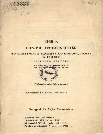 2 - U & rl- 1938 r. L ISTA CZŁONKÓW T O W A R Z Y S T W A Z A C H Ę T Y DO H O D O W L I K O N I W PO LSC E BN. 1 »IA.JA 1938 R O K U C złon k ow ie H onorow i. Lubomirski ks. Stefan, od 1928 r. D elegaci do Sądu Stew ardów . Klarner Jan, od 1936 r. Leśniewski Wiktor, od 1935 r. Morawski Witold pułk., od 1937 r. Poklewski-Koziełł Alfons, od 1936 r. - ^ f~ , y ' j&u m / h j if jjk t f O . (>* / 0 i ^ - 3 - Z arząd T ow arzystw a. Prezes; Komorowski hr. Michał, od 1937 r. Członkowie Zarządu: Anders Władysław gen. bryg., od 1937 r. Berson Michał, od 1937 r. Budny Antoni, od 1937 r. Dzieduszycki hr. Aleksander, od 1937 r. Ender Stefan, od 1937 r. Kronenberg bar. Leopold Jan, od 1937 r. Ledóchowski hr. Aleksander, od 1937 r. Litewski Jan ppłk., od 1937 r. Piniński hr, Władysław, od 1937 r. Walicki Bronisław, od 1937 r. Wężyk Franciszek, od 1937 r. Wodziński Kazimierz, od 1937 r. Zamoyski hr. Władysław, od 1937 r. Żółtowski hr. Andrzej, od 1937 r. K om isja R ew izyjna. Berson Jerzy Falewicz Tadeusz pułk. Janasz Stanisław Kowerski Jan Eustachy Potocki hr, Józef Tarnowski hr, Władysław K om isarze. A nders Władysław gen. bryg. Litewski Jan ppłk. W alicki Bronisław W odziński Kazimierz > . ■ , ■■ ■<'• iśs&a*** C złon k ow ie R zeczyw iści. 1. Alvensleben-Sch6nborn hr. Joachim, od 1925 r., Ostromecko, Pomorze, tel. Fordon 1. 2. Anders Władysław gen. bryg., Dowódca Brygady Kawalerii, od 1935 r., Baranowicze. 3. Berson Jerzy, od 1935 r,, w/m. Flory Nr. 9, tel. Nr. 8-76-70. 4. Berson Michał, od 1908 r., w/m. Flory Nr. 9, tel. Nr. 8-76-70 (m. Leszno, koło Błonia, tel. Nr. 9). 5. Berson Tomasz, od 1930 r., m. Leszno, koło Błonia, tel. Nr. 9. 6. Bielicki Władysław pułk., od 1921 r., m. Szeligi, pocz. Włochy, z- W arszawska. 7. Borzewski Zdzisław, od 1933 r., ni. Długie, pocz. Rypin, tel. Nr. 1-08. 8. Bronikowski Józef K., od 1937 r., maj. Szczypiorno, pocz. Skalmierzyce. 9. Budny Antoni, od 1902 r., m. Bychawa, poczta w miejscu, z. Lubelska. 10. Chłapowski Alfred, od 1920 r., m. Bonikowo, pocz. Koś cian, tel. Nr. 29. 11. Chłapowski Roman, od 1931 r., w/m. Rakowiecka Nr. 39. 12. Cichowski Henryk, od 1929 r., m. Raj, pocz. Solec n/Wisłą. 13. Ciecierski Tadeusz, od 1923 r., m. Ostrożany, pow, Sie miatycze. 14. Czarnecki hr. Stefan, od 1933 r., m. Dobrzyca, pow. Kro toszyn. 15. Czartoryski ks. Olgierd, od 1920 r., m. Sielce, poczta w miejscu, Wielkopolska. 16. Czetwertyński ks. Włodzimierz, od 1937 r., w/m., Hoża 12, tel. 9-25-57. 17. Dachowski Tadeusz, od 1907 r , m. Gumniska, pocz. Tarnów. 18. Daszewski Antoni, od 1891 r , m.Siedzów, pocz. SobienieJeziory, tel. Nr. 6, — 6 - 19. Dąbrowski Stefan, od 1922 r., m. Jeziorki, koło Poznania, tel. Nr. 1. 20. Dembiński Stefan gen., Szef Remontu Koni M. S. Wojsk., od 1935 r., w/m. ul. Karwińska 1, tel. 4-19-85. 21. Dobiecki Zbigniew, od 1934 r., m. Łopu,szno, poczta w miej scu, z Kielecka, tel. Nr. 3. 22. Dowbor Michał, od 1905 r., w/m, Ordynacka Nr 8, tel. Nr. 6-18-29. 23. Drojecki Stefan, od 1920 r., m. Maluszyn, pocz, Siłniczka, tel. Nr. 2. 24. Dwernicki Szczęsny, od 1937 r., Łańcut, Małopolska. 25. Dzieduszycki hr. Aleksander, od 1925 r., Myśliwiecka 10, tel. 9-72-22, 26. Ender Karol, od 1933 r., Łódź, Ał. Kościuszki Nr. 31. 27. Ender Stefan, od 1924 r., m. Moszczenica, poczta w miej scu, woj, Łódzkie, tel. Nr. 4. 28. Falewicz Tadeusz pułk., od 1921 r., Grajewo, 9 pułk Strzel ców Konnych, tel. Nr. 41. 29. Fudakow ski Kazimierz, od 1921 r., w/m. Wiejska 5 m. 2, tel. Nr. 9-62-03. 30. Geyer Gustaw, od 1921 r., Łódź, ul. Piotrkowska, dom własny, tel. Nr. 1-52. 31. Głuchowski Janusz gen. bryg., I Wiceminister Spraw Wojsko wych, od 1936 r.. w/m. Ministerstwo Spraw Wojskowych. 32. Górski Józef, od 1923 r., m. Ceranów, pocz. Sterdyń, woj. Lubelskie. 33. Grabowski Jan, od 1921 r., w/m. Żurawia Nr. 10, teł. Nr. 9-65-40. 34. Grodziński Aleksander, od 1920 r. 35. Gurbski Stanisław, od 1920 r., w/m. Al. Jerozolimskie Nr. 51, „Omega", tel. 9-80-83. 36. Heydel bar. Wojciech, od 1935 r., m. Brzoza, pocz. Gło waczów, teł. Nr, 4. 37. Horodyński Zbigniew, od 1922 r., m. Zbydniów, poczta w miejscu, woj. Lwowskie, tel. Nr. 1. 38. Janasz Stanisław, od 1921 r., w/m. Czackiego Nr. 1, tel. Nr. 2-30-67. 39. Karłowski Stanisław, od 1931 r., m. Szelejewo, poczta w miejscu, pow. Gostyń, tel. Nr. 40. 40. Karnkowski Władysław, od 1923 r,, m. Paski, pocz. Sochaczew. — 7 — 41. Karski Aleksander, od 1923 r., m. Rozkosz, pocz. Biała Podlaska, tel. Nr. 69. 42. Karski Włodzimierz, od 1920 r., w/m. Królewska Nr. 7, tel. Nr. 5-97-60. 43. Karszo-Siedlewski Tadeusz, od 1933 r., w/m. Al. Ujazdow ska Nr. 17, tel. Nr. 9-18-14. 44. Kermenić Oswald, od 1933 r., Łódź, G rand Hotel. 45. Kiełpsz Józef, od 1921 r., m. Sarnowa, poczta w miejscu, woj. Poznańskie, tel. Nr. 35, 46. Kierznowski Stanisław, od 1920 r., m. Szepietowo, pocz. w miejscu, 47. Klarner Jan, od 1934 r , w/m. W arecka Nr. 15, tel. Nr. 2-65-09. 48. Kornecki Zygmunt, od 1921 r., m Bogusławice, pocz. Ko wal, pow. Włocławski, tel. Nr. 25. 49. Komorowski hr. Leon, od 1935 r., m. Siedliska, pocz. Szczekociny, tel. Nr. 14. 50. Komorowski hr. Michał, od 1913 r., w/m. Krakowskie-Przedmieście Nr. 30, tel. Nr. 2-07-30. 51. Kowerski Bronisław, od 1936 r,, w/m. Krucza Nr, 5, tel. Nr. 8-91-91. 52. Kowerski Jan Eustachy, od 1920 r., w/m. Krak -Przedm. 7. m. 19, Nr. 6-68-86, 53. Kronenberg bar. Leopold Jan, od 1913 r., m. Wieniec, pocz. Włocławek, tel. Nr. 11-49. (w/m. Królewska Nr. 15, tel. Nr 6-06-49). 54. Kurnatowski Eryk, od 1911 r., w/m. Smolna 9, 55. Krzymuski Zygmunt, od 1931 r., m. Wierzbie, p. Sompolno. 56. Laskowski Henryk, od 1933 r., m. Wilczyska, poczta Żele chów, woj. Lubelskie. 57. Lasocki Andrzej, od 1921 r, m. Brochów, pow. Sochaczew. 58. Ledóchowski hr. Aleksander, od 1914 r., m. Smordwa, pocz. Młynów, Wołyń, tel. Nr. 6 tow. (w/m. Krakowskie Przedmieście Nr. 5, tel. 205-23). 59.