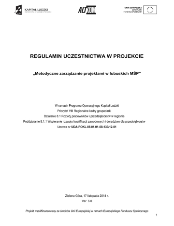 REGULAMIN UCZESTNICTWA W PROJEKCIE „Metodyczne zarządzanie projektami w lubuskich MŚP” W ramach Programu Operacyjnego Kapitał Ludzki Priorytet VIII Regionalne kadry gospodarki Działanie 8.1 Rozwój pracowników i przedsiębiorstw w regionie Poddziałanie 8.1.1 Wspieranie rozwoju kwalifikacji zawodowych i doradztwo dla przedsiębiorstw Umowa nr UDA-POKL.08.01.01-08-139/12-01 Zielona Góra, 17 listopada 2014 r. Ver. 6.0 Projekt współfinansowany ze środków Unii Europejskiej w ramach Europejskiego Funduszu Społecznego 1 §1 PRZEPISY OGÓLNE 1. Regulamin określa warunki rekrutacji i uczestnictwa Uczestników Projektu w ramach projektu „Metodyczne zarządzanie projektami w lubuskich MŚP” realizowanego w ramach Programu Operacyjnego Kapitał Ludzki, Priorytet VIII Regionalne kadry gospodarki, Działanie 8.1 Rozwój pracowników i przedsiębiorstw w regionie, Poddziałanie 8.1.1 Wspieranie rozwoju kwalifikacji zawodowych i doradztwo dla przedsiębiorstw. 2. Projekt jest współfinansowany przez Unię Europejską w ramach Europejskiego Funduszu Społecznego. 3. Wszystkie decyzje podejmowane w oparciu o regulamin są zgodne z umową nr UDA-POKL.08.01.01-08139/12 o dofinansowanie projektu „Metodyczne zarządzanie projektami w lubuskich MŚP” z dnia 6 czerwca 2013 roku, zawartą pomiędzy Altkom Akademia S.A., a Urzędem Marszałkowskim Województwa Lubuskiego 4. Okres realizacji projektu: 01.05.2013 roku – 31.03.2015 roku. 5. Obszar realizacji projektu: województwo lubuskie. §2 SŁOWNIK POJĘĆ Użyte w niniejszym Regulaminie pojęcia oznaczają: 1. Projekt: „Metodyczne zarządzanie projektami w lubuskich MŚP”. 2. Regulamin: należy przez to rozumieć niniejszy Regulamin uczestnictwa w projekcie określający zasady rekrutacji i realizacji Projektu. Regulamin jest dostępny na Stronie internetowej Projektu. 3. Uczestnik Projektu: mikro lub mały lub średni przedsiębiorca mający jednostkę organizacyjną (siedzibę, filię, delegaturę, oddział czy inna prawnie dozwolona formę organizacyjną działalności podmiotu) położoną na terenie województwa lubuskiego oraz jego pracownicy zatrudnieni na podstawie umowy o pracę lub samozatrudnieni, których miejsce pracy lub zamieszkania znajduje się na terenie województwa lubuskiego. 4. Przedsiębiorca: to osoba fizyczna, osoba prawna i jednostka organizacyjna niebędąca osobą prawną, której odrębna ustawa przyznaje zdolność prawną – wykonująca we własnym imieniu działalność gospodarczą. Za przedsiębiorców uznaje się także wspólników spółki cywilnej w zakresie wykonywanej przez nich działalności gospodarczej. (art. 4 Ustawy z dnia 2 lipca 2004 r. o swobodzie działalności gospodarczej; Dz. U. z 2007 r., Nr 155, poz. 1095, z późn. zm.). 5. Pracownik: to osoba zatrudniona na podstawie umowy o pracę, powołania, wyboru, mianowania lub spółdzielczej umowy o pracę (Ustawa z dnia 26 czerwca 1974 r., Kodeks Pracy, tekst jednolity: Dz. U. 1998 r. Nr 21 poz. 94 z póź. zm.). 6. Samozatrudnieni – osoby fizyczne prowadzące działalność gospodarczą, nie zatrudniające pracowników. 7. MŚP – mikro- (w tym samozatrudnieni), małe i średnie przedsiębiorstwa, w rozumieniu art. 4 Ustawy z dnia 2 lipca 2004 r. o swobodzie działalności gospodarczej (Dz. U. z 2007 r., Nr 155, poz. 1095, z późn. zm.). 8. Beneficjent: Altkom Akademia S.A., zwana dalej „Akademią”. 9. Siedziba Beneficjenta: ul. Chłodna 51, 00-867 Warszawa. 10. Biuro Projektu: Zielona Góra, ul. Piaskowa 3c, 65-204 Zielona Góra 11. POKL: Program Operacyjny Kapitał Ludzki. 12. Instytucja Pośrednicząca II stopnia (IP II): Urząd Marszałkowski Województwa Lubuskiego 13. Umowa o dofinansowanie: umowa o dofinansowanie Projektu w ramach Programu Operacyjnego Kapitał Ludzki pt. „Metodyczne zarządzanie projektami w lubuskich MŚP”, nr Umowy UDA-POKL.08.01.01-08139/12. 14. Strona internetowa Projektu – www.altkomakademia.pl/lubuskieprojekty Projekt współfinansowany ze środków Unii Europejskiej w ramach Europejskiego Funduszu Społecznego 2 15. Wykształcenie co najwyżej średnie: wykształcenie podstawowe, gimnazjalne, średnie (liceum, technikum), maturalne, zasadnicze zawodowe §3 CEL PROJEKTU 1. Celem głównym projektu jest wzmocnienie kapitału ludzkiego w 125 MŚP z województwa lubuskiego, które nie korzystały ze wsparcia szkoleniowego EFS w latach 2007-2011, przez dostosowanie kwalifikacji ich 240 pracowników w zakresie metodyki PRINCE2 do potrzeb MŚP. 2. Cel główny zostanie osiągnięty do 30 listopada 2014 r. w województwie lubuskim przez spełnienie celów szczegółowych tj.: a. wzrost (o min. 40%) kompetencji 240 pracowników (40% kobiet; 70% osób z maks. średnim wykształceniem) z MŚP w województwie lubuskim w zakresie ZP, w tym uzyskanie certyfikatu P2F przez min. 216 osób (90% GD) do IIII. 2015; b. wzrost do III.2015 zdolności do prawidłowej realizacji projektów (o min. 30%) w min. 100 MŚP z województwa lubuskiego; c. wzrost samooceny i motywacji zawodowej u min. 180 pracowników MŚP z województwa lubuskiego (min. 75% kobiet i mężczyzn) do III.2015 §4 GRUPA DOCELOWA 1. Grupę docelową stanowią mikro-, małe i średnie przedsiębiorstwa z województwa lubuskiego w tym osoby samozatrudnione posiadające jednostkę organizacyjną (siedzibę, oddział, filię) w woj. lubuskim i ich pracownicy zatrudnieni na podstawie umowy o pracę, zwani dalej Uczestnikami – ogółem 240 osób (w tym 96 kobiet) ze 125 firm. 2. Grupę docelową w projekcie stanowią wyłącznie przedsiębiorstwa, które do czasu ogłoszenia konkursu tj. do 13.08.2012 r. nie korzystały ze wsparcia szkoleniowego udzielanego w ramach EFS w latach 2007-2011. 3. Projekt obejmie wsparciem min. 168 osób z wykształceniem co najwyżej średnim. 4. Projekt obejmie wsparciem min. 96 kobiet. 5. W szkoleniach nie mogą brać udziału osoby zatrudnione na umowy cywilno prawne. §5 ZGŁOSZENIE UCZESTNICTWA 1. Wstępne