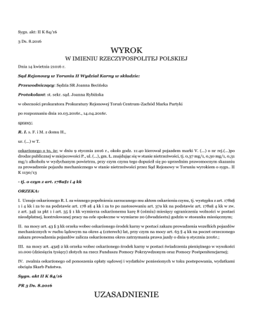 Sygn. akt: II K 84/16 3 Ds. 8.2016 WYROK W IMIENIU RZECZYPOSPOLITEJ POLSKIEJ Dnia 14 kwietnia 21016 r. Sąd Rejonowy w Toruniu II Wydział Karny w składzie: Przewodniczący: Sędzia SR Joanna Becińska Protokolant: st. sekr. sąd. Joanna Rybińska w obecności prokuratora Prokuratury Rejonowej Toruń Centrum-Zachód Marka Partyki po rozpoznaniu dnia 10.03.2016r., 14.04.2016r. sprawy: R. I. s. F. i M. z domu H., ur. (...) w T. oskarżonego o to, że: w dniu 9 stycznia 2016 r., około godz. 11:40 kierował pojazdem marki V. (...) o nr rej.(...)po drodze publicznej w miejscowości P., ul. (...), gm. Ł. znajdując się w stanie nietrzeźwości, tj. 0,37 mg/1, 0,30 mg/1, 0,31 mg/1 alkoholu w wydychanym powietrzu, przy czym czynu tego dopuścił się po uprzednim prawomocnym skazaniu za prowadzenie pojazdu mechanicznego w stanie nietrzeźwości przez Sąd Rejonowy w Toruniu wyrokiem o sygn.. II K 1130/13 - tj. o czyn z art. 178a§1 i 4 kk ORZEKA: I. Uznaje oskarżonego R. I. za winnego popełnienia zarzucanego mu aktem oskarżenia czynu, tj. występku z art. 178a§ 1 i 4 kk i za to na podstawie art. 178 a§ 4 kk i za to po zastosowaniu art. 37a kk na podstawie art. 178a§ 4 kk w zw. z art. 34§ 1a pkt 1 i art. 35 § 1 kk wymierza oskarżonemu karę 8 (ośmiu) miesięcy ograniczenia wolności w postaci nieodpłatnej, kontrolowanej pracy na cele społeczne w wymiarze 20 (dwudziestu) godzin w stosunku miesięcznym; II. na mocy art. 43 § 3 kk orzeka wobec oskarżonego środek karny w postaci zakazu prowadzenia wszelkich pojazdów mechanicznych w ruchu lądowym na okres 4 (czterech) lat, przy czym na mocy art. 63 § 4 kk na poczet orzeczonego zakazu prowadzenia pojazdów zalicza oskarżonemu okres zatrzymania prawa jazdy o dnia 9 stycznia 2016r.; III. na mocy art. 43a§ 2 kk orzeka wobec oskarżonego środek karny w postaci świadczenia pieniężnego w wysokości 10.000 (dziesięciu tysięcy) złotych na rzecz Funduszu Pomocy Pokrzywdzonym oraz Pomocy Postpenitencjarnej; IV. zwalnia oskarżonego od ponoszenia opłaty sądowej i wydatków poniesionych w toku postepowania, wydatkami obciąża Skarb Państwa. Sygn. akt II K 84/16 PR 3 Ds. 8.2016 UZASADNIENIE W dniu 9 stycznia 2016 r. około godziny 11:40 oskarżony R. I. został zatrzymany do kontroli drogowej na drodze publicznej w miejscowości P. przy ul. (...), gm. Ł., prowadząc samochód osobowy marki V. (...) o nr rej. (...). Podczas kontroli R. I. poddano badaniu na obecność alkoholu w wydychanym powietrzu, które przeprowadzono o godzinie 11:43 za pomocą urządzenia elektronicznego A.-Sensor IV CM numer wersji (...), z wynikiem 0,39 mg/l. W związku z powyższym oskarżony R. I. został przewieziony na Komisariat Policji w C. i tam ponownie poddano go badaniom mającym ustalić stan jego trzeźwości. Urządzenie Alkometr A20 nr (...) wykazało u oskarżonego zawartość alkoholu w wydychanym powietrzu tj. 0,30 mg/l (badanie o godzinie 12:17) oraz 0,31 mg/l (badanie o godzinie 12:19). Oskarżonemu odebrano prawo jazdy (nr (...)) i przekazano do dyspozycji dyżurnego KP w C.. dowody: - notatka urzędowa dotycząca zatrzymania oskarżonego w dniu 9 stycznia 2016 r. k. 1-1v, - protokół z przebiegu badania trzeźwości oskarżonego urządzeniem elektronicznym A.-Sensor IV CM numer wersji (...) k. 3-3v, - protokół z przebiegu badania trzeźwości oskarżonego urządzeniem elektronicznym Alkometr A20 nr (...) k. 4-4v, - wyjaśnienia oskarżonego k. 17-18, 25-26, 57v. Oskarżony ma 49 lat. Prowadzi własne gospodarstwo rolne w miejscowości W.. Posiada prawo jazdy kategorii B i T wydane przez starostę (...) (nr (...)), które w dniu 9 stycznia 2016 zostało mu odebrane, a następnie na mocy postanowienia prokuratora Prokuratury Rejonowej T. (...) w T. z dnia 15 stycznia 2016 r. (sygn. akt PR 3 Ds.8.2016) zostało zatrzymane. Oskarżony z zawodu jest blacharzem samochodowym. Utrzymuje się z wykonywania prac dorywczych polegających na naprawie maszyn rolniczych. Jego miesięczne zarobki wynoszą około 1000 zł. Oskarżony oświadczył, że jest właścicielem dwóch samochodów osobowych V. (...) oraz V. (...). Oskarżony pozostaje w związku małżeńskim. Żona posiada prawo jazdy, dojeżdża samodzielnie do pracy do U.. Oskarżony ma 14-letniego syna oraz 9-letnią córkę, która choruje na przewlekłą chorobę w postaci toksokarozy i toksoplazmozy oraz cierpi na niedoczynność tarczycy. Sam leczy się na przewlekłą chorobę w postaci dny moczanowej. Dowody: - protokół przesłuchania oskarżonego k. 16-16v, - wyjaśnienia oskarżonego k. 17-18, 25-26 - postanowienie prokuratora Prokuratury Rejonowej T. (...)w T. z dnia 15 stycznia 2016 r. (sygn. akt PR 3 Ds.8.2016) o zatrzymaniu prawa jazdy k. 27-28, - zaświadczenia lekarskie na okoliczność choroby oskarżonego k. 51-55, - zaświadczenie z dnia 27 stycznia 2016 r. na okoliczność choroby córki oskarżonego k. 56, Oskarżony w chwili popełnienia zarzucanego mu czynu był już karany za występek określony w art. 178a § 1 kk wyrokiem Sądu Rejonowego w Toruniu II Wydział Karny z dnia 22.11.2013 r., sygn. akt II K 1130/13, na mocy którego został skazany na karę trzech miesięcy pozbawienia wolności, której wykonanie na podstawie art. 69 § 1 kk i art. 70 § 1 pkt 1 kk warunkowo zawieszono na okres dwóch lat tytułem próby, a także orzeczono wobec niego środki karne w postaci zakazu prowadzenia wszelkich pojazdów mechanicznych w ruchu lądowym na okres jednego roku i obowiązek świadczenia pieniężnego w wysokości 100 zł na rzecz Funduszu Pomocy Pokrzywdzonym oraz Pomocy Postpenitencjarnej. W dniu 15.01.2014 r. Starosta (...) decyzją nr KD.5430.10.8.2014.JW cofnął oskarżonemu R. I. uprawnienia do kierowania pojazdami mechanicznymi w zakresie kat. A i B od dnia 22.09.2013 r. do dnia 22.09.2014 r. W dniu 23.09.2014 r. Starosta (...) decyzją KD.5430.10.288.2014 D., przywrócił uprawnienia kat. B, T R. I.. Dowody: - informacja o osobie z Krajowego Rejestru