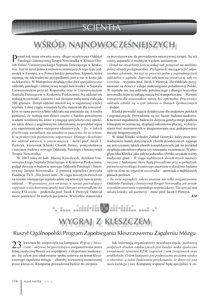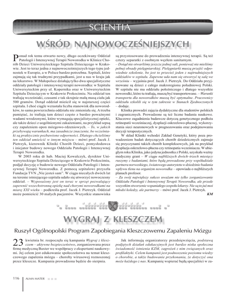 WŚRÓD NAJNOWOCZEŚNIEJSZYCH P onad rok temu otwarto nowy, długo oczekiwany Oddział Patologii i Intensywnej Terapii Noworodka w Klinice Chorób Dzieci Uniwersyteckiego Szpitala Dziecięcego w Krakowie. Jest to teraz jedna z najnowocześniejszych tego typu jednostek w Europie, a w Polsce bardzo potrzebna. Szpitali, które zajmują się tak trudnymi przypadkami, jest u nas w kraju jak na lekarstwo. W Małopolsce działają tylko dwa specjalistyczne oddziały patologii i intensywnej terapii noworodka: w Szpitalu Uniwersyteckim przy ul. Kopernika oraz w Uniwersyteckim Szpitalu Dziecięcym w Krakowie Prokocimiu. Na oddział ten trafiają wcześniaki, czasami z tak skrajnie małą masą ciała jak 500 gramów. Dotąd oddział mieścił się w najstarszej części szpitala. I choć ciągle wzrastała liczba stanowisk dla noworodków, to sama powierzchnia oddziału nie zmieniała się. A trzeba pamiętać, że trafiają tam dzieci często z bardzo poważnymi wadami wrodzonymi, które wymagają specjalistycznej opieki, ale także dzieci z uogólnionymi zakażeniami, na przykład sepsą czy zapaleniem opon mózgowo-rdzeniowych. – To, w jakich przebywają warunkach, ma zasadnicze znaczenie, bo wcześniaki są praktycznie pozbawione odporności. Dlatego chcieliśmy ten oddział umieścić w innym miejscu – mówi prof. Jacek J. Pietrzyk, kierownik Kliniki Chorób Dzieci, pomysłodawca i inicjator budowy nowego Oddziału Patologii i Intensywnej Terapii Noworodka. W 2003 roku dr hab. Maciej Kowalczyk, dyrektor Uniwersyteckiego Szpitala Dziecięcego w Krakowie Prokocimiu, podjął decyzję o budowie nowego Oddziału Patologii i Intensywnej Terapii Noworodka. Z pomocą szpitalowi przyszła Fundacja TVN „Nie jesteś sam”. W ciągu niecałych dwóch lat na terenie istniejącego szpitala udało się utworzyć nowoczesny oddział. – Wyposażony jest on teraz w sprzęt pozwalający zapewnić wszechstronną opiekę nad chorymi noworodkami na miarę XXI wieku – podkreśla prof. Jacek J. Pietrzyk. Oddział może pomieścić 30 małych pacjentów. Wszystkie stanowiska są przystosowane do prowadzenia intensywnej terapii. Są też cztery separatki z osobnym węzłem sanitarnym. – Dotąd nie otwarliśmy jeszcze jednej sali, ponieważ nie mieliśmy pełnej obsady pielęgniarskiej. Pielęgniarki muszą przejść odpowiednie szkolenie, bo jest to przecież jeden z najtrudniejszych oddziałów w szpitalu. Zapewne uda nam się otworzyć tę salę we wrześniu – wyjaśnia prof. Jacek J. Pietrzyk. Do Oddziału przyjmowane są dzieci z całego makroregionu południowej Polski. W szpitalu nie ma oddziału położniczego i dlatego wszystkie noworodki, które tu trafiają, muszą być transportowane. – Warunki transportu dla noworodków muszą być optymalne. Pracownicy oddziału szkolili się w tym zakresie w Stanach Zjednoczonych – dodaje. Klinika prowadzi zajęcia dydaktyczne dla studentów polskich i zagranicznych. Prowadzone są też liczne badania naukowe. Kluczowe zagadnienia badawcze dotyczą genetycznego podłoża retinopatii wcześniaczej, dysplazji oskrzelowo-płucnej, wykorzystania sieci neuronowych w prognozowaniu oraz podejmowaniu decyzji terapeutycznych. W skład Kliniki wchodzi Zakład Genetyki, który poza prowadzeniem badań dotyczących chorób dziedzicznych zajmuje się przyczynami takich chorób kompleksowych, jak na przykład dysplazja oskrzelowo-płucna czy retinopatia wcześniacza. W ubiegłym roku Klinika, jako jedyna jednostka z Polski, uzyskała ważny medyczny grant – W ciągu najbliższych dwóch–trzech miesięcy ruszymy z badaniami, które będą prowadzone przy współudziale partnera norweskiego, światowego autorytetu w dziedzinie badania wpływu tlenu na organizm noworodka – opowiada o najbliższych planach profesor. – Za swój największy sukces uważam nie tylko zorganizowanie Oddziału Patologii i Intensywnej Terapii Noworodka, ale przede wszystkim stworzenie wspaniałego zespołu lekarzy. Nie są to już moi młodsi koledzy, ale partnerzy – mówi prof. Jacek J. Pietrzyk. KM WYGRAJ Z KLESZCZEM Ruszył Ogólnopolski Program Zapobiegania Kleszczowemu Zapaleniu Mózgu 23 kwietnia br. rozpoczęła się kampania Wygraj z kleszczem – aktywne bezpieczeństwo, zorganizowana przez firmę medyczną Baxter we współpracy z ekspertami naukowymi. Jej celem jest edukowanie społeczeństwa na temat kleszczowego zapalenia mózgu – choroby wirusowej roznoszonej przez kleszcze. Kampania prowadzona będzie do sierpnia. 116 ALMA MATER Jak informują organizatorzy przedsięwzięcia, podstawą podjętych działań edukacyjnych jest bardzo niska społeczna świadomość istnienia KZM, zagrożeń z nim związanych oraz profilaktyki. Celem kampanii jest podnoszenie poziomu wiedzy o chorobie, a także budowanie przekonania, że dotyczyć ona może każdego z nas. Kampanię wspierać będą specjaliści w za- kresie chorób zakaźnych: dr Ewa Duszczyk z Kliniki Chorób Zakaźnych Wieku Dziecięcego UM w Warszawie oraz dr hab. Joanna Zajkowska z Kliniki Chorób Zakaźnych i Neuroinfekcji UM w Białymstoku. W ramach kampanii organizowana jest akcja szczepienia, podczas której mieszkańcy dziewięciu miast Polski będą mieli szansę zasięgnąć fachowej porady eksperta, a na tych, którzy zapiszą się na szczepienia za pośrednictwem infolinii nr 801 88 98 90, czekać będą bezpłatne dwie pierwsze dawki szczepionki (liczba bezpłatnych szczepionek jest ograniczona). Infolinia została uruchomiona 6 maja br. i działać będzie w każdy wtorek w godzinach 15–18. Informacje o akcji Wygraj z kleszczem – aktywne bezpieczeństwo oraz o miejscach i datach szczepień podawane są na bieżąco na stronie internetowej programu www.kleszczeinfo.pl. Kleszczowe zapalenie mózgu (KZM) występuje na terenach centralnej i wschodniej Europy oraz w północnej Azji. Jest chorobą wirusową ośrodkowego układu nerwowego. Nosicielem tego wirusa są kleszcze. Zachorować może każdy, kogo 