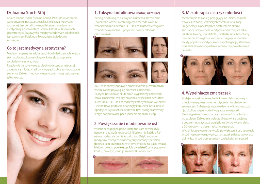 Dr Joanna Stoch-Stój 1. Toksyna botulinowa (Botox, Azzalure) 3. Mezoterapia zastrzyk młodo㶄ci Lekarz Joanna Stoch-Stój ma ponad 19 lat do㶄wiadczenia zawodowego, posiada specjalizacj㶝 lekarza medycyny rodzinnej, jest certyfikowanym lekarzem medycyny estetycznej, absolwentem uczelni GWSH w Katowicach. Uczestniczy w krajowych i mi㶝dzynarodowych szkoleniach, jest członkiem Polskiego Towarzystwa Medycyny Anti-Aging. Zabieg z botulin㶁 to niezwykle skuteczna, bezpieczna i co bardzo wa㶊ne, niechirurgiczna metoda walki ze zmarszczkami!!! Leczenie BOTOX em skutecznie wygładzi zmarszczki mimiczne i przywróci twarzy młodo㶄㶛 oraz 㶄wie㶊o㶄㶛. Mezoterapia to zabieg polegaj㶁cy na iniekcji małych dawek substancji leczniczych w celu rewitalizacji i regeneracji skóry. Poprzez dostarczenie skórze substancji od㶊ywczych w odpowiednie miejsca takie jak skóra twarzy, szyi, dekoltu, po㶄ladki, uda, brzuch czy owłosiona skóra głowy, mo㶊emy osi㶁gn㶁㶛 wspaniałe efekty poprawy kondycji skóry, zapobiega㶛 jej starzeniu oraz zahamowa㶛 wypadanie włosów czy powstawanie cellulitu. 1 Co to jest medycyna estetyczna? Medycyna oparta na zdobyczach i do㶄wiadczeniach lekarzy, stomatologów, kosmetologów, która słu㶊y poprawie wygl㶁du twarzy oraz ciała. Regularnie wykonywane zabiegi medycyny estetycznej zapewniaj㶁 młodszy i zdrowy wygl㶁d, dobre samopoczucie pacjenta. Zabiegi medycyny estetycznej mog㶁 wykonywa㶛 tylko lekarze. 3 BOTOX mo㶊emy podawa㶛 profilaktycznie ju㶊 w młodym wieku, zanim pojawi㶁 si㶝 pierwsze zmarszczki. Toksyn㶁 botulinow㶁 skutecznie wygładzimy zmarszczki czoła, zmarszczki mi㶝dzy brwiami i w k㶁cikach oczu (tzw. kurze łapki). BOTOX em mo㶊emy zmodyfikowa㶛 wysoko㶄㶛 i kształt brwi, podnie㶄㶛 opadni㶝ty koniuszek nosa, unie㶄㶛 opadaj㶁ce k㶁ciki ust, zlikwidowa㶛 tzw. brod㶝 czarownicy, leczy㶛 nadpotliwo㶄㶛 pach, pocenie si㶝 dłoni i stóp. 2. Powi㶝kszanie i modelowanie ust W kanonach pi㶝kna pełne, kształtne usta zawsze były uznawane za wzór kobieco㶄ci. Niestety nie ka㶊d㶁 z Pa㶠 natura obdarzyła pełni㶁 kształtu ust. Dzi㶝ki zabiegom medycyny estetycznej mo㶊na przy pomocy specjalnie do tego celu przeznaczonych wypełniaczy na bazie kwasu hialuronowego powi㶝kszy㶛 lub uwydatni㶛 usta, poprawi㶛 kontur, nawil㶊y㶛, usun㶁㶛 zmarszczki wokół nich. 2 4. Wypełniacze zmarszczek Podaj㶁c wypełniacze na bazie kwasu hialuronowego usieciowanego uzyskuje si㶝 spłycenie i wygładzenie zmarszczek .Substancja wprowadzona w linie zmarszczki i jej okolice, wi㶁㶊e wod㶝 i wygładza zmarszczki. Efekt wypełnienia mo㶊na zaobserwowa㶛 natychmiast po zabiegu. Zabieg nie wył㶁cza długotrwale pacjenta z codziennego 㶊ycia ze wzgl㶝du na błyskawiczny efekt z 2-3 dniowym okresem rekonwalescencji. Wypełniacze stosuje si㶝 w celu powi㶝kszenia ust, usuni㶝cia bruzd nosowo-wargowych, zmarszczek palaczy wokół ust, doliny łez, bruzd poprzecznych czoła, lwiej zmarszczki. 4 5. Volumetria twarzy Lifting wolumetryczny kwasem hialuronowym to metoda na przywrócenie młodzie㶠czego wygl㶁du twarzy. Z ka㶊dym rokiem powstaj㶁 ubytki kwasu hialuronowego, które sprawiaj㶁 㶊e prawidłowy, owalny kształt twarzy zanika daj㶁c efekt zapadni㶝cia si㶝 doliny łez oraz uwidocznienia bruzd nosowo-wargowych. Równie㶊 w okolicach ust powstaj㶁 ubytki, które sprawiaj㶁 㶊e twarz wydaje si㶝 starsza. W okolicach brody powstaj㶁 bruzdy zwane marionetkami a nadmiar skóry w dolnym obr㶝bie twarzy powoduje efekt zwany chomikami. Lifting wolumetryczny to bardzo efektywny zabieg medycyny estetycznej. Natychmiast przywraca twarzy młody wygl㶁d, nie ma konieczno㶄ci czekania na pojawienie si㶝 efektów, nie trzeba wykonywa㶛 te㶊 serii zabiegów. Obj㶝to㶄㶛 policzków, ubytki zostaj㶁 wypełnione. Zabieg nie tylko przywraca kształt twarzy sprzed wielu lat. Efekt liftingu jest natychmiastowy i utrzymuje si㶝 przez okres roku. 6. Aqualyx - liposukcja bez skalpela (lipoliza iniekcyjna) Bez diet, głodówek i chirurgicznego odsysania tłuszczu B㵹D㵿 SZCZUPŁA TAM GDZIE CHCESZ! Aqualyx to roztwór bez fosfatydylocholiny, w którym głównymi, działaj㶁cymi na komórk㶝 tłuszczow㶁 substancjami s㶁 detergenty (typu deoksycholan sodu). Detergent rozpuszcza tłuszcz i niszczy błon㶝 komórkow㶁. Aqualyx wstrzykni㶝ty w tkank㶝 tłuszczow㶁 powoduje niszczenie komórek tłuszczowych, które transportowane s㶁 do w㶁troby i wydalane z organizmu przez nerki. Intralipoterapia preparatem Aqualyx jest: bezbolesna, skuteczna, nieinwazyjna (od 1 do 2 wkłu㶛), szybka. Sprawd㶈 jak łatwo by㶛 pi㶝kn㶁... Ju㶊 dzi㶄 umów si㶝 na bezpłatn㶁 konsultacj㶝 Joanna Stoch-Stój tel. 604 165 744 email: [email protected] piecz㶁tka gabinetu Aqualyx trwale usuwa otłuszczenia. 6 Lekarz Medycyny Estetycznej Joanna Stoch-Stój zaprasza na profesjonalne zabiegi