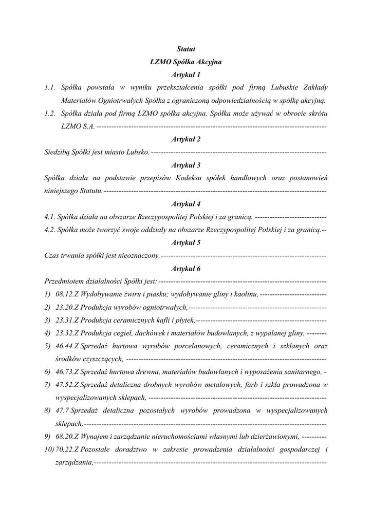 Statut LZMO Spółka Akcyjna Artykuł 1 1.1. Spółka powstała w wyniku przekształcenia spółki pod firmą Lubuskie Zakłady Materiałów Ogniotrwałych Spółka z ograniczoną odpowiedzialnością w spółkę akcyjną. 1.2. Spółka działa pod firmą LZMO spółka akcyjna. Spółka może używać w obrocie skrótu LZMO S.A. --------------------------------------------------------------------------------------------Artykuł 2 Siedzibą Spółki jest miasto Lubsko. ----------------------------------------------------------------------Artykuł 3 Spółka działa na podstawie przepisów Kodeksu spółek handlowych oraz postanowień niniejszego Statutu. -----------------------------------------------------------------------------------------Artykuł 4 4.1. Spółka działa na obszarze Rzeczypospolitej Polskiej i za granicą. ----------------------------4.2. Spółka może tworzyć swoje oddziały na obszarze Rzeczypospolitej Polskiej i za granicą.-Artykuł 5 Czas trwania spółki jest nieoznaczony. ------------------------------------------------------------------Artykuł 6 Przedmiotem działalności Spółki jest: -------------------------------------------------------------------1) 08.12.Z Wydobywanie żwiru i piasku; wydobywanie gliny i kaolinu, --------------------------2) 23.20.Z Produkcja wyrobów ogniotrwałych,-------------------------------------------------------3) 23.31.Z Produkcja ceramicznych kafli i płytek,----------------------------------------------------4) 23.32.Z Produkcja cegieł, dachówek i materiałów budowlanych, z wypalanej gliny, -------5) 46.44.Z Sprzedaż hurtowa wyrobów porcelanowych, ceramicznych i szklanych oraz środków czyszczących, --------------------------------------------------------------------------------6) 46.73.Z Sprzedaż hurtowa drewna, materiałów budowlanych i wyposażenia sanitarnego, 7) 47.52.Z Sprzedaż detaliczna drobnych wyrobów metalowych, farb i szkła prowadzona w wyspecjalizowanych sklepach, -----------------------------------------------------------------------8) 47.7 Sprzedaż detaliczna pozostałych wyrobów prowadzona w wyspecjalizowanych sklepach, -------------------------------------------------------------------------------------------------9) 68.20.Z Wynajem i zarządzanie nieruchomościami własnymi lub dzierżawionymi, ---------10) 70.22.Z Pozostałe doradztwo w zakresie prowadzenia działalności gospodarczej i zarządzania, ---------------------------------------------------------------------------------------------- 11) 72.19.Z Badania naukowe i prace rozwojowe w dziedzinie pozostałych nauk przyrodniczych i technicznych, -----------------------------------------------------------------------12) 74.90.Z Pozostała działalność profesjonalna, naukowa i techniczna, gdzie indziej niesklasyfikowana, -------------------------------------------------------------------------------------13) 78.10.Z Działalność związana z wyszukiwaniem miejsc pracy i pozyskiwaniem pracowników, -------------------------------------------------------------------------------------------14) 78.30.Z Pozostała działalność związana z udostępnianiem pracowników, --------------------15) 81.2 Sprzątanie obiektów,-----------------------------------------------------------------------------16) 82.30.Z Działalność związana z organizacją targów, wystaw i kongresów, ------------------17) 82.99.Z Pozostała działalność wspomagająca prowadzenie działalności gospodarczej, gdzie indziej niesklasyfikowana, ---------------------------------------------------------------------18) 96.09.Z Pozostała działalność usługowa, gdzie indziej niesklasyfikowana. -------------------Artykuł 7 7.1. Kapitał zakładowy Spółki wynosi 893 000,00 zł (osiemset dziewięćdziesiąt trzy tysiące złotych) i dzieli się na 8 930 000 (osiem milionów dziewięćset trzydzieści tysięcy) akcji zwykłych na okaziciela o wartości nominalnej 0,10 zł (dziesięć groszy) każda, w tym:------1) 6.885.000 (sześć milionów osiemset osiemdziesiąt pięć tysięcy) akcji zwykłych na okaziciela serii A, ------------------------------------------------------------------------------2) 1.000.000 (jeden milion) akcji zwykłych na okaziciela serii B, -------------------------3) 1 045 000 (jeden milion czterdzieści pięć tysięcy) akcji zwykłych na okaziciela serii C. 7.2. Kapitał zakładowy może być podwyższony, na podstawie uchwały Walnego Zgromadzenia, w drodze emisji nowych akcji lub podwyższenia wartości nominalnej dotychczasowych akcji. --------------------------------------------------------------------------------7.3. Obniżenie kapitału zakładowego następuje poprzez obniżenie wartości nominalnej akcji lub poprzez umorzenie akcji. ------------------------------------------------------------------------------7.4. Spółka może emitować obligacje, w tym obligacje uprawniające do objęcia akcji emitowanych przez Spółkę w zamian za te obligacje, zwane „obligacjami zamiennymi” lub obligacje z prawem pierwszeństwa. ----------------------------------------------------------------------7.5. Akcjonariusze mają prawo pierwszeństwa do objęcia akcji nowych emisji w stosunku do ilości posiadanych akcji, o ile uchwała Walnego Zgromadzenia nie wyłączy tego prawa. ------Artykuł 8 8.1. Kapitał zakładowy stanowią akcje na okaziciela. ------------------------------------------------8.2. Akcje na okaziciela nie mogą być zamieniane na akcje imienne. ------------------------------- -2- Artykuł 9 9.1. Akcje Spółki mogą być umarzane. ------------------------------------------------------------------9.2. Umorzenie akcji wymaga uchwały Walnego Zgromadzenia. -----------------------------------9.3. Spółka może wydawać w zamian za umorzone akcje świadectwa użytkowe imienne lub na okaziciela.----------------------------------------------------------------------------------------------------Artykuł 10 Organami Spółki są: -----