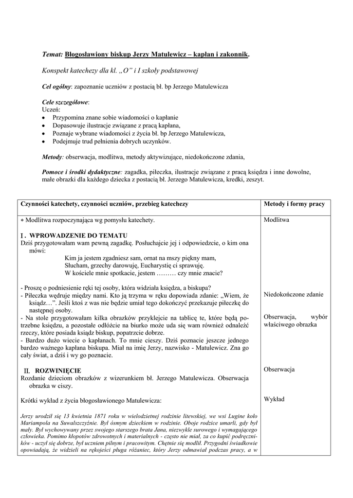Temat: Błogosławiony biskup Jerzy Matulewicz – kapłan i zakonnik. Konspekt katechezy dla kl. „O” i I szkoły podstawowej Cel ogólny: zapoznanie uczniów z postacią bł. bp Jerzego Matulewicza Cele szczegółowe: Uczeń: Przypomina znane sobie wiadomości o kapłanie Dopasowuje ilustracje związane z pracą kapłana, Poznaje wybrane wiadomości z życia bł. bp Jerzego Matulewicza, Podejmuje trud pełnienia dobrych uczynków. Metody: obserwacja, modlitwa, metody aktywizujące, niedokończone zdania, Pomoce i środki dydaktyczne: zagadka, piłeczka, ilustracje związane z pracą księdza i inne dowolne, małe obrazki dla każdego dziecka z postacią bł. Jerzego Matulewicza, kredki, zeszyt. Czynności katechety, czynności uczniów, przebieg katechezy Modlitwa rozpoczynająca wg pomysłu katechety. Metody i formy pracy Modlitwa . WPROWADZENIE DO TEMATU Dziś przygotowałam wam pewną zagadkę. Posłuchajcie jej i odpowiedzcie, o kim ona mówi: Kim ja jestem zgadniesz sam, ornat na mszy piękny mam, Słucham, grzechy darowuję, Eucharystię ci sprawuję. W kościele mnie spotkacie, jestem ……… czy mnie znacie? - Proszę o podniesienie ręki tej osoby, która widziała księdza, a biskupa? - Piłeczka wędruje między nami. Kto ją trzyma w ręku dopowiada zdanie: „Wiem, że ksiądz…”. Jeśli ktoś z was nie będzie umiał tego dokończyć przekazuje piłeczkę do następnej osoby. - Na stole przygotowałam kilka obrazków przyklejcie na tablicę te, które będą potrzebne księdzu, a pozostałe odłóżcie na biurko może uda się wam również odnaleźć rzeczy, które posiada ksiądz biskup, popatrzcie dobrze. - Bardzo dużo wiecie o kapłanach. To mnie cieszy. Dziś poznacie jeszcze jednego bardzo ważnego kapłana biskupa. Miał na imię Jerzy, nazwisko - Matulewicz. Zna go cały świat, a dziś i wy go poznacie. Niedokończone zdanie Obserwacja, wybór właściwego obrazka ROZWINIĘCIE Rozdanie dzieciom obrazków z wizerunkiem bł. Jerzego Matulewicza. Obserwacja obrazka w ciszy. Obserwacja Krótki wykład z życia błogosławionego Matulewicza: Wykład Jerzy urodził się 13 kwietnia 1871 roku w wielodzietnej rodzinie litewskiej, we wsi Lugine koło Mariampola na Suwalszczyźnie. Był ósmym dzieckiem w rodzinie. Oboje rodzice umarli, gdy był mały. Był wychowywany przez swojego starszego brata Jana, niezwykle surowego i wymagającego człowieka. Pomimo kłopotów zdrowotnych i materialnych - często nie miał, za co kupić podręczników - uczył się dobrze, był uczniem pilnym i pracowitym. Chętnie się modlił. Przygodni świadkowie opowiadają, że widzieli na rękojeści pługa różaniec, który Jerzy odmawiał podczas pracy, a w chwilach przeznaczonych na odpoczynek czytał i uczył się. Po kilku latach nauki w gimnazjum (od 1883 r.) zachorował na gruźlicę kości. Musiał posługiwać się kulami. Choroba ta gnębiła go do końca życia. Już w gimnazjum pragnął zostać kapłanem i w 1891 roku, jako dwudziestoletni młodzieniec, wstąpił do Seminarium Duchownego w Kielcach. Wówczas też zmienił swoje nazwisko z Matulaitis na Matulewicz. Zapamiętano go jako kleryka pełnego spokoju, wewnętrznej równowagi, otwartego i pracowitego. Gdy władze carskie zamknęły seminarium, kontynuował naukę w Warszawie, a następnie w Petersburgu. Tu przyjął święcenia kapłańskie 31 grudnia 1898 roku. Postępująca gruźlica kości spowodowała, że musiał poddać się leczeniu w jednym z warszawskich szpitali. Pomimo choroby zwrócił swoją uwagę na ludzi potrzebujących. Po kuracji rozwinął działalność społeczną w Warszawie, zakładając m.in. Stowarzyszenie Robotników Katolickich, redagował czasopismo dla pracowników „Towarzysz Pracy”. Myślał także o dzieciach. Dla nich otworzył przedszkole i gimnazjum na Bielanach. Przygotował też kursy krawieckie dla dziewcząt z okolicy i postanowił otworzyć sierociniec. Dojrzał w nim wówczas zamiar odnowienia i zreformowania zakonu Marianów. 29 sierpnia 1909 roku, w kaplicy biskupiej w Warszawie, złożył śluby zakonne na ręce ostatniego żyjącego marianina ojca Wincentego Sękowskiego- Senkusa. Rok później ułożył nowe konstytucje dla Marianów, którzy odtąd mieli być zgromadzeniem ukrytym. W 1911 roku został generałem zakonu, którym kierował do śmierci. Po zakończeniu działań wojennych ojciec Jerzy powołał Zgromadzenie Sióstr Ubogich Niepokalanego Poczęcia NMP, aby opiekował się sierotami i ubogimi, które szybko rozprzestrzeniło się na Litwie i w Ameryce. Jest też założycielem Zgromadzenia Sióstr Służebnic Jezusa w Eucharystii, które są i w naszej archidiecezji. W październiku 1918 roku Benedykt XV mianował go biskupem wileńskim a w kilka lat później Pius XI - wizytatorem apostolskim na Litwie W ciągu dwu następnych lat nieludzkimi wprost wysiłkami udało mu się zorganizować życie katolickie w tym kraju i naprawić stosunki władz ze Stolicą Apostolską. W trakcie prac nad zatwierdzeniem konkordatu, ojciec Jerzy umarł nagle po nieudanej operacji 27 stycznia 1927 r. Beatyfikowany został przez Jana Pawła II w 1987 roku podczas uroczystości z okazji 600-lecia Chrztu Litwy. Jego relikwie spoczywają w kościele w Mariampolu. Jest jednym z patronów nie tylko Litwy. (stosownie do potrzeb wiekowych wybieramy tylko niektóre z podanych wiadomości z życia błogosławionego; warto też uwrażliwić dzieci, że jest wiele miejsc na Białostocczyźnie, w których bł. Bp Jerzy Matulewicz osobiście bywał obecny; dla tego wieku cenne byłyby wybrane obrazy z komiksu „Jurek, który został biskupem” ) Modlitwa - Podziękujmy Panu Jezusowi, że dał takiego księdza biskupa. Pomódlmy się słowami „Ojcze nasz” Działanie plastyczne PODSUMOWANIE - Za chwilę przeczytam wam kilka zdań. Jeśli to, co usłyszycie jest prawdziwe narysujcie w zeszycie kropkę koloru zielonego. Jeśli będzie to nie prawdziwe kreskę koloru czerwonego. 1