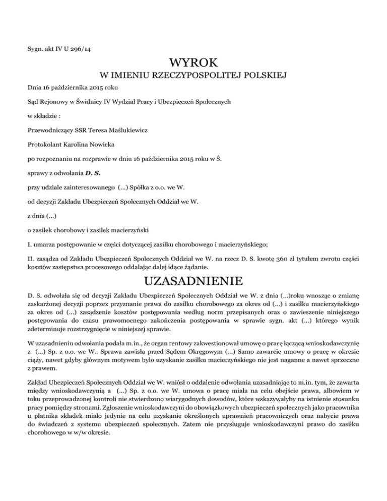 Sygn. akt IV U 296/14 WYROK W IMIENIU RZECZYPOSPOLITEJ POLSKIEJ Dnia 16 października 2015 roku Sąd Rejonowy w Świdnicy IV Wydział Pracy i Ubezpieczeń Społecznych w składzie : Przewodniczący SSR Teresa Maślukiewicz Protokolant Karolina Nowicka po rozpoznaniu na rozprawie w dniu 16 października 2015 roku w Ś. sprawy z odwołania D. S. przy udziale zainteresowanego (...) Spółka z o.o. we W. od decyzji Zakładu Ubezpieczeń Społecznych Oddział we W. z dnia (...) o zasiłek chorobowy i zasiłek macierzyński I. umarza postępowanie w części dotyczącej zasiłku chorobowego i macierzyńskiego; II. zasądza od Zakładu Ubezpieczeń Społecznych Oddział we W. na rzecz D. S. kwotę 360 zł tytułem zwrotu części kosztów zastępstwa procesowego oddalając dalej idące żądanie. UZASADNIENIE D. S. odwołała się od decyzji Zakładu Ubezpieczeń Społecznych Oddział we W. z dnia (...)roku wnosząc o zmianę zaskarżonej decyzji poprzez przyznanie prawa do zasiłku chorobowego za okres od (...) i zasiłku macierzyńskiego za okres od (...) zasądzenie kosztów postępowania według norm przepisanych oraz o zawieszenie niniejszego postępowania do czasu prawomocnego zakończenia postępowania w sprawie sygn. akt (...) którego wynik zdeterminuje rozstrzygnięcie w niniejszej sprawie. W uzasadnieniu odwołania podała m.in., że organ rentowy zakwestionował umowę o pracę łączącą wnioskodawczynię z (...) Sp. z o.o. we W.. Sprawa zawisła przed Sądem Okręgowym (...) Samo zawarcie umowy o pracę w okresie ciąży, nawet gdyby głównym motywem było uzyskanie zasiłku macierzyńskiego nie jest naganne a nawet sprzeczne z prawem. Zakład Ubezpieczeń Społecznych Oddział we W. wniósł o oddalenie odwołania uzasadniając to m.in. tym, że zawarta między wnioskodawczynią a (...) Sp. z o.o. we W. umowa o pracę miała na celu obejście prawa, albowiem w toku przeprowadzonej kontroli nie stwierdzono wiarygodnych dowodów, które wskazywałyby na istnienie stosunku pracy pomiędzy stronami. Zgłoszenie wnioskodawczyni do obowiązkowych ubezpieczeń społecznych jako pracownika u płatnika składek miało jedynie na celu uzyskanie określonych uprawnień pracowniczych oraz nabycie prawa do świadczeń z systemu ubezpieczeń społecznych. Zatem nie przysługuje wnioskodawczyni prawo do zasiłku chorobowego w w/w okresie. W dniu (...) (k 28 – data prezentaty) pełnomocnik powódki rozszerzył żądanie odwołania o odsetki ustawowe liczone od dnia wymagalności każdej z rat świadczenia do dnia zapłaty. Pismem z (...) pełnomocnik powódki cofnął pozew ze zrzeczeniem się roszczenia. Jednocześnie wniósł o zasądzenie od ZUS na rzecz D. S. kwoty (...) zł. tytułem kosztów postępowania, w tym kosztów zastępstwa procesowego według norm przepisanych. Do pisma nie dołączył spisu kosztów uzasadniających żądanie takich kosztów. Podał, że (...) roku organ rentowy wypłacił powódce kwotę (...). tytułem zasiłków: chorobowego i macierzyńskiego za okresy objęte zaskarżoną decyzją. Sąd ustalił: Decyzją z (...) roku organ rentowy odmówił D. S. prawa do zasiłku chorobowego za okres od (...) roku i zasiłku macierzyńskiego za okres od (...) roku w związku z tym, że decyzją z (...) roku nie objęto wnioskodawczyni ubezpieczeniem emerytalnym, rentowym, chorobowym i wypadkowym od dnia (...) Dowód: decyzja z (...)– w aktach ZUS – w zał. Sąd Okręgowy (...) wyrokiem z (...) roku zmienił zaskarżoną decyzję z dnia (...) roku ustalając, że D. S. podlega obowiązkowo ubezpieczeniom: emerytalnemu, rentowemu, chorobowemu i wypadkowemu oraz ubezpieczeniu zdrowotnemu z tytułu zatrudnienia u płatnika składek (...) Sp. z o.o. we W. począwszy od (...) Sąd Apelacyjny (...) wyrokiem z (...) roku oddalił apelację organu rentowego od wyroku Sądu Okręgowego (...) Dowód: wyroki: Sądu Okręgowego (...) Sądu Apelacyjnego (...) - k 29 Sąd zważył: Zgodnie z art. 47713 kpc zmiana przez organ rentowy zaskarżonej decyzji przed rozstrzygnięciem sprawy przez Sąd – przez wydanie decyzji uwzględniającej w całości lub w części żądanie strony – powoduje umorzenie postępowania w całości lub części. Ponieważ organ rentowy (...)roku wypłacił powódce należne jej zasiłki - chorobowy i macierzyński za okres objęty zaskarżoną decyzją – postępowanie w części dotyczącej zasiłków : chorobowego i macierzyńskiego podlegało umorzeniu. Natomiast – w związku z tym, że w piśmie z (...)roku (k38) pełnomocnik powódki rozszerzył żądanie w zakresie kosztów zastępstwa procesowego do kwoty (...) Sąd miał obowiązek orzec merytorycznie w tym zakresie. Zgodnie z art. 98 kpc strona przegrywająca sprawę obowiązana jest zwrócić przeciwnikowi na jego żądanie koszty niezbędne do celowego dochodzenia praw i celowej obrony. Do niezbędnych kosztów procesu strony reprezentowanej przez adwokata zalicza się wynagrodzenie, jednak nie wyższe niż stawki opłat określone w odrębnych przepisach i wydatki jednego adwokata, koszty sądowe oraz koszty nakazanego przez Sąd osobistego stawiennictwa strony. Po myśli §12 ust 2 Rozporządzenia Ministra Sprawiedliwości z dnia 28.09.2002 roku w sprawie opłat za czynności adwokackie oraz ponoszenia przez Skarb Państwa kosztów nieopłaconej pomocy prawnej udzielonej z urzędu (t.j edn. Dz.U. z 2013 r. poz. 461 z późn. zm.) – stawki minimalne wynoszą 60 zł w sprawach o świadczenia pieniężne z ubezpieczenia społecznego i zaopatrzenia emerytalnego. Opłata ta nie może być wyższa niż sześciokrotna stawka minimalna ani przekraczać wartości przedmiotu sporu (§ 2 ust. 2 cyt. Rozporządzenia z 28.09.2002 roku) Rozporządzenie Ministra Sprawiedliwości z 28.09.2002 roku jest przepisem szczególnym o którym mowa w § 4 art. 98 kpc. Oznacza to, że w sprawach z zakresu ubezpieczeń społecznych wynagrodzenie adwokata lub radcy prawnego ustalane jest wyłącznie w oparci