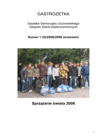 GASTROZETKA Gazetka Samorządu Uczniowskiego Zespołu Szkół Gastronomicznych Numer 1 (5)/2008/2009 (wrzesień) Sprzątanie świata 2008 1 Spis treści: 1. Po wakacjach 2. Nowa szkoła 3. Sprzątanie świata 4. Współpraca ZSG z zagranicą 5. Wolontariat w ZSG 6. Sport – samoobrona 7. Troszkę humoru 8. Kącik kulinarny Wakacje znów będą! Witamy wszystkich po dwumiesięcznej, przez wszystkich wyczekiwanej przerwie w szkole. Na pewno każdy z nas czuje żal, że wakacje minęły tak szybko, ale nim się obejrzymy będzie Boże Narodzenie, Wielkanoc i... klasyfikacja końcoworoczna ;) Serdecznie gratulujemy promocji do kolejnych klas, zdanych poprawek, a niezdane niech będą lekcją, że warto spędzić czas w ciągu roku przy książkach, by później mieć to "z głowy" i móc cieszyć się zupełnie wolnymi dwoma miesiącami... Mamy nadzieje, że wakacje udały się każdemu z Was, że nie było żadnych wypadków i wszyscy są zadowoleni, wypoczęci, zwarci i gotowi do pracy w nowym roku szkolnym. Życzymy wszystkim sukcesów i motywacji do nauki! Byle do czerwca :) [lub do kwietnia, Maturzyści ;)!] Drodzy Pierwszoklasiści! Serdecznie Was witamy w gronie uczniów ZSG. Mamy nadzieję, że nie żałujecie wyboru i podoba Wam się w naszej, teraz wspólnej, szkole. Jeżeli macie żal, że wolne dobiegło końca, to mam dla Was dobrą wiadomość: Tutaj rok szkolny mija tak samo szybko, jak wakacje;) Szkoła organizuje dużo konkursów, myślę, że każdy znajdzie coś dla siebie. Tradycją jest też festyn, który staje się wspaniałą okazją do zabawy, wykazania się talentem zarówno sportowym, kucharskim jak i 2 plastycznym. SKS-y z różnych dziedzin sportu także umilą wolny czas po szkole. Nauczyciele nie są tacy źli, na jakich wyglądają, - są ludźmi i często można z nimi porozmawiać nie tylko na tematy związane z danym przedmiotem, którego uczą. Życzymy sukcesów w nowej szkole, nie zrażajcie się początkami, te mają w zwyczaju być trudne;) N Sprzątanie Świata 2008 Akcja Sprzątanie Świata została wymyślona w 1989 roku w Australii przez biznesmena i żeglarza Iana Kiernana, który chciał poprawić stan Zatoki Sydnejskiej, nad którą mieszkał. W tym celu udało mu się zmobilizować 40 tys. osób, które pracowały społecznie nad oczyszczaniem zatoki z całych ton plastikowych śmieci, butelek, a nawet wraków samochodów. W kolejnych latach akcja zataczała coraz szersze kręgi. Za sprawą mieszkającej w Australii pani Miry StanisławskiejMeysztowicz trafiła również do Polski. Tegoroczne hasło akcji brzmiało Ziemia w Twoich rękach W naszej szkole akcja odbyła się w środę 17 września. Już w poniedziałek, 15 września, w szkole pojawiły się plakaty i informacje na temat akcji przygotowane przez Samorząd Uczniowski. W Sprzątaniu Świata brały udział 4 klasy: 1 La, 1 Lb, 1 Tc, 2 Ta. Łącznie około 80 uczniów, 3 którzy pod opieką nauczycieli: Anny Marciniak, Ewy Świątek, Grażyny Kuczaj i Józefa Pietrzaka porządkowali tereny wokół szkoły (trawniki, boiska). Akcja odbyła się dzięki współpracy Szkolnego Zespołu ds. Promocji Zdrowia i Samorządu Uczniowskiego. Mimo że było to sprzątanie była to także znakomita zabawa i okazja do bliższego poznania się pierwszaków i ich nauczycieli. Mimochodem połączyliśmy przyjemne z pożytecznym. Rok szkolny 2007/2008 bogaty we współpracę z zagranicą Nie pamiętam roku szkolnego w ZSG, który by obfitowałby w tyle spotkań międzynarodowych (w tym głównie z młodzieżą niemiecką) jak ten, który mamy właśnie za sobą. Zespół Szkół Gastronomicznych współpracuje z kilkoma szkołami z zagranicy w tym głównie z placówkami w Niemczech. W ubiegłym roku szkolnym miały miejsce aż dwa siedmiodniowe spotkania młodzieży we Wrocławiu: Październik 2007 (z CJD Olpe k/Essen) Czerwiec 2008 (z KBZ für Riesa k/Drezna). Wymiany te były w głównej mierze dofinansowane przez PNWM (Polsko Niemiecka Współpraca Młodzieży) z główną siedzibą w Poczdamie i Warszawie. Uczniowie naszej szkoły brali również udział w dwóch tygodniowych spotkaniach w Niemczech: „Seminarium Europejskie 4 oraz Dni Sportu z Przygodą”: Wrzesień 2007 (Essen) Czerwiec 2008 (Olpe k/Essen) W spotkaniach tych uczestniczyła młodzież z Polski, Niemiec, Słowacji, Węgier, Rosji oraz Bośni i Hercegowiny. Głównym organizatorem 3 z tych spotkań była p. M. Świercz (nauczyciel j. niemieckiego). Osobom wspomagającym pobyt gości z Niemiec: p. A. Zajchowskiej, p. K. Tomaszewskiej, p. M. Czekiel (Markowskiej), p. A. Łagowskiej oraz p. J. Pietrzakowi serdecznie dziękuję za pomoc. Szczególne podziękowania kieruję do p. Dyrektor Szumilak za wsparcie przy wszelkich trudnościach organizacyjnych. Organizacją czerwcowego wyjazdu do Essen zajmowała się p. B. BobińskaPerechubko. Pisząc o współpracy z zagranicą nie należy też zapomnieć oczywiście o kwietniowym Międzynarodowym Konkursie Czterech Miast Halle-Stadthagen-Tapolca(Węgry)-Wrocław, który to, co roku, odbywa się w kolejnym z wymienionych miejsc. W lutym 2008 kilku uczniów naszej szkoły wraz z p. Dyrektor Szumilak i p. Świercz wzięło również udział w 2-dniowym spotkaniu przygotowawczym dotyczącym realizacji kolejnych wymian. Zdjęcia i komentarze ze spotkań znajdują się w gablocie na 3 piętrze. Zapraszamy do oglądania! A o wrażenia ze spotkań prosimy pytać uczestników Monika Świercz Salon Wolontariatu Pomaganie ludziom jako misja Prelekcją Towarzystwa Pomocy Głuchoniewidomym rozpoczął działalność 19.09.2008 r. Salon Wolontariatu ZSG, prowadzony przez panie profesor Irenę Beker i Krystynę Walczak. Właśnie z inicjatywy 5 pani Ireny Beker i na jej zaproszenie mogliśmy spotkać się z członkami Towarzystwa oraz poznać zasady działalności i cele organizacji założonej w 1991 roku (we Wrocławiu w 1995 r.). Dowiedzieliśmy się, że Towarzystwo wspiera edukację dzieci i zatru