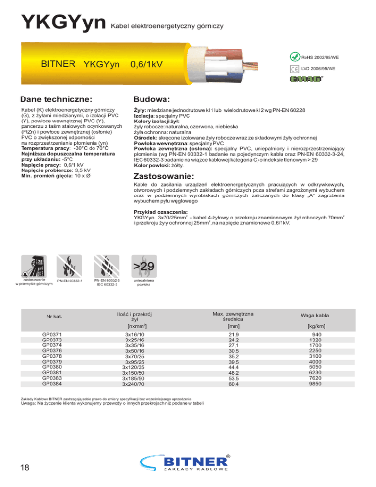 YKGYyn Kabel elektroenergetyczny górniczy BITNER YKGYyn 0,6/1kV RoHS RoHS 2002/95/WE LVD 2006/95/WE Dane techniczne: Budowa: Kabel (K) elektroenergetyczny górniczy (G), z żyłami miedzianymi, o izolacji PVC (Y), powłoce wewnętrznej PVC (Y), pancerzu z taśm stalowych ocynkowanych (FtZn) i powłoce zewnętrznej (osłonie) PVC o zwiększonej odporności na rozprzestrzenianie płomienia (yn) Temperatura pracy: -30°C do 70°C Najniższa dopuszczalna temperatura przy układaniu: -5°C Napięcie pracy: 0,6/1 kV Napięcie probiercze: 3,5 kV Min. promień gięcia: 10 x Ø Żyły: miedziane jednodrutowe kl 1 lub wielodrutowe kl 2 wg PN-EN 60228 Izolacja: specjalny PVC Kolory izolacji żył: żyły robocze: naturalna, czerwona, niebieska żyła ochronna: naturalna Ośrodek: skręcone izolowane żyły robocze wraz ze składowymi żyły ochronnej Powłoka wewnętrzna: specjalny PVC Powłoka zewnętrzna (osłona): specjalny PVC, uniepalniony i nierozprzestrzeniający płomienia (wg PN-EN 60332-1 badanie na pojedynczym kablu oraz PN-EN 60332-3-24, IEC 60332-3 badanie na wiązce kablowej kategoria C) o indeksie tlenowym > 29 Kolor powłoki: żółty. Zastosowanie: Kable do zasilania urządzeń elektroenergetycznych pracujących w odkrywkowych, otworowych i podziemnych zakładach górniczych poza strefami zagrożonymi wybuchem oraz w podziemnych wyrobiskach górniczych zaliczanych do klasy „A” zagrożenia wybuchem pyłu węglowego Przykład oznaczenia: YKGYyn 3x70/25mm2 - kabel 4-żyłowy o przekroju znamionowym żył roboczych 70mm2 2 i przekroju żyły ochronnej 25mm , na napięcie znamionowe 0,6/1kV. >29 zastosowanie w przemyśle górniczym PN-EN 60332-1 Nr kat. GP0371 GP0373 GP0374 GP0376 GP0378 GP0379 GP0380 GP0381 GP0383 GP0384 PN-EN 60332-3 IEC 60332-3 uniepalniona powłoka Ilość i przekrój żył [nxmm2] Max. zewnętrzna średnica [mm] Waga kabla 3x16/10 3x25/16 3x35/16 3x50/16 3x70/25 3x95/25 3x120/35 3x150/50 3x185/50 3x240/70 21,9 24,2 27,1 30,5 35,2 39,5 44,4 48,2 53,5 60,4 940 1320 1700 2250 3100 4000 5050 6230 7620 9850 Zakłady Kablowe BITNER zastrzegają sobie prawo do zmiany specyfikacji bez wcześniejszego uprzedzenia Uwaga: Na życzenie klienta wykonujemy przewody o innych przekrojach niż podane w tabeli ® 18 [kg/km] YKGYyn Kabel elektroenergetyczny górniczy Przekrój żył Rezystancja żył roboczych [mm ] [Ω/km] 10 16 25 35 50 70 95 120 150 185 240 1,83 1,15 0,727 0,524 0,387 0,268 0,193 0,153 0,124 0,099 0,075 2 Indukcyjność jednostkowa [mH/km] 0,28 0,27 0,27 0,26 0,25 0,24 0,24 0,24 0,24 0,24 0,23 Raktancja indukcyjna [Ω/km] Obciążalność długotrwała [A] Obciążalność zwarciowa* [kA] 0,089 0,084 0,084 0,082 0,080 0,077 0,076 0,075 0,074 0,074 0,074 64 86 113 139 173 212 257 294 335 382 448 1,15 1,84 2,88 4,03 5,75 8,05 10,93 13,80 17,25 21,28 27,60 * obciążalność zwarciowa 1 sekundowa, obliczona przy założeniu, że temperatura żył roboczych w chwili zwarcia jest równa temperaturze dopuszczalnej długotrwale 1 2 3 1. Żyła robocza 2. Izolacja 3. Wkładka polwinitowa 4. Składowa żyły ochronnej 5. Izolacja żyły ochronnej 6. Powłoka PVC 7. Osłona 4 5 6 7 ® 19
